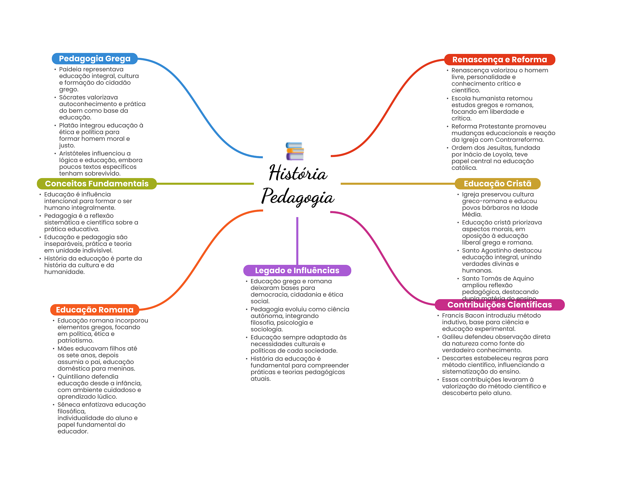 Pedagogia Grega Renascença e Reforma Paideia representava Renascença valorizou homem educação integral, cultura livre, personalidade e e formação do cidadão conhecimento crítico e grego. científico. Sócrates valorizava Escola humanista retomou autoconhecimento e prática estudos gregos e romanos, do bem como base da focando em liberdade e educação. crítica. Platão integrou educação à Reforma Protestante promoveu ética e política para mudanças educacionais e reação formar homem moral e da Igreja com Contrarreforma. justo. Ordem dos Jesuítas, fundada Aristóteles influenciou a por Inácio de Loyola, teve lógica e educação, embora papel central na educação poucos textos específicos tenham sobrevivido. História católica. Conceitos Fundamentais Educação Cristã Educação é influência intencional para formar ser Pedagogia Igreja preservou cultura greco-romana e educou humano integralmente. povos bárbaros na Idade Pedagogia é a reflexão Média. sistemática e científica sobre a Educação cristã priorizava prática educativa. aspectos morais, em Educação e pedagogia são oposição à educação inseparáveis, prática e teoria liberal grega e romana. em unidade indivisível. Santo Agostinho destacou História da educação é parte da educação integral, unindo história da cultura e da verdades divinas e humanidade. Legado e Influências humanas. Educação grega e romana Santo Tomás de Aquino deixaram bases para ampliou reflexão democracia, cidadania e ética pedagógica, destacando social. dupla matéria do ensino Contribuições Científicas Educação Romana Pedagogia evoluiu como ciência autônoma, integrando Francis Bacon introduziu método Educação romana incorporou filosofia, psicologia e indutivo, base para ciência e elementos gregos, focando sociologia. educação experimental. em política, ética e Educação sempre adaptada às Galileu defendeu observação direta patriotismo. necessidades culturais e da natureza como fonte do Mães educavam filhos até políticas de cada sociedade. verdadeiro conhecimento. sete anos, depois assumia pai, educação História da educação é Descartes estabeleceu regras para doméstica para meninas. fundamental para compreender método científico, influenciando a práticas e teorias pedagógicas sistematização do ensino. Quintiliano defendia atuais. Essas contribuições levaram à educação desde a infância, com ambiente cuidadoso e valorização do método científico e aprendizado lúdico. descoberta pelo aluno. Sêneca enfatizava educação filosófica, individualidade do aluno e papel fundamental do educador.