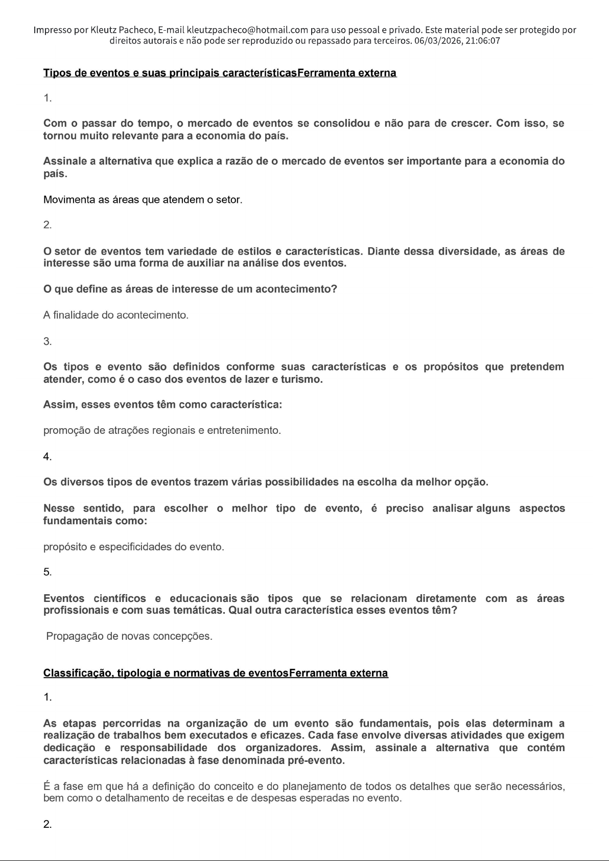 Impresso por Kleutz Pacheco, E-mail para uso pessoal e privado. Este material pode ser protegido por direitos autorais e não pode ser reproduzido ou repassado para terceiros. 06/03/2026, 21:06:07 Tipos de eventos e suas principais características Ferramenta externa 1. Com passar do tempo, mercado de eventos se consolidou e não para de crescer. Com isso, se tornou muito relevante para a economia do país. Assinale a alternativa que explica a razão de mercado de eventos ser importante para a economia do país. Movimenta as áreas que atendem o setor. 2. setor de eventos tem variedade de estilos e características. Diante dessa diversidade, as áreas de interesse são uma forma de auxiliar na análise dos eventos. que define as áreas de interesse de um acontecimento? A finalidade do acontecimento. 3. Os tipos e evento são definidos conforme suas características e os propósitos que pretendem atender, como é caso dos eventos de lazer e turismo. Assim, esses eventos têm como característica: promoção de atrações regionais e entretenimento. 4. Os diversos tipos de eventos trazem várias possibilidades na escolha da melhor opção. Nesse sentido, para escolher melhor tipo de evento, é preciso analisar alguns aspectos fundamentais como: propósito e especificidades do evento. 5. Eventos científicos e educacionais são tipos que se relacionam diretamente com as áreas profissionais e com suas temáticas. Qual outra característica esses eventos têm? Propagação de novas concepções. Classificação, tipologia e normativas de eventos Ferramenta externa 1. As etapas percorridas na organização de um evento são fundamentais, pois elas determinam a realização de trabalhos bem executados e eficazes. Cada fase envolve diversas atividades que exigem dedicação e responsabilidade dos organizadores. Assim, assinale a alternativa que contém características relacionadas à fase denominada pré-evento. É a fase em que há a definição do conceito e do planejamento de todos os detalhes que serão necessários, bem como o detalhamento de receitas e de despesas esperadas no evento. 2.Impresso por Kleutz Pacheco, E-mail para uso pessoal e privado. Este material pode ser protegido por direitos autorais e não pode ser reproduzido ou repassado para terceiros. 06/03/2026, 21:06:07 Todo evento é criado para um público-alvo. É possível afirmar que a definição clara do público a que se destina um evento é indispensável para que: sejam atendidas às expectativas do público e, dessa maneira, alcance os resultados esperados. 3. São muitas terminologias usadas na área de planejamento e organização de eventos. Escolha a opção com conjunto de significados corretos de algumas dessas expressões. Check list: corresponde à lista de itens a serem verificados ou providenciados. Release: texto jornalístico de divulgação. Feedback: possibilita a comparação de resultados com os objetivos que foram propostos no pré-evento. Flyers: panfletos, um material impresso para grande distribuição, com baixo custo de produção. 4. Durante planejamento de um evento, a formação de equipes é fundamental para a efetiva execução das tarefas. Não existe número limite de equipes, depende das características de cada tipo de evento. Nesse sentido, é correto afirmar que a finalidade da equipe de secretaria executiva é: organizar e gerenciar envio de informações à imprensa. 5. sucesso de um evento envolve uma série de esforços. A captação de recursos é uma delas. Sob essa ótica, analise as alternativas a seguir e indique a que caracteriza a tarefa de captação de recursos. É responsável pelo estudo e levantamento de apoios e patrocínios para viabilizar as atividades planejadas para o evento. Planejamento de eventosFerramenta externa 1 A realização de um evento é produto final de um processo de planejamento e organização que se inicia no momento em que se decide realizá-lo. Quais são as vantagens de um bom planejamento para um evento? Estabelecimento dos desdobramentos necessários para realizá-lo. 2 planejamento das etapas do evento possibilita a identificação dos elementos necessários para a organização e execução da ação. Identifique ações do planejamento do pré-evento. Definição de funções e fornecedores. 3 A programação é um dos componentes do projeto do evento, na qual as atividades são detalhadas em conjunto com horário em que serão realizadas. Qual é a importância da programação e carga horária para evento? Orienta a organização e os participantes. 4 A definição da estratégia de marketing e comunicação do evento é a etapa do planejamento que estabelece a forma como evento será promovido. Qual a relevância do público-alvo para essa etapa? Análise das características do público.Impresso por Kleutz Pacheco, E-mail para uso pessoal e privado. Este material pode ser protegido por direitos autorais e não pode ser reproduzido ou repassado para terceiros. 06/03/2026, 21:06:07 5 Os recursos audiovisuais compõem um dos aspectos da infraestrutura do evento. Que tipo de elementos compõe esses recursos? Projeção e iluminação. Organização e execução de eventosFerramenta externa 1 A questão de receita e custos é fator decisivo para equilíbrio dos recursos financeiros do evento. Para controle dos movimentos de entrada e saída de recursos, qual medida pode ser tomada? Priorização das despesas. 2 Durante a organização e execução do evento, a comissão organizadora tem papel de coordenar e controlar as atividades de forma que estas se realizem conforme previsto. Qual ação é característica dos membros da comissão durante evento? Monitorar o andamento das ações. 3 As medidas de controle durante a organização e execução do evento são necessárias para garantir a realização das atividades conforme planejado. É um exemplo de controle durante a organização: Aplicar recursos materiais no evento. 4 A secretaria do