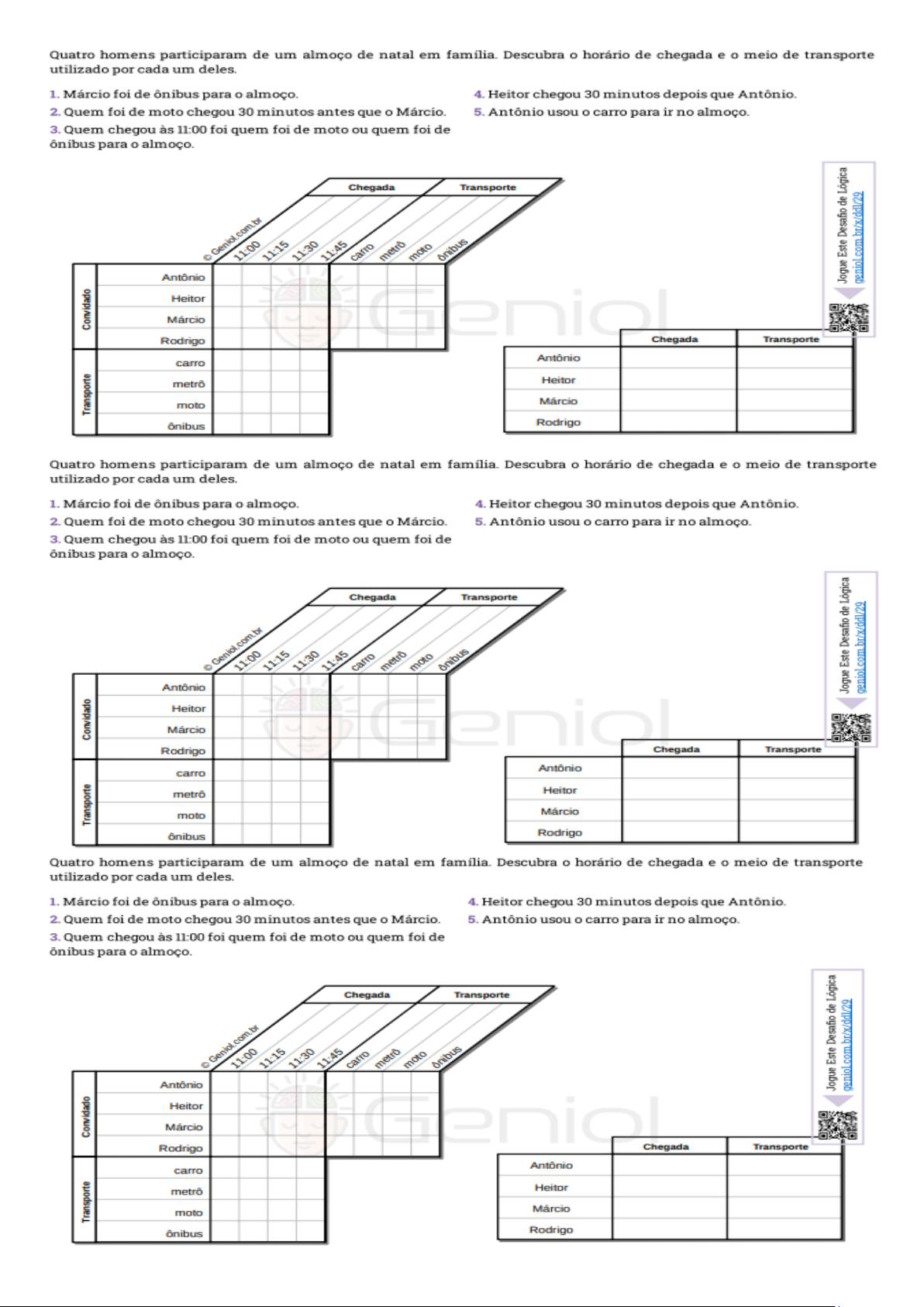 Quatro homens participaram de um almoço de natal em Descubra o horário de chegada e o meio de transporte utilizado por cada um deles. 1. Márcio foi de ônibus para o almoço. 4. Heitor chegou 30 minutos depois que Antônio. 2. Quem foi de moto chegou 30 minutos antes que o Márcio. 5. Antônio usou o carro para ir no almoço. 3. Quem chegou às 11:00 foi quem foi de moto ou quem foi de ônibus para o almoço. Chegada Transporte 11:00 11:30 11:45 metro moto Jogue Este Desafio de Lógica geniol com br/x/ddl/29 Antônio Convidado Heitor Márcio Rodrigo Chegada Transporte Antônio carro metrô Heitor Transporte moto Márcio ônibus Rodrigo Quatro homens participaram de um almoço de natal em família. Descubra o horário de chegada e o meio de transporte utilizado por cada um deles. 1. Márcio foi de ônibus para o almoço. 4. Heitor chegou 30 minutos depois que Antônio. 2. Quem foi de moto chegou 30 minutos antes que o Márcio. 5. Antônio usou o carro para ir no almoço. 3. Quem chegou às 11:00 foi quem foi de moto ou quem foi de ônibus para o almoço. Chegada Transporte 11:15 11:30 11:45 carro metro moto Jogue Este Desafio de Lógica geniol com br/x/ddl/29 Antônio Convidado Heitor Márcio Rodrigo Chegada Transporte Antônio carro Heitor Transporte metrô Márcio moto ônibus Rodrigo Quatro homens participaram de um almoço de natal em família. Descubra o horário de chegada e o meio de transporte utilizado por cada um deles. 1. Márcio foi de ônibus para o almoço. 4. Heitor chegou 30 minutos depois que Antônio. 2. Quem foi de moto chegou 30 minutos antes que Márcio. 5. Antônio usou o carro para ir no almoço. 3. Quem chegou às 11:00 foi quem foi de moto ou quem foi de ônibus para o almoço. Chegada Transporte 11:15 11:30 11:45 metro moto Jogue Este Desafio de Lógica geniol com br/x/ddl/29 Antônio Convidado Heitor Márcio Rodrigo Chegada Transporte Antônio carro Heitor Transporte metrô Márcio moto ônibus Rodrigo