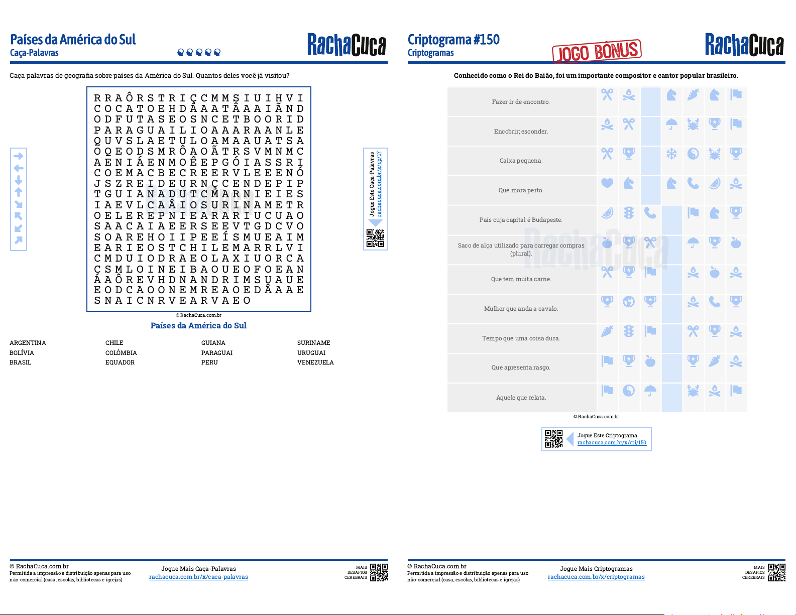 Caça palavras de geogra�a sobre países da América do Sul. Quantos deles você já visitou? Países da América do Sul ARGENTINA BOLÍVIA BRASIL CHILE COLÔMBIA EQUADOR GUIANA PARAGUAI PERU SURINAME URUGUAI VENEZUELA © RachaCuca.com.br Permitida a impressão e distribuição apenas para uso não-comercial (casa, escolas, bibliotecas e igrejas) Jogue Mais Caça-Palavras rachacuca.com.br/x/caca-palavras MAIS DESAFIOS CEREBRAIS Países da América do Sul Caça-Palavras R R A Ô R S T R I Ç C M M S I U I H V I C O C A T O E H D A A A T Â A A I Ã N D O D F U T A S E O S N C E T B O O R I D P A R A G U A I L I O A A A R A A N L E Q U V S L A E T U L O A M A A U A T S A O Q E O D S M R Ô A O Ã T R S V M N M C A E N I Á E N M O Ê E P G Ó I A S S R I C O E M A C B E C R E E R V L E E E N Ó J S Z R E I D E U R N Ç C E N D E P I P T G U I A N A D U T C M A R N I E I E S I A E V L C A Â I O S U R I N A M E T R O E L E R E P N I E A R A R I U C U A O S A A C A I A E E R S E E V T G D C V O S O A R E H O I I P E E Í S M U E A I M E A R I E O S T C H I L E M A R R L V I C M D U I O D R A E O L A X I U O R C A C S M L O I N E I B A O U E O F O E A N Á A Ô R E V H D N A N D R I M S U A U E E O D C A O O N E M R E A O E D Â A A E S N A I C N R V E A R V A E O I P G E I © RachaCuca.com.br J o g u e E s te C a ç a -P a la v ra s ra c h a c u c a .c o m .b r/ x /c p /1 7 Conhecido como o Rei do Baião, foi um importante compositor e cantor popular brasileiro. © RachaCuca.com.br © RachaCuca.com.br Permitida a impressão e distribuição apenas para uso não-comercial (casa, escolas, bibliotecas e igrejas) Jogue Mais Criptogramas rachacuca.com.br/x/criptogramas MAIS DESAFIOS CEREBRAIS Criptograma #150 Criptogramas Fazer ir de encontro. Encobrir; esconder. Caixa pequena. Que mora perto. País cuja capital é Budapeste. Saco de alça utilizado para carregar compras (plural). Que tem muita carne. Mulher que anda a cavalo. Tempo que uma coisa dura. Que apresenta rasgo. Aquele que relata. Jogue Este Criptograma rachacuca.com.br/x/cri/150