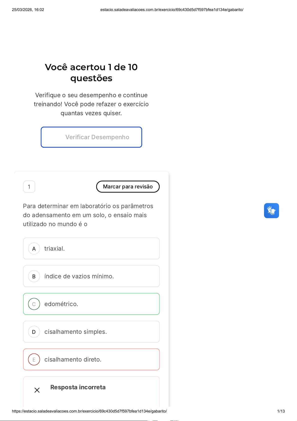 Você acertou 1 de 10 questões Verifique o seu desempenho e continue treinando! Você pode refazer o exercício quantas vezes quiser. Verificar Desempenho A B C D E 1 Marcar para revisão Para determinar em laboratório os parâmetros do adensamento em um solo, o ensaio mais utilizado no mundo é o triaxial. índice de vazios mínimo. edométrico. cisalhamento simples. cisalhamento direto. Resposta incorreta 25/03/2026, 16:02 estacio.saladeavaliacoes.com.br/exercicio/69c430d5d7f597bfea1d134e/gabarito/ https://estacio.saladeavaliacoes.com.br/exercicio/69c430d5d7f597bfea1d134e/gabarito/ 1/13 A B C Opa! A alternativa correta é a letra C. Confira o gabarito comentado! Gabarito Comentado O ensaio edométrico é o mais utilizado em laboratórios ao redor do mundo para determinar os parâmetros de adensamento em um solo. Este ensaio permite avaliar a compressibilidade do solo e a velocidade com que ocorre o adensamento, sendo essencial para o estudo do comportamento do solo sob a ação de cargas. Portanto, a alternativa correta é a "C", que indica o ensaio edométrico. 2 Marcar para revisão Estimou-se que demoraria 5 anos para que ocorresse 50% do adensamento em um solo que apresenta 0,87m²/ano de coeficiente de adensamento. Se o fator tempo para esse caso vale 0,197, a espessura da camada de argila considerando dupla drenagem deve ser de: 8,5m. 4,7m. 11,32m. 25/03/2026, 16:02 estacio.saladeavaliacoes.com.br/exercicio/69c430d5d7f597bfea1d134e/gabarito/ https://estacio.saladeavaliacoes.com.br/exercicio/69c430d5d7f597bfea1d134e/gabarito/ 2/13 D E 22m. 1,85m. Resposta incorreta Opa! A alternativa correta é a letra B. Confira o gabarito comentado! Gabarito Comentado A questão envolve o cálculo da espessura da camada de argila em um solo, considerando um adensamento de 50% em 5 anos, um coeficiente de adensamento de 0,87m²/ano e um fator de tempo de 0,197. A espessura da camada de argila é calculada utilizando a fórmula do coeficiente de adensamento e o fator de tempo. Ao aplicar os valores fornecidos na questão na fórmula, obtemos 4,7m como resultado, que é a alternativa correta. Portanto, a espessura da camada de argila considerando dupla drenagem é de 4,7m. 3 Marcar para revisão Um engenheiro coletou amostras de argila compressível para estimar os parâmetros do adensamento em laboratório. Se durante o transporte a amostra sofreu vibração, pode-se afirmar que 25/03/2026, 16:02 estacio.saladeavaliacoes.com.br/exercicio/69c430d5d7f597bfea1d134e/gabarito/ https://estacio.saladeavaliacoes.com.br/exercicio/69c430d5d7f597bfea1d134e/gabarito/ 3/13 A B C D E A amostra é indeformada, e o índice de vazios é menor que o do campo. A amostra é indeformada, e o coeficiente de compressão é menor que o do campo. A amostra é amolgada, e o índice de vazios é maior que o do campo. A amostra é amolgada, e o coeficiente de compressão é maior que o do campo. A amostra é amolgada, e o coeficiente de recompressão é maior que o do campo. Resposta incorreta Opa! A alternativa correta é a letra E. Confira o gabarito comentado! Gabarito Comentado 25/03/2026, 16:02 estacio.saladeavaliacoes.com.br/exercicio/69c430d5d7f597bfea1d134e/gabarito/ https://estacio.saladeavaliacoes.com.br/exercicio/69c430d5d7f597bfea1d134e/gabarito/ 4/13 A B C A alternativa correta é a E, que afirma que a amostra é amolgada e o coeficiente de recompressão é maior que o do campo. Isso ocorre porque a vibração durante o transporte pode causar deformações na amostra, tornando-a amolgada. Além disso, essa deformação pode aumentar o coeficiente de recompressão, pois a amostra pode ter uma maior tendência a se recomprimir após ser deformada. Portanto, a vibração durante o transporte pode alterar as propriedades da amostra, afetando os resultados dos testes de adensamento em laboratório. 4 Marcar para revisão A forma mais acurada de se obter o coeficiente de adensamento para estimativa de recalques e tempo até que ocorra em adensamentos em solos é por meio do (a): Método de Taylor a partir dos resultados de ensaio edométrico. Método de Casagrande a partir dos resultados de ensaio edométrico. Método de Pacheco e Silva a partir dos resultados de ensaio edométrico. 25/03/2026, 16:02 estacio.saladeavaliacoes.com.br/exercicio/69c430d5d7f597bfea1d134e/gabarito/ https://estacio.saladeavaliacoes.com.br/exercicio/69c430d5d7f597bfea1d134e/gabarito/ 5/13 D E Correlações com o índice de plasticidade. Retroanálise de casos reais em campo. Resposta incorreta Opa! A alternativa correta é a letra E. Confira o gabarito comentado! Gabarito Comentado A alternativa correta é a "E", que menciona a retroanálise de casos reais em campo. Isso significa que, para obter o coeficiente de adensamento mais preciso para estimar recalques e o tempo até que ocorram em adensamentos em solos, é mais eficaz analisar casos reais que já ocorreram. Isso permite uma compreensão mais profunda e precisa das condições do solo e de como ele reage sob certas circunstâncias, proporcionando uma estimativa mais acurada. Os outros métodos mencionados nas alternativas A, B, C e D, embora úteis, não fornecem a mesma precisão que a análise de casos reais. 5 Marcar para revisão A deformação que ocorre lentamente em solos em consequência da expulsão de água dos poros devido à aplicação de carregamento é chamada de 25/03/2026, 16:02 estacio.saladeavaliacoes.com.br/exercicio/69c430d5d7f597bfea1d134e/gabarito/ https://estacio.saladeavaliacoes.com.br/exercicio/69c430d5d7f597bfea1d134e/gabarito/ 6/13 A B C D E recalque imediato. adensamento primário. adensamento secundário. recalque por adensamento. ressecamento por adensamento. Resposta incorreta Opa! A alternativa correta é a letra D. Confira o gabarito comentado! Gabarito Comentado A saída de água resulta, naturalmente, na diminuição da camada do solo. A essa diminuição dá-se o nome de recalque por adensamento. 6 Marcar para revisão Estimou-se que um recalque 