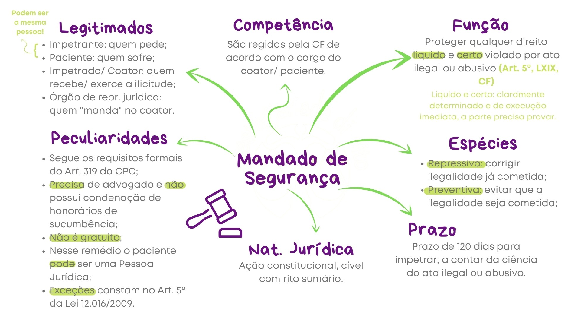 Exemplos Práticos (Direito Líquido e Certo): Concurso Público: Candidato aprovado dentro do número de vagas que não é nomeado pela administração, possuindo edital e classificação em mãos. Tributário: Negativa de certidão negativa de débito mesmo após o pagamento do tributo (comprovado documentalmente). Administrativo: Suspensão de licença sem processo administrativo ou sem chance de defesa, evidenciado pelo ato administrativo ilegal Características: Prova Pré-constituída: Deve ser demonstrado de plano, documentalmente, no momento da impetração do mandado de segurança. Fato Incontroverso: A situação fática é clara e não exige investigação de provas complementares NATUREZA JURÍDICA DO MANDADO DE SEGURAÇA O Mandado de Segurança (MS) é considerado uma ação civil de natureza constitucional porque o seu objetivo principal é proteger um direito líquido e certo que foi violado ou ameaçado por um ato ilegal ou com abuso de poder por parte de uma autoridade pública (ou agente de pessoa jurídica no exercício de atribuições do Poder Público). A natureza de "ação civil" se dá pelos seguintes motivos: Finalidade de Proteção de Direitos: Ele serve para defender direitos individuais ou coletivos (não penais) que já estejam comprovados documentalmente (direito líquido e certo). Ato de Autoridade: É utilizado contra atos de autoridades públicas, o que o insere na esfera do Direito Público/Administrativo, um ramo do direito civil/público, e não penal. Natureza Mandamental: O HC protege a liberdade física (ir/vir/permanecer), natureza pena/constitucional. MS protege direitos líquidos e certos (prova documental pré-constituída) contra atos ilegais de autoridade. Procedimento Cível: O rito do mandado de segurança é regido por normas de processo civil, não criminal, e é utilizado quando não há necessidade de dilação probatória (ou seja, quando o direito já pode ser comprovado de imediato) Segundo o § 3º do artigo 1º da referida lei, o mandado de segurança coletivo pode ser utilizado quando o direito violado pertencer a várias pessoas, e qualquer uma delas pode requerê-lo. O Mandado de Segurança Coletivo (MS Coletivo) é um remédio constitucional utilizado por sindicatos, associações, partidos políticos ou entidades de classe para proteger direitos líquidos e certos de um grupo, sem necessidade de autorização expressa. Principais Exemplos de MS Coletivo: Sindicatos: Impetrado contra a cobrança de pedágio ilegal para uma categoria (ex: taxistas) ou para anular um decreto estadual que criou tributos indevidos para funcionários públicos. Associações de Classe: Ajuizado para garantir direitos trabalhistas de um grupo, como o pagamento correto de licença-prêmio ou abonos (APIP) para servidores ou empregados de uma empresa pública (ex: Caixa Econômica Federal). OAB (Entidades de Classe): Impetrado para suspender cláusulas discriminatórias em editais de concursos públicos, como limites de idade ou de tatuagens. Partidos Políticos: Usado para defender direitos políticos ou constitucionais de seus filiados com representação no Congresso Nacional Quem pode impetrar MS (Legitimidade Ativa): Partido Político: Com representação no Congresso Nacional (pelo menos um senador ou deputado). Organização Sindical: Sindicatos. Entidade de Classe: Representantes de categorias profissionais (ex: CREA, COREN). Associações: Legalmente constituídas e em funcionamento há pelo menos um ano. Requisito crucial: Pertinência temática (a causa deve estar ligada à finalidade da entidade) Exemplos de MS Coletivo: Servidores Públicos: Sindicato impetra MS contra corte ilegal de salários ou para garantir direito à greve. Concurso Público: Associação impetra MS para suspender edital que proíbe candidatos tatuados. Tributário: Entidade de classe atua contra aumento ilegal de tributos para sua categoria. Meio Ambiente/Urbano: Associação de moradores impetra MS contra omissão do Poder Público na fiscalização. OBS.: AS Entidades atuam em nome próprio, defendendo interesse de terceiros – membros ou associados e não é necessária a autorização expressa dos associados. Estrutura da Petição Inicial Qualquer pessoa física ou jurídica (pública ou privada) precisa de advogado e não é isento de custas judiciais A petição segue as regras do CPC (art. 319), com adaptações da Lei 12.016: Endereçamento: Juízo competente (justiça federal ou estadual, dependendo da autoridade coatora). Impetrante: Quem sofreu a violação ao direito líquido e certo Impetrado (Autoridade Coatora): Nome e cargo da autoridade, mais a pessoa jurídica a que ela está vinculada (ex: ato de um Diretor da Receita Federal -> Impetrado: Diretor da Receita Federal E União Federal). Fatos: Narração objetiva do ato ilegal. Direito: Demonstração do direito líquido e certo. Pedido Liminar: Se houver risco de ineficácia da medida (periculum in mora) e o direito for evidente (fumus boni iuris), peça a liminar. Pedidos Finais: Notificação da autoridade, citação da PJ, intimação do MP e procedência do pedido. Hipóteses de Não Cabimento do MS (Lei 12.016/09): Existência de Recurso Administrativo/Judicial: Quando a lei prever recurso com efeito suspensivo contra o ato coator, não se pode usar o MS, a menos que o recurso não tenha essa característica. Ausência de Direito Líquido e Certo: Necessidade de dilação probatória. O MS exige prova pré-constituída; se precisar produzir novas provas, não é a via adequada. Decisão Judicial Transitada em Julgado: Não cabe MS contra decisões que já encerraram o processo e não admitem mais recursos. Decisão Judicial com Recurso Próprio: Se a decisão judicial puder ser contestada por outro recurso (ex: agravo de instrumento), o MS é inadequado. Decisões do Juizado Especial (Lei 9.099/95): Incabível contra decisões interlocutórias em juizados especiais. Atos de Gestão Comercial
