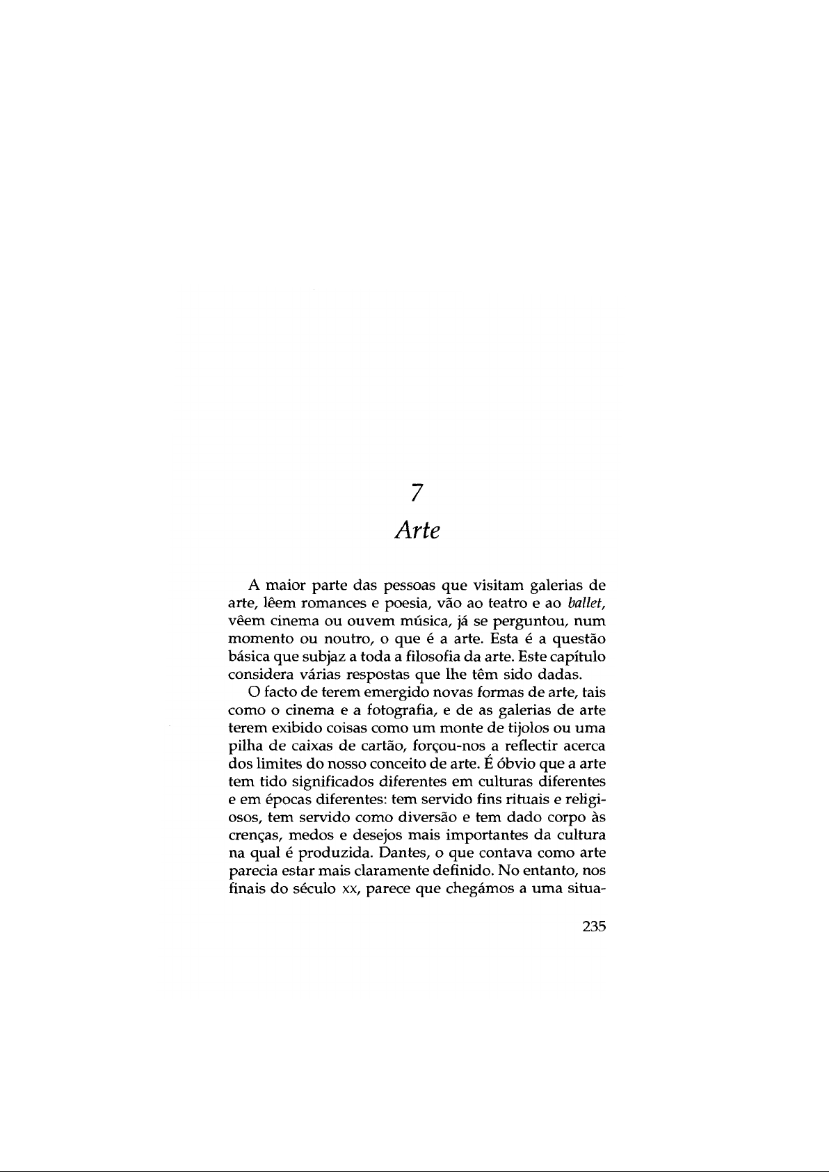 7 Arte A maior parte das pessoas que visitam galerias de arte, lêem romances e poesia, vão ao teatro e ao ballet, vêem cinema ou ouvem música, já se perguntou, num momento ou noutro, o que é a arte. Esta é a questão básica que subjaz a toda a filosofia da arte. Este capítulo considera várias respostas que lhe têm sido dadas. facto de terem emergido novas formas de arte, tais como o cinema e a fotografia, e de as galerias de arte terem exibido coisas como um monte de tijolos ou uma pilha de caixas de cartão, forçou-nos a reflectir acerca dos limites do nosso conceito de arte. É óbvio que a arte tem tido significados diferentes em culturas diferentes e em épocas diferentes: tem servido fins rituais e religi- osos, tem servido como diversão e tem dado corpo às crenças, medos e desejos mais importantes da cultura na qual é produzida. Dantes, o que contava como arte parecia estar mais claramente definido. No entanto, nos finais do século parece que chegámos a uma situa- 235ELEMENTOS BÁSICOS DE FILOSOFIA ção em que tudo e mais alguma coisa pode ser arte. Se isto é assim, o que fará com que um certo objecto um escrito ou uma peça musical e não outro, sejam dig- nos de se chamar arte? Pode a arte ser definida? Há uma imensa variedade de obras de arte pin- turas, peças de teatro, filmes, romances, peças musi- cais, dança e todas elas parecem ter muito pouco em comum. Isto levou alguns filósofos a defender que a arte não pode de maneira nenhuma ser definida; defen- dem que é um erro completo olhar para um denomina- dor comum, uma vez que existe, pura e simplesmente, demasiada variedade entre as obras de arte para que uma definição que as cubra a todas possa ser satis- fatória. Para sustentar esta opinião, estes filósofos usam a ideia de parecença familiar, uma noção usada pelo filósofo Ludwig Wittgenstein nas suas Investigações Filosóficas. conceito de parecença familiar leitor pode parecer-se ligeiramente com o seu pai e o seu pai pode parecer-se com a irmã dele. Contudo, é possível que o leitor não se pareça nada com a irmã do seu pai. Por outras palavras, podem existir parecen- ças sobrepostas entre diferentes membros de uma famí- lia, sem que exista uma característica única observável, partilhada por todos. Analogamente, há muitos jogos semelhantes, mas é difícil ver o que têm em comum as paciências, o xadrez, o râguebi e a malha. 236ARTE As semelhanças entre diferentes tipos de arte podem ser deste tipo: apesar das semelhanças óbvias entre al- gumas obras de arte, podem não existir características observáveis partilhadas por todas: podem não existir denominadores comuns. Se isto for verdade, é um erro procurar uma qualquer definição geral de arte. me- lhor que podemos desejar é uma definição de uma certa forma de arte, como o romance, o filme de ficção ou a sinfonia. Críticas à perspectiva da parecença familiar Uma forma de demonstrar a falsidade desta pers- pectiva seria produzir uma definição satisfatória de arte. Examinaremos a seguir várias tentativas de o con- seguir. Contudo, vale a pena notar que mesmo no caso das parecenças de família há algo que todos os mem- bros de uma família têm realmente em comum: o facto de estarem geneticamente relacionados. E os jogos são todos parecidos por poderem constituir interesses ab- sorventes de carácter não prático para jogadores ou espectadores. Ora, apesar de esta definição de jogo ser bastante vaga e nem sequer inteiramente satisfatória não nos ajuda a distinguir os jogos de outras actividades, como, por exemplo, beijar ou ouvir música sugere que pode encontrar-se uma definição mais detalhada e plausível. Se isto pode fazer-se em relação aos jogos, não há razão para afastar à partida a possi- bilidade de o fazer em relação às obras de arte. Claro que o denominador comum a todas as formas de arte pode revelar-se particularmente pouco interessante ou importante, mas é claramente possível encontrar um. 237ELEMENTOS BÁSICOS DE FILOSOFIA Consideremos, então, algumas das tentativas de defini- ção da arte. Examinaremos a teoria da forma signifi- cante, a idealista e a institucional. A teoria da forma significante A teoria da forma significante, popular no princípio do século XX e particularmente ligada ao crítico de arte Clive Bell (1881-1964) e ao seu livro Art, começa pelo pressuposto de que todas as obras de arte genuínas produzem uma emoção estética no espectador, ouvinte ou leitor. Esta emoção é diferente das emoções da vida quotidiana: distingue-se por não ter nada a ver com interesses práticos. Que características das obras de arte fazem com que as pessoas reajam daquela forma? Por que evocam as obras de arte aquela emoção estética? A resposta dada por Bell é que todas as obras de arte genuínas partilham uma qualidade conhecida como «forma significante» um termo por ele introduzido. A forma significante é uma certa relação entre as partes as características que distinguem a estrutura de uma obra de arte e não o seu tema específico. Apesar de esta teoria se aplicar geralmente apenas às artes visuais, pode também ser tomada como uma definição de todas as artes. Assim, por exemplo, ao considerar o que faz com que um quadro de Van Gogh representando um par de botas velhas seja uma obra de arte, um teórico da forma significante faria notar a combinação de cores e texturas que possuem forma significante e que pro- duzem, portanto, a emoção estética em críticos sen- síveis. 238ARTE A forma significante é uma propriedade indefinível que os críticos sensíveis podem intuitivamente reco- nhecer numa obra de arte. Infelizmente, os críticos in- sensíveis são incapazes de apreciar a forma significante. Bell, ao contrário, por exemplo, dos teóricos institucionalistas discutidos a seguir, acreditava que a arte era um conceito valorativo: isto significa que afir- mar que algo é uma obra de arte