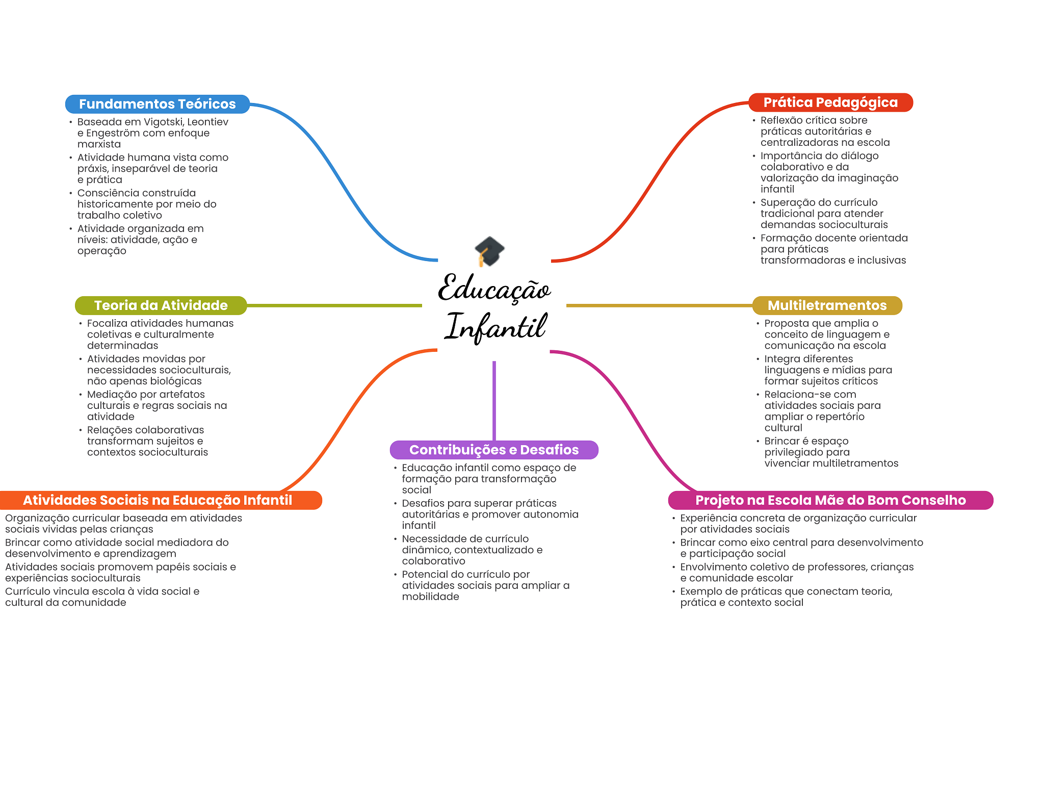Fundamentos Teóricos Prática Pedagógica Baseada em Vigotski, Leontiev Reflexão crítica sobre e Engeström com enfoque práticas autoritárias e marxista centralizadoras na escola Atividade humana vista como Importância do diálogo práxis, inseparável de teoria colaborativo e da e prática valorização da imaginação Consciência construída infantil historicamente por meio do Superação do currículo trabalho coletivo tradicional para atender Atividade organizada em demandas socioculturais níveis: atividade, ação e Formação docente orientada operação para práticas transformadoras e inclusivas Educação Teoria da Atividade Multiletramentos Focaliza atividades humanas coletivas e culturalmente Infantil Proposta que amplia conceito de linguagem e determinadas comunicação na escola Atividades movidas por Integra diferentes necessidades socioculturais, linguagens e mídias para não apenas biológicas formar sujeitos críticos Mediação por artefatos Relaciona-se com culturais e regras sociais na atividades sociais para atividade ampliar repertório Relações colaborativas cultural transformam sujeitos e Brincar é espaço contextos socioculturais Contribuições e Desafios privilegiado para Educação infantil como espaço de vivenciar multiletramentos formação para transformação social Atividades Sociais na Educação Infantil Desafios para superar práticas Projeto na Escola Mãe do Bom Conselho Organização curricular baseada em atividades autoritárias e promover autonomia Experiência concreta de organização curricular sociais vividas pelas crianças infantil por atividades sociais Brincar como atividade social mediadora do Necessidade de currículo Brincar como eixo central para desenvolvimento desenvolvimento e aprendizagem dinâmico, contextualizado e e participação social colaborativo Atividades sociais promovem papéis sociais e Envolvimento coletivo de professores, crianças experiências socioculturais Potencial do currículo por e comunidade escolar Currículo vincula escola à vida social e atividades sociais para ampliar a mobilidade Exemplo de práticas que conectam teoria, cultural da comunidade prática e contexto social