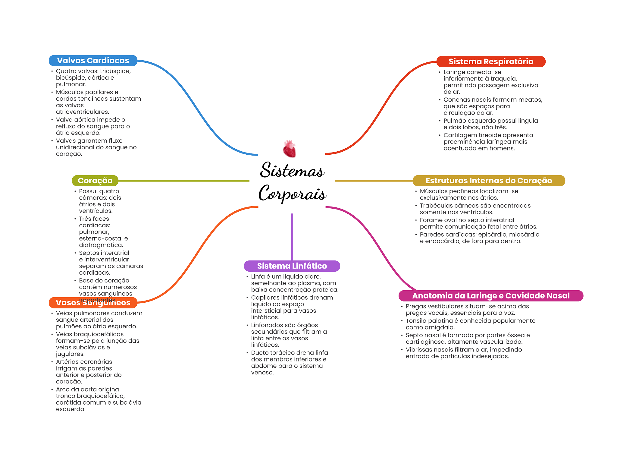 Valvas Cardíacas Sistema Respiratório Quatro valvas: tricúspide, Laringe conecta-se bicúspide, aórtica e inferiormente à traqueia, pulmonar. permitindo passagem exclusiva Músculos papilares e de ar. cordas tendíneas sustentam Conchas nasais formam meatos, as valvas que são espaços para atrioventriculares. circulação do ar. Valva aórtica impede Pulmão esquerdo possui língula refluxo do sangue para e dois lobos, não três. átrio esquerdo. Cartilagem tireoide apresenta Valvas garantem fluxo proeminência laríngea mais unidirecional do sangue no acentuada em homens. coração. Sistemas Coração Estruturas Internas do Coração Possui quatro Corporais Músculos pectíneos localizam-se câmaras: dois exclusivamente nos átrios. átrios e dois Trabéculas cárneas são encontradas ventrículos. somente nos ventrículos. Três faces Forame oval no septo interatrial cardíacas: permite comunicação fetal entre átrios. pulmonar, Paredes cardíacas: epicárdio, miocárdio esterno-costal e e endocárdio, de fora para dentro. diafragmática. Septos interatrial e interventricular separam as câmaras Sistema Linfático cardíacas. Linfa é um líquido claro, Base do coração semelhante ao plasma, com contém numerosos baixa concentração proteica. vasos sanguíneos Capilares linfáticos drenam Anatomia da Laringe e Cavidade Nasal Vasos líquido do espaço Pregas vestibulares situam-se acima das Veias pulmonares conduzem intersticial para vasos pregas vocais, essenciais para a voz. sangue arterial dos linfáticos. Tonsila palatina é conhecida popularmente pulmões ao átrio esquerdo. Linfonodos são órgãos como amígdala. Veias braquiocefálicas secundários que filtram a linfa entre vasos Septo nasal é formado por partes óssea e formam-se pela junção das veias subclávias e linfáticos. cartilaginosa, altamente vascularizado. jugulares. Ducto torácico drena linfa Vibrissas nasais filtram ar, impedindo Artérias coronárias dos membros inferiores e entrada de partículas indesejadas. irrigam as paredes abdome para sistema anterior e posterior do venoso. coração. Arco da aorta origina tronco braquiocefálico, carótida comum e subclávia esquerda.