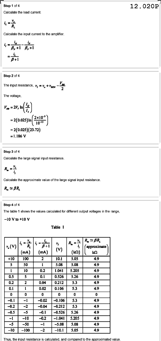 Step 1 of 4 12.020P Calculate the load current. Calculate the input current to the amplifier. Step 2 of 4 The input resistance, The voltage, = = =2(0.025)(23.72) = 1.186 V Step 3 of 4 Calculate the large signal input resistance. Calculate the approximate value of the large signal input resistance. Step 4 of 4 The table 1 shows the values calculated for different output voltages in the range, -10 V to +10 V Table I +10 100 2 10.1 5.05 4.9 5 50 1 5.08 5.08 4.9 1 10 0.2 1.041 5.205 4.9 0.5 5 0.1 0.526 5.26 4.9 0.2 2 0.04 0.212 5.3 4.9 0.1 1 0.02 0.106 5.3 4.9 0 0 0 0 0 0 -0.1 -1 -0.02 -0.106 5.3 4.9 -0.2 -2 -0.04 -0.212 5.3 4.9 -0.5 -5 -0.1 -0.526 5.26 4.9 -1 -10 -0.2 -1.041 5.205 4.9 -5 -50 -1 -5.08 5.08 4.9 -10 -100 -2 -10.1 5.05 4.9 Thus, the input resistance is calculated, and compared to the approximated value.