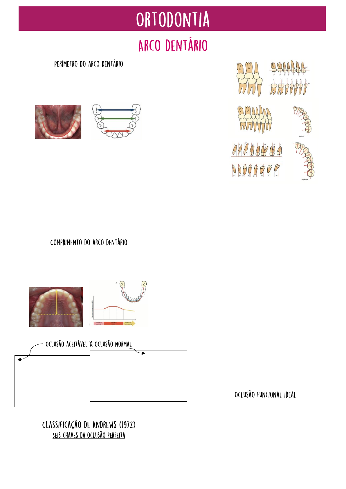 Se estende da mesial do primeiro molar permanente de um lado à mesial do primeiro molar do lado oposto, passando pelos sulcos dos pré-molares e cúspides dos caninos e incisivos como referência. Distância intercaninos (linha vermelha) Distância interpré-molares (linha verde) Distância intermolares (linha azul) * A distância intercaninos tendem a aumentar até os 8-9 anos de idade, depois só aumenta do segundo molar ao terceiro; * O perímetro do arco inferior diminui em média 5mm, isso ocorre devido ao: - Deslocamento mesial tardio dos molares; - Componente anterior de força; - Desgastes interproximais dos dentes; - Posicionamento lingual dos incisivos inferiores. Consiste na dimensão anteroposterior do arco, estendendo-se da palatina do incisivo central, passando pela rafe palatina até encontrar a linha imaginária que passa pela mesial dos primeiros molares. 1. Relação dos molares: a superfície distal da crista marginal do primeiro molar superior contacta e oclui com a superfície mesial do segundo molar inferior * A cúspide mesiovestibular do primeiro molar superior oclui dentro do sulco entre a cúspide mesiovestibular e a mediana do primeiro molar inferior. * A cúspide mesiopalatina do primeiro molar superior adapta-se a fossa central do primeiro molar inferior. 2. Angulação da Coroa: para ter a chave 1, precisa ter a 2 também. A porção cervical do longo eixo de cada coroa encontra-se distalmente a porção oclusal (mésio/distal). 3. Inclinação da Coroa: a porção cervical do longo eixo dos incisivos superiores encontra-se lingualmente a superfície incisal, aumentando a inclinação lingual progressivamente na região posterior. (vestíbulo/lingual). • IS - Positiva (levemente inclinado para vestibular) • II - Levemente negativa (levemente inclinado para lingual) • C, PM e M – negativa 4. Rotações: não deve haver rotações. 5. Contatos interproximais: não deve haver diastemas, contatos interproximais devem estar justos. 6. Curva de Spee: ausência ou suavidade, apresentar- se plana. • Oclusão mutuamente protegida • Oclusão em relação cêntrica • Presença de guia de desoclusão anterior • Ausência de contatos prematuros e interferências oclusais • Guia de desoclusão lateral feita pelos caninos Má oclusão (70% da população) • Mastigação satisfatória; • Dicção razoável; • Autoclise; • Saúde periodontal; • Estética aceitável. (27% da população) • 28 dentes corretamente ordenados no arco, em harmonia com todas as forças estáticas e dinâmicas; • Oclusão estável, saudável; • Bom perfil facial. (3% da população) Os primeiros molares apresentam-se em oclusão normal. É importante que não se confunda classe I com a normoclusão, os pacientes classe I frequentemente apresentam um perfil facial harmonioso. Molares em oclusão, porém os anteriores podem estar desalinhados. O sulco mesiovestibular do primeiro molar inferior encontra- se distalizado em relação a cúspide mesiovestibular do primeiro molar inferior, esses pacientes frequentemente apresentam um perfil convexo. Possui duas divisões e subdivisões • incisivos superiores apresentam-se inclinados para vestibular, trespasse horizontal acentuado. • incisivos centrais superiores encontram-se verticalizados ou lingualizados e os incisivos laterais superiores encontram-se vestibularizados. Não tem trespasse horizontal. • : pode ser de Subdivisão direita (quando a Classe II está presente somente do lado direito) ou Subdivisão esquerda (quando a Classe II está presente somente do lado esquerdo). Pode ocorrer desvio da linha média. Os dentes inferiores ocluem em uma relação mesial em relação aos superiores. O sulco mesiovestibular do primeiro molar inferior encontra-se mesializado em relação à cúspide mesiovestibular do primeiro molar superior. Classificou as maloclusões de acordo com as posições individuais dentárias • Vestibuloversão: vestibularizado a posição normal, em direção ao lábio ou a bochecha. • Linguoversão: lingualizado a posição normal. • Mesioversão: mesializado a posição normal. • Distoversão: distalizado a posição normal. • Transversão: alteração de posição, transposição. • Infraversão: aquém da linha de oclusão. • Supraversão: além da linha de oclusão. • Giroversão: rotado sobre seu longo eixo. • Axioversão: alteração da inclinação do dente em relação ao seu longo eixo. • Perversão: dente encontra-se impactado, geralmente por falta de espaço. Dividiu as maloclusões relacionando os arcos dentários com três planos anatômicos. (plano orbitário, plano sagital e plano de Frankfurt) • Protração: arco dentário localizado mais para anterior em relação ao plano orbitário. • Retração: arco dentário localizado mais para posterior em relação ao plano orbitário. • Contração: arco dentário se aproxima do plano sagital. • Distração: arco dentário se afasta do plano sagital. • Atração: arco dentário se aproxima do plano de Frankfurt (face curta). • Abstração: arco dentário se afasta do plano de Frankfurt (face longa). Padrões subjetivos na análise facial face equilibrada, sem examiná-lo clinicamente. degrau sagital aumentado entre maxila e mandíbula. Protrusão maxilar ou deficiência mandibular (classe II dentária) degrau sagital maxilomandibular diminuído. Retrusao maxilar ou prognatismo mandibular. Nem sempre apresenta classe III. excesso do terço inferior da face, torna o selamento labial impossível. deficiência vertical do terço inferior da face, torna o selamento labial compressivo. alteração em magnitude, ou seja, aumento da massa (mudança quantitativa). progresso no sentido da maturidade das funções, englobando a diferenciação progressiva em níveis celulares e teciduais (mudança quantitativa e qualitativa). • A partir de uma condensação do tecido conjuntivo membranoso, se forma a partir de 