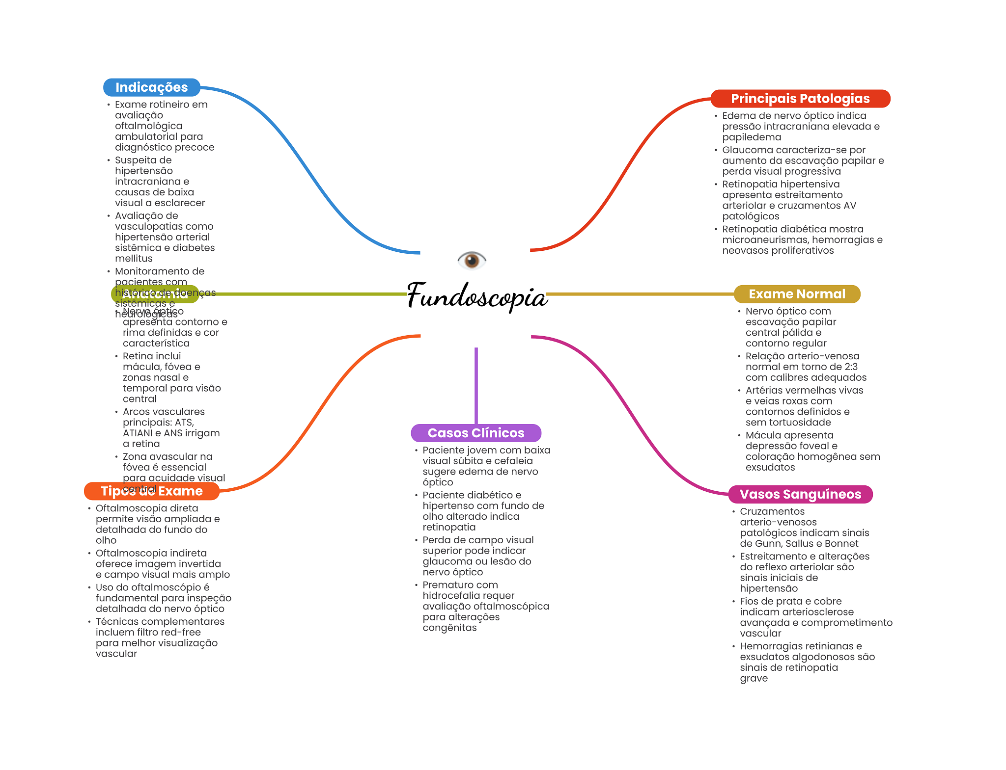 Indicações Exame rotineiro em Principais Patologias avaliação Edema de nervo óptico indica oftalmológica pressão intracraniana elevada e ambulatorial para papiledema diagnóstico precoce Glaucoma caracteriza-se por Suspeita de aumento da escavação papilar e hipertensão perda visual progressiva intracraniana e Retinopatia hipertensiva causas de baixa apresenta estreitamento visual a esclarecer arteriolar e cruzamentos AV Avaliação de patológicos vasculopatias como Retinopatia diabética mostra hipertensão arterial microaneurismas, hemorragias e sistêmica e diabetes neovasos proliferativos mellitus Monitoramento de pacientes com doenças sistêmicas Fundoscopia Exame Normal Nervo Nervo óptico com apresenta contorno e escavação papilar rima definidas e cor central pálida e característica contorno regular Retina inclui Relação arterio-venosa mácula, fóvea e normal em torno de 2:3 zonas nasal e com calibres adequados temporal para visão Artérias vermelhas vivas central e veias roxas com Arcos vasculares contornos definidos e principais: ATS, sem tortuosidade ATIANI e ANS irrigam Casos Clínicos Mácula apresenta a retina Paciente jovem com baixa depressão foveal e Zona avascular na visual súbita e cefaleia coloração homogênea sem fóvea é essencial exsudatos sugere edema de nervo para acuidade visual óptico Exame Paciente diabético e Vasos Sanguíneos Oftalmoscopia direta hipertenso com fundo de Cruzamentos permite visão ampliada e olho alterado indica arterio-venosos detalhada do fundo do retinopatia patológicos indicam sinais olho Perda de campo visual de Gunn, Sallus e Bonnet Oftalmoscopia indireta superior pode indicar oferece imagem invertida glaucoma ou lesão do Estreitamento e alterações do reflexo arteriolar são e campo visual mais amplo nervo óptico sinais iniciais de Uso do oftalmoscópio é Prematuro com hipertensão fundamental para inspeção hidrocefalia requer detalhada do nervo óptico avaliação oftalmoscópica Fios de prata e cobre indicam arteriosclerose Técnicas complementares para alterações congênitas avançada e comprometimento incluem filtro red-free vascular para melhor visualização Hemorragias retinianas e vascular exsudatos algodonosos são sinais de retinopatia grave