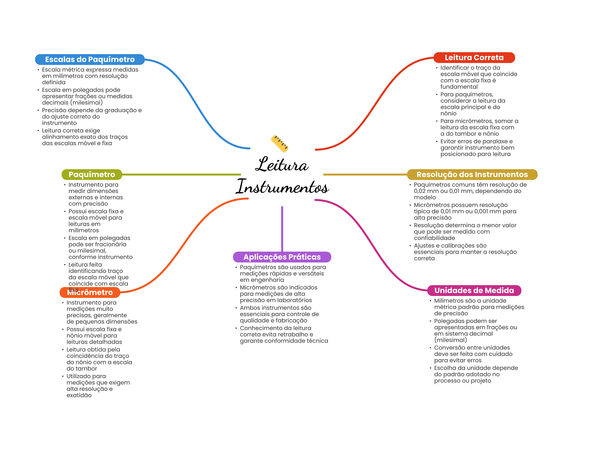 Escalas do Paquímetro Leitura Correta Escala métrica expressa medidas Identificar traço da em milímetros com resolução escala móvel que coincide definida com a escala fixa é fundamental Escala em polegadas pode apresentar frações ou medidas Para paquímetros, decimais (milesimal) considerar a leitura da Precisão depende da graduação e escala principal e do nônio do ajuste correto do instrumento Para micrômetros, somar a leitura da escala fixa com Leitura correta exige a do tambor e nônio alinhamento exato dos traços das escalas móvel e fixa Evitar erros de paralaxe e garantir instrumento bem posicionado para leitura Leitura Paquímetro Resolução dos Instrumentos Instrumento para medir dimensões Instrumentos Paquímetros comuns têm resolução de 0,02 mm ou 0,01 mm, dependendo do externas e internas modelo com precisão Micrômetros possuem resolução Possui escala fixa e típica de 0,01 mm ou 0,001 mm para escala móvel para alta precisão leituras em Resolução determina menor valor milímetros que pode ser medido com Escala em polegadas confiabilidade pode ser fracionária Ajustes e calibrações são ou milesimal, essenciais para manter a resolução conforme instrumento Aplicações Práticas correta Leitura feita Paquímetros são usados para identificando traço medições rápidas e versáteis da escala móvel que em engenharia coincide com escala Micrômetros são indicados Micrômetro Unidades de Medida para medições de alta Instrumento para precisão em laboratórios Milímetros são a unidade medições muito Ambos instrumentos são métrica padrão para medições precisas, geralmente essenciais para controle de de precisão de pequenas dimensões qualidade e fabricação Polegadas podem ser Possui escala fixa e Conhecimento da leitura apresentadas em frações ou nônio móvel para correta evita retrabalho e em sistema decimal leituras detalhadas garante conformidade técnica (milesimal) Leitura obtida pela Conversão entre unidades coincidência do traço deve ser feita com cuidado do nônio com a escala para evitar erros do tambor Escolha da unidade depende Utilizado para do padrão adotado no medições que exigem processo ou projeto alta resolução e exatidão