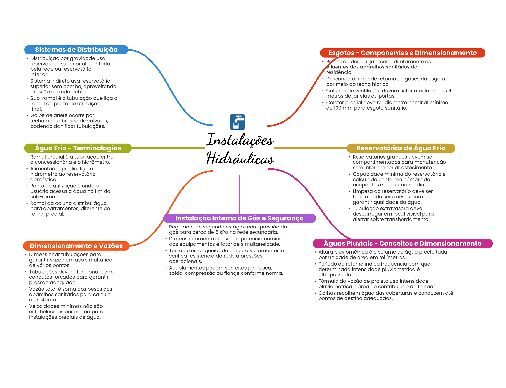 Sistemas de Distribuição Esgotos Componentes e Dimensionamento Distribuição por gravidade usa reservatório superior alimentado Ramal de descarga recebe diretamente os pela rede ou reservatório efluentes dos aparelhos sanitários da inferior. residência. Sistema indireto usa reservatório Desconector impede retorno de gases do esgoto superior sem bomba, aproveitando por meio do fecho hídrico. pressão da rede pública. Colunas de ventilação devem estar a pelo menos 4 Sub-ramal é a tubulação que liga metros de janelas ou portas. ramal ao ponto de utilização Coletor predial deve ter diâmetro nominal mínimo final. de 100 mm para esgoto sanitário. Golpe de aríete ocorre por fechamento brusco de válvulas, podendo danificar tubulações. Instalações Água Fria Terminologias Reservatórios de Água Fria Ramal predial é a tubulação entre Hidráulicas Reservatórios grandes devem ser a concessionária e hidrômetro. compartimentados para manutenção Alimentador predial liga sem interromper abastecimento. hidrômetro ao reservatório Capacidade mínima do reservatório é doméstico. calculada conforme número de Ponto de utilização é onde ocupantes e consumo médio. usuário acessa a água no fim do Limpeza do reservatório deve ser sub-ramal. feita a cada seis meses para Ramal da coluna distribui água garantir qualidade da água. para apartamentos, diferente do Tubulação extravasora deve ramal predial. descarregar em local visível para Instalação Interna de Gás e Segurança alertar sobre transbordamento. Regulador de segundo estágio reduz pressão do gás para cerca de 5 kPa na rede secundária. Dimensionamento considera potência nominal Dimensionamento e Vazões dos equipamentos e fator de simultaneidade. Águas Pluviais Conceitos e Teste de estanqueidade detecta vazamentos e Dimensionar tubulações para Altura pluviométrica é volume de água precipitada verifica resistência da rede a pressões garantir vazão em uso simultâneo por unidade de área em milímetros. operacionais. de vários pontos. Período de retorno indica frequência com que Acoplamentos podem ser feitos por rosca, Tubulações devem funcionar como determinada intensidade pluviométrica é solda, compressão ou flange conforme norma. condutos forçados para garantir ultrapassada. pressão adequada. Fórmula da vazão de projeto usa intensidade Vazão total é soma dos pesos dos pluviométrica e área de contribuição do telhado. aparelhos sanitários para cálculo Calhas recolhem água das coberturas e conduzem até do sistema. pontos de destino adequados. Velocidades mínimas não são estabelecidas por norma para instalações prediais de água.