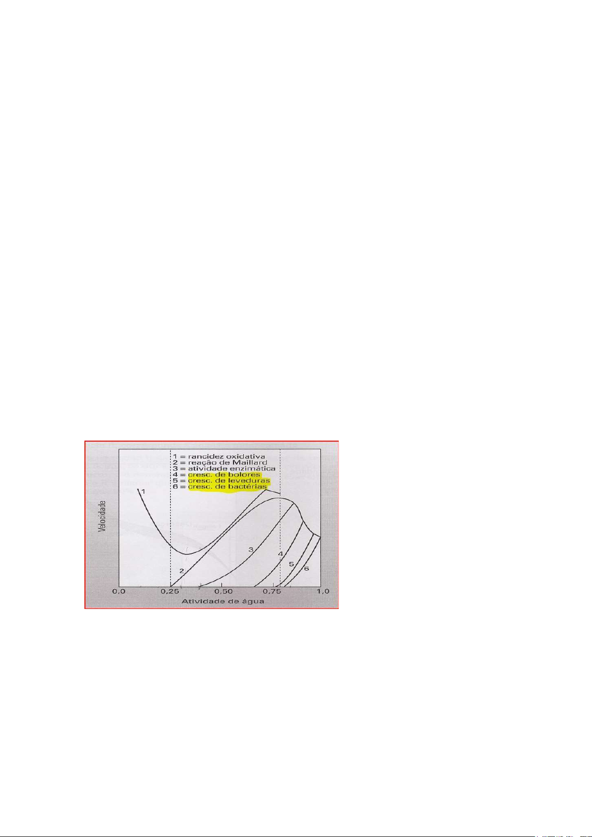 Exercícios de AA 1. Uma análise gravimétrica de teor de umidade apresentou os seguintes resultados: Peso da placa da Capsula de porcelana vazia = 31,560g Peso da placa de Capsula de porcelana + amostra úmida = 36,713g Peso da placa de Capsula de porcelana + amostra seca = 33,219g Calcule a porcentagem de umidade da amostra e a porcentagem de sólido. 2. Sobre o métodos de determinação de umidade por secagem em estufa explique: a) Fundamentação b) Aplicação c) Limitações da técnica. 3. Defina o que é água livre e água ligada e explique quais as possibilidades de interação da água com os constituintes dos alimentos? 4. O que é atividade de água e qual o seu papel na conservação dos alimentos? 5. Observe a seguinte figura e explique como a atividade de água pode influenciar os processos de modificações, químicas, bioquímicas e enzimáticas dos alimentos. 6. Quais cuidados se deve observar ao se determinar a umidade de: a) suco de pêssego. b) hortelã fresco. c) queijo meia cura. 7. O que é análise de cinzas de um alimento, quais constituintes esta técnica determina? 8. Como é feita esta análise? 9. Qual a importância de se determinar as cinzas de um alimento? 10. Explique o que é a técnica de cinzas úmidas, sua aplicação e cuidados experimentais 11. Calcule o teor de umidade e de sólidos totais de cinzas da amostra a seguir: As análises foram feitas em duplicata Análise de Umidade e Sólidos totais Amostra Massa da amostra (g) Massa do cadinho vazio (g) Massa do cadinho após secagem em estufa (g) 1 3,100g 25,200 26,340 2 3,180g 26,400 27,600 Análise de cinzas Amostra Massa da amostra ( g) Massa do cadinho vazio( g) Massa do cadinho após calcinação em mufla (g) 1 3,600 22,300 22,650 2 3,520g 21,800 22,150