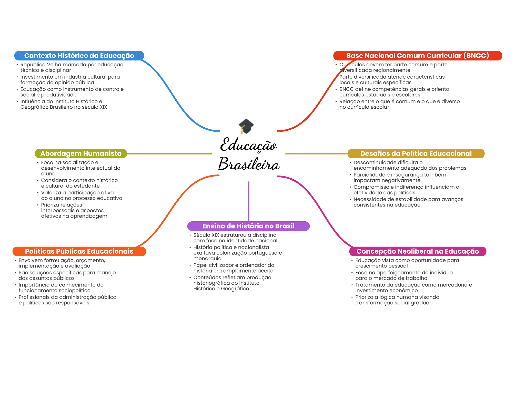 Contexto Histórico da Educação Base Nacional Comum Curricular (BNCC) República Velha marcada por educação Curriculos devem ter parte comum e parte técnica e disciplinar diversificada regionalmente Investimento em indústria cultural para Parte diversificada atende características formação da opinião pública locais e culturais específicas Educação como instrumento de controle BNCC define competências gerais e orienta social e produtividade currículos estaduais e escolares Influência do Instituto Histórico e Relação entre que é comum e que é diverso Geográfico Brasileiro no século XIX no currículo escolar Educação Abordagem Humanista Desafios da Política Educacional Foco na socialização e Brasileira Descontinuidade dificulta desenvolvimento intelectual do encaminhamento adequado dos problemas aluno Parcialidade e insegurança também Considera contexto histórico impactam negativamente e cultural do estudante Compromisso e indiferença influenciam a Valoriza a participação ativa efetividade das políticas do aluno no processo educativo Necessidade de estabilidade para avanços Prioriza relações consistentes na educação interpessoais e aspectos afetivos na aprendizagem Ensino de História no Brasil Século XIX estruturou a disciplina com foco na identidade nacional História política e nacionalista Políticas Públicas Educacionais exaltava colonização portuguesa e Concepção Neoliberal na Educação Envolvem formulação, orçamento, monarquia Educação vista como oportunidade para implementação e avaliação Papel civilizador e ordenador da crescimento pessoal São soluções específicas para manejo história era amplamente aceito Foco no aperfeiçoamento do indivíduo dos assuntos públicos Conteúdos refletiam produção para O mercado de trabalho Importância do conhecimento do historiográfica do Instituto Tratamento da educação como mercadoria e funcionamento sociopolítico Histórico e Geográfico investimento econômico Profissionais da administração pública Prioriza a lógica humana visando e políticos são responsáveis transformação social gradual