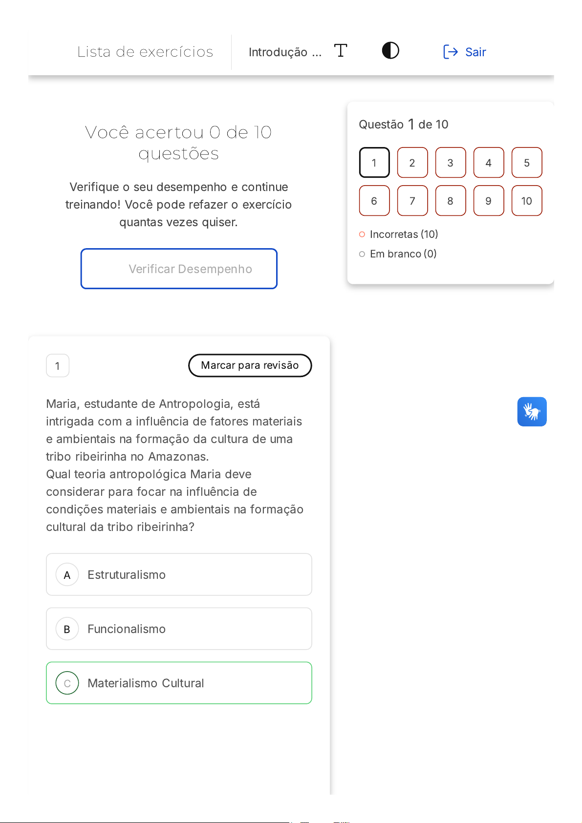 19/03/2026 17:11 https://estacio.saladeavaliacoes.com.br/exercicio/69bc5828d7f597bfea593999/gabarito/ https://estacio.saladeavaliacoes.com.br/exercicio/69bc5828d7f597bfea593999/gabarito/ 1/14 Você acertou 0 de 10 questões Verifique o seu desempenho e continue treinando! Você pode refazer o exercício quantas vezes quiser. Verificar Desempenho A B C 1 Marcar para revisão Maria, estudante de Antropologia, está intrigada com a influência de fatores materiais e ambientais na formação da cultura de uma tribo ribeirinha no Amazonas. Qual teoria antropológica Maria deve considerar para focar na influência de condições materiais e ambientais na formação cultural da tribo ribeirinha? Estruturalismo Funcionalismo Materialismo Cultural Questão 1 de 10 Incorretas �10� Em branco �0� 1 2 3 4 5 6 7 8 9 10 Lista de exercícios Introdução … Sair 19/03/2026 17:11 https://estacio.saladeavaliacoes.com.br/exercicio/69bc5828d7f597bfea593999/gabarito/ https://estacio.saladeavaliacoes.com.br/exercicio/69bc5828d7f597bfea593999/gabarito/ 2/14 D E Difusionismo Cultural Teoria Evolucionista Resposta incorreta Opa! A alternativa correta é a letra C. Confira o gabarito comentado! Gabarito Comentado O Materialismo Cultural, proposto por Marvin Harris, argumenta que as práticas culturais de uma sociedade são moldadas e influenciadas por condições materiais e ambientais. No caso da tribo ribeirinha, fatores como recursos naturais, geografia e clima desempenhariam um papel crucial na formação de suas práticas e crenças culturais 2 Marcar para revisão Um grupo de antropólogos busca entender as práticas culturais de uma comunidade indígena brasileira, enfocando especialmente em suas cerimônias e rituais. Com base no estudo de caso apresentado, qual abordagem teórica em antropologia cultural poderia ser mais apropriada para entender profundamente as práticas culturais, especialmente cerimônias e rituais, da comunidade indígena mencionada? 19/03/2026 17:11 https://estacio.saladeavaliacoes.com.br/exercicio/69bc5828d7f597bfea593999/gabarito/ https://estacio.saladeavaliacoes.com.br/exercicio/69bc5828d7f597bfea593999/gabarito/ 3/14 A B C D E Teoria Evolucionista, que busca entender a evolução das sociedades a partir de estágios definidos Estruturalismo, que procura entender as estruturas mentais universais que moldam as crenças culturais Funcionalismo, que interpreta cada parte da sociedade em termos de como contribui para a estabilidade da totalidade Difusionismo Cultural, que foca em como os itens culturais se espalham entre grupos Materialismo Cultural, que foca nas condições materiais e ambientais como formadoras da cultura Resposta incorreta Opa! A alternativa correta é a letra B. Confira o gabarito comentado! Gabarito Comentado A escolha da abordagem estruturalista, que foi proposta por Claude Lévi-Strauss, é adequada para o contexto descrito no estudo de caso devido ao seu foco em entender as estruturas mentais universais que subjazem às práticas culturais. Ao analisar cerimônias e rituais, os antropólogos que empregam uma perspectiva estruturalista explorariam os mitos, símbolos e práticas para identificar 19/03/2026 17:11 https://estacio.saladeavaliacoes.com.br/exercicio/69bc5828d7f597bfea593999/gabarito/ https://estacio.saladeavaliacoes.com.br/exercicio/69bc5828d7f597bfea593999/gabarito/ 4/14 A B C D E as estruturas mentais que informam e moldam essas atividades culturais. 3 Marcar para revisão João, estudante de sociologia, explora a capacidade reflexiva e interpretativa dos indivíduos em sua comunidade, observando como eles atribuem significados a objetos e ações. Considerando o texto, analise as afirmativas abaixo. I. A capacidade reflexiva e interpretativa é inerente apenas a especialistas. II. Os atores sociais atribuem significados a objetos e ações com base em sua própria perspectiva. III. A fenomenologia e a etnometodologia não estão interessadas na visão dos atores sociais. Assinale a opção que apresenta somente as alternativas corretas. Apenas a afirmativa II está correta Apenas a afirmativa I está correta Apenas as afirmativas I e III estão corretas Apenas as afirmativas II e III estão corretas Apenas a afirmativa III está correta 19/03/2026 17:11 https://estacio.saladeavaliacoes.com.br/exercicio/69bc5828d7f597bfea593999/gabarito/ https://estacio.saladeavaliacoes.com.br/exercicio/69bc5828d7f597bfea593999/gabarito/ 5/14 Resposta incorreta Opa! A alternativa correta é a letra A. Confira o gabarito comentado! Gabarito Comentado O texto destaca que todos os atores sociais possuem capacidade reflexiva e interpretativa, não sendo exclusividade de especialistas. A fenomenologia e a etnometodologia estão particularmente interessadas em ver o mundo através dos olhos dos atores sociais. 4 Marcar para revisão O desenvolvimento da Antropologia como ciência moderna não pode ser compreendido sem considerar os debates entre diferentes paradigmas teóricos. Correntes como o funcionalismo de Malinowski, o estruturalismo de Lévi-Strauss e o interacionismo simbólico da Escola de Chicago delineiam distintas concepções sobre o papel da cultura e da pesquisa social. Considerando o texto, analise as afirmativas abaixo: I. O funcionalismo de Malinowski defende que os elementos culturais existem em função das necessidades sociais e biológicas dos indivíduos. II. Para o interacionismo simbólico, as significações sociais emergem da interação direta entre o pesquisador e os sujeitos da pesquisa. III. Lévi-Strauss, ao propor o estruturalismo, recusava a influência da natureza nas 19/03/2026 17:11 https://estacio.saladeavaliacoes.com.br/exercicio/69bc5828d7f597bfea593999/gabarito/ https://estacio.saladeavaliacoes.com.br/exercicio/69bc5828d7f597bfea593999/gabarito/ 6/14 A B C D E construções culturais, priorizando exclusivamente os fatores sociais. Marque a alternativa que apresenta a(s) afirmativa(s) correta(s). Apenas I e II. Apenas II