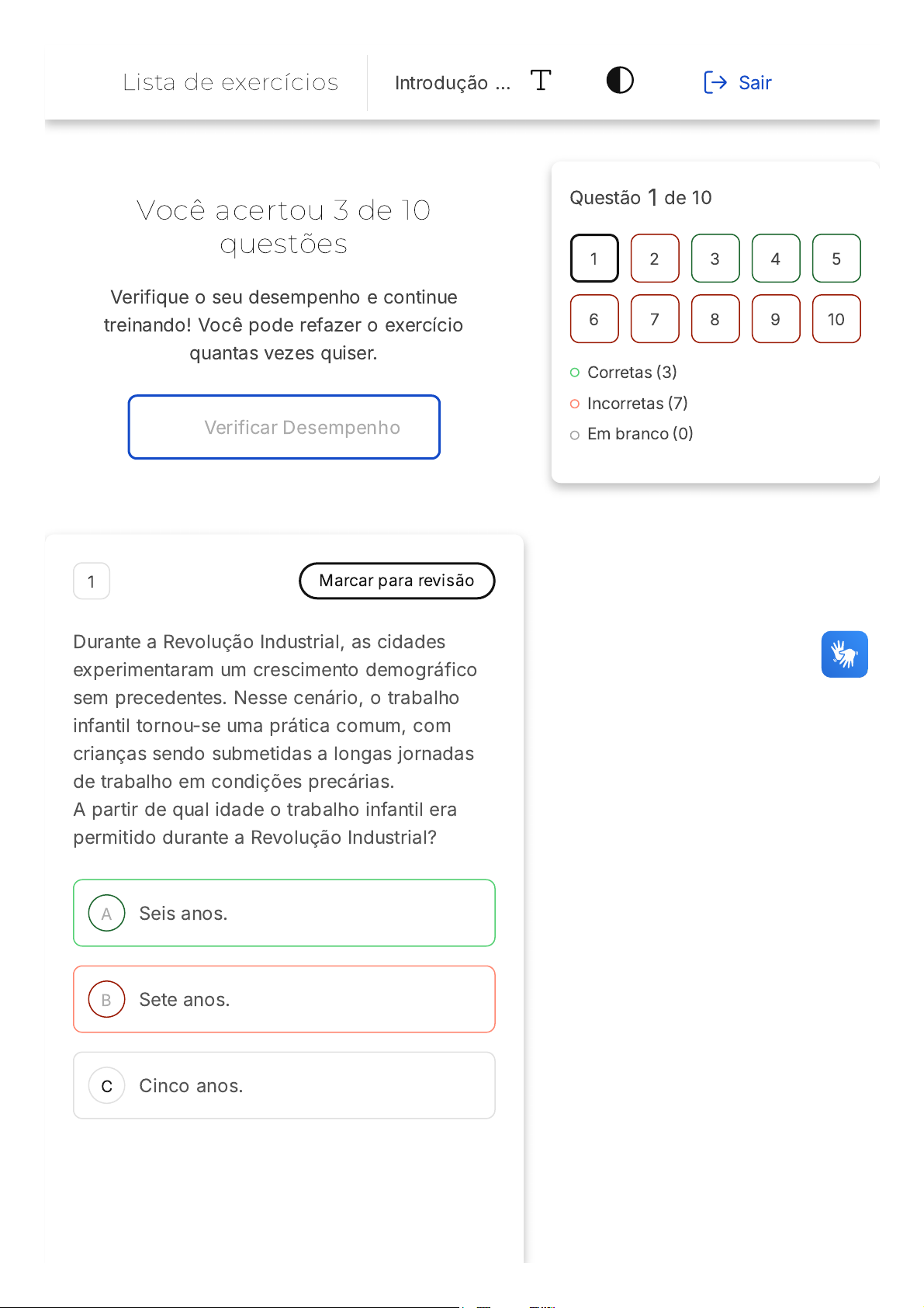 19/03/2026 17:22 https://estacio.saladeavaliacoes.com.br/exercicio/69bc5af6d7f597bfea59aca6/gabarito/ https://estacio.saladeavaliacoes.com.br/exercicio/69bc5af6d7f597bfea59aca6/gabarito/ 1/13 Você acertou 3 de 10 questões Verifique o seu desempenho e continue treinando! Você pode refazer o exercício quantas vezes quiser. Verificar Desempenho A B C 1 Marcar para revisão Durante a Revolução Industrial, as cidades experimentaram um crescimento demográfico sem precedentes. Nesse cenário, o trabalho infantil tornou-se uma prática comum, com crianças sendo submetidas a longas jornadas de trabalho em condições precárias. A partir de qual idade o trabalho infantil era permitido durante a Revolução Industrial? Seis anos. Sete anos. Cinco anos. Questão 1 de 10 Corretas �3� Incorretas �7� Em branco �0� 1 2 3 4 5 6 7 8 9 10 Lista de exercícios Introdução … Sair 19/03/2026 17:22 https://estacio.saladeavaliacoes.com.br/exercicio/69bc5af6d7f597bfea59aca6/gabarito/ https://estacio.saladeavaliacoes.com.br/exercicio/69bc5af6d7f597bfea59aca6/gabarito/ 2/13 D E Quatro anos. Oito anos. Resposta incorreta Opa! A alternativa correta é a letra A. Confira o gabarito comentado! Gabarito Comentado Durante a Revolução Industrial, o trabalho infantil tornou-se uma prática amplamente disseminada. Conforme mencionado no texto fornecido, crianças a partir dos seis anos de idade eram permitidas a trabalhar. Estas crianças eram frequentemente submetidas a longas horas de trabalho, muitas vezes em condições insalubres e perigosas. 2 Marcar para revisão A Sociologia, enquanto disciplina, visa entender e analisar a complexidade das interações _____. Durante a Revolução Industrial, houve um aumento significativo na exploração do trabalho infantil. Nesse contexto, as crianças não apenas ajudavam nas tarefas _____, mas eram submetidas a longas horas de trabalho em ambientes industriais. O trabalho infantil era permitido a partir dos _____ anos de idade. Assinale a alternativa que preenche corretamente as lacunas. 19/03/2026 17:22 https://estacio.saladeavaliacoes.com.br/exercicio/69bc5af6d7f597bfea59aca6/gabarito/ https://estacio.saladeavaliacoes.com.br/exercicio/69bc5af6d7f597bfea59aca6/gabarito/ 3/13 A B C D E sociais, rurais, seis. industriais, urbanas, dez. rurais, sociais, doze. sociais, industriais, oito. individuais, rurais, dez. Resposta incorreta Opa! A alternativa correta é a letra A. Confira o gabarito comentado! Gabarito Comentado A Sociologia é uma ciência que se dedica ao estudo das interações sociais e das estruturas e funções da sociedade. Durante a Revolução Industrial, muitas transformações socioeconômicas ocorreram, incluindo a exploração exacerbada do trabalho infantil. Embora as crianças tenham historicamente ajudado em tarefas rurais, a Revolução Industrial as viu sendo exploradas em ambientes industriais por longas horas. Era comum durante esse período que crianças tão jovens quanto seis anos fossem permitidas a trabalhar. 3 Marcar para revisão 19/03/2026 17:22 https://estacio.saladeavaliacoes.com.br/exercicio/69bc5af6d7f597bfea59aca6/gabarito/ https://estacio.saladeavaliacoes.com.br/exercicio/69bc5af6d7f597bfea59aca6/gabarito/ 4/13 A B C D E Ao observar o surgimento da sociologia, nota- se uma confluência de fatores históricos, políticos e culturais. Diferentes escolas de pensamento surgiram, proporcionando variadas perspectivas sobre as relações e estruturas sociais. Considerando o texto base e os conceitos estudados em sociologia, assinale a alternativa que apresenta uma escola de pensamento sociológico que surgiu no contexto da industrialização e urbanização da Europa no século XIX. Estruturalismo. Positivismo. Existencialismo. Pragmatismo. Marxismo. Resposta correta Parabéns, você selecionou a alternativa correta. Confira o gabarito comentado! Gabarito Comentado O Positivismo, liderado por Auguste Comte no século XIX, emergiu em um contexto de rápidas transformações sociais, tecnológicas e econômicas na Europa, particularmente durante a industrialização e urbanização. Essa escola de pensamento sociológico focava na organização social 19/03/2026 17:22 https://estacio.saladeavaliacoes.com.br/exercicio/69bc5af6d7f597bfea59aca6/gabarito/ https://estacio.saladeavaliacoes.com.br/exercicio/69bc5af6d7f597bfea59aca6/gabarito/ 5/13 A B C e na crença de que o conhecimento científico poderia contribuir para a melhoria da sociedade. As demais alternativas, embora representem escolas de pensamento ou movimentos filosóficos, não têm a mesma relação direta com o contexto sociológico do século XIX na Europa. 4 Marcar para revisão Uma universidade decidiu criar um novo curso de Sociologia. Durante o planejamento, houve debates sobre a importância de incluir Auguste Comte e o positivismo funcionalista no currículo. Considerando o texto, analise as afirmativas abaixo. I. Auguste Comte é considerado o fundador da Sociologia. II. O positivismo funcionalista não tem relevância no estudo contemporâneo da Sociologia. III. Comte defendeu a utilização de métodos de ciências como Matemática e Física na Sociologia. Avalie as alternativas. Apenas a afirmativa I está correta. Apenas as afirmativas I e III estão corretas. Apenas a afirmativa II está correta. 19/03/2026 17:22 https://estacio.saladeavaliacoes.com.br/exercicio/69bc5af6d7f597bfea59aca6/gabarito/ https://estacio.saladeavaliacoes.com.br/exercicio/69bc5af6d7f597bfea59aca6/gabarito/ 6/13 D E A B Apenas as afirmativas II e III estão corretas. Todas as afirmativas estão corretas. Resposta correta Parabéns, você selecionou a alternativa correta. Confira o gabarito comentado! Gabarito Comentado A afirmativa I está correta, pois Auguste Comte é frequentemente reconhecido como o fundador da Sociologia. A afirmativa II está incorreta, pois o positivismo funcionalista, embora tenha críticos, ainda é relevante no estudo da Sociologia contemporânea. A 
