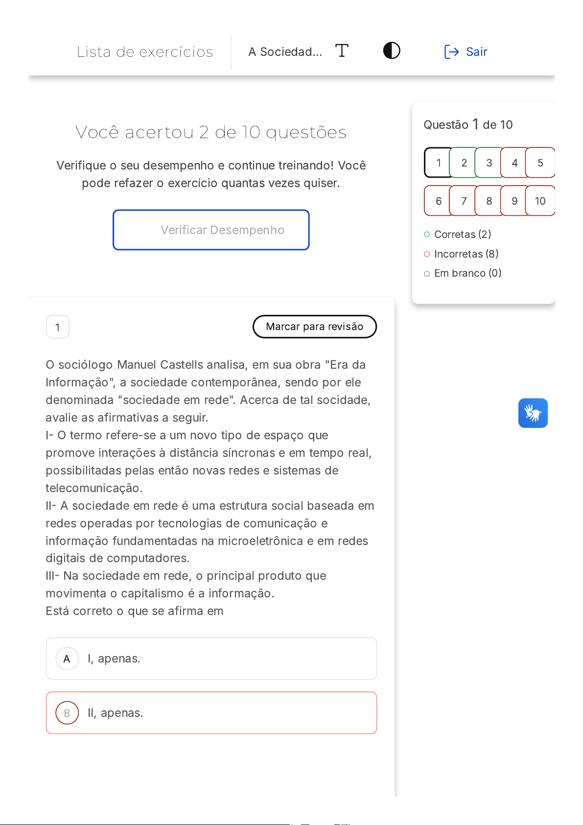 19/03/2026 17:25 https://estacio.saladeavaliacoes.com.br/exercicio/69bc5b86d7f597bfea59c3fe/gabarito/ https://estacio.saladeavaliacoes.com.br/exercicio/69bc5b86d7f597bfea59c3fe/gabarito/ 1/13 Você acertou 2 de 10 questões Verifique o seu desempenho e continue treinando! Você pode refazer o exercício quantas vezes quiser. Verificar Desempenho A B 1 Marcar para revisão O sociólogo Manuel Castells analisa, em sua obra "Era da Informação", a sociedade contemporânea, sendo por ele denominada "sociedade em rede". Acerca de tal socidade, avalie as afirmativas a seguir. I� O termo refere-se a um novo tipo de espaço que promove interações à distância síncronas e em tempo real, possibilitadas pelas então novas redes e sistemas de telecomunicação. II� A sociedade em rede é uma estrutura social baseada em redes operadas por tecnologias de comunicação e informação fundamentadas na microeletrônica e em redes digitais de computadores. III� Na sociedade em rede, o principal produto que movimenta o capitalismo é a informação. Está correto o que se afirma em I, apenas. II, apenas. Questão 1 de 10 Corretas �2� Incorretas �8� Em branco �0� 1 2 3 4 5 6 7 8 9 10 Lista de exercícios A Sociedad… Sair 19/03/2026 17:25 https://estacio.saladeavaliacoes.com.br/exercicio/69bc5b86d7f597bfea59c3fe/gabarito/ https://estacio.saladeavaliacoes.com.br/exercicio/69bc5b86d7f597bfea59c3fe/gabarito/ 2/13 C D E I e II, apenas. II e III, apenas. I, II e III. Resposta incorreta Opa! A alternativa correta é a letra E. Confira o gabarito comentado! Gabarito Comentado A resposta é: I, II e III estão corretas. As interações à distância, em tempo real e síncronas, são possíveis graças às redes e sistemas de telecomunicação, como mencionado na afirmativa I. O conceito de "sociedade em rede" de Manuel Castells se refere a uma estrutura social que é influenciada e moldada pelas tecnologias de informação e comunicação, como está exposto na afirmativa II. Por fim, nesse contexto, a informação é o principal produto que movimenta o capitalismo, como indicado na afirmativa III. 2 Marcar para revisão Parte dos pensadores contemporâneos acredita que a sociedade esteja passando por um processo conhecido como pós-verdade. Umberto Eco dizia que "o drama da internet é que ela promoveu o idiota da aldeia ao portador da verdade". O autor quer dizer que, com a internet, qualquer sujeito social devidamente conectado tem acesso à produção e publicação de conteúdo. 19/03/2026 17:25 https://estacio.saladeavaliacoes.com.br/exercicio/69bc5b86d7f597bfea59c3fe/gabarito/ https://estacio.saladeavaliacoes.com.br/exercicio/69bc5b86d7f597bfea59c3fe/gabarito/ 3/13 A B C D E Disponível em https://brasil.estadao.com.br/blogs/macaco- eletrico/desculpe-umberto-eco/. Contudo, esta verdade apontada pelo filósofo italiano pode ter consequências drásticas para a democracia quando se tem uma produção em larga escala de __________________. Decretos e leis. Fakenews. Normas e regulamentos. Publicidade institucional. Socialismo chinês. Resposta correta Parabéns, você selecionou a alternativa correta. Confira o gabarito comentado! Gabarito Comentado A alternativa correta é: "fakenews". O filósofo Umberto Eco, em sua citação, alerta para o perigo da disseminação de informações não verificadas ou falsas na internet, que podem ser produzidas e compartilhadas por qualquer pessoa. Isso pode ter consequências drásticas para a democracia, pois a disseminação em larga escala de notícias falsas pode influenciar a opinião pública e distorcer a realidade. As eleições norte-americanas, por exemplo, evidenciaram que o compartilhamento de notícias falsas não era tão espontâneo quanto se pensava, reforçando a 19/03/2026 17:25 https://estacio.saladeavaliacoes.com.br/exercicio/69bc5b86d7f597bfea59c3fe/gabarito/ https://estacio.saladeavaliacoes.com.br/exercicio/69bc5b86d7f597bfea59c3fe/gabarito/ 4/13 A B C D E necessidade de se ter cuidado com as informações que circulam na internet. 3 Marcar para revisão UFSCAR 2007 Esse mundo novo de extermínio em massa e aniquilação cultural patrocinados pelo Estado deu origem a um novo termo - genocídio, que surgiu em 1944 (...) �Mark Mazower. Continente sombrio. SP� Companhia das Letras, 2001.) O termo genocídio foi historicamente cunhado com o extermínio dos anarquistas ucranianos durante a revolução bolchevique. dos judeus durante a vigência do nazismo. dos romenos no seu processo de independência. dos etíopes na invasão italiana. dos zulus durante o governo racista da África do Sul. Resposta correta Parabéns, você selecionou a alternativa correta. Confira o gabarito comentado! Gabarito Comentado O termo genocídio foi cunhado em 1944 pelo jurista Raphael Lemkin, para designar o extermínio 19/03/2026 17:25 https://estacio.saladeavaliacoes.com.br/exercicio/69bc5b86d7f597bfea59c3fe/gabarito/ https://estacio.saladeavaliacoes.com.br/exercicio/69bc5b86d7f597bfea59c3fe/gabarito/ 5/13 A B C D E sistemático de um grupo étnico, racial, religioso ou nacional. O termo foi utilizado pela primeira vez para descrever o Holocausto, o genocídio dos judeus durante a Segunda Guerra Mundial. 4 Marcar para revisão Na Internet, ela é uma rede social criada em 2004 que permite comunicar com um grupo de amigos predefinido �Grupos�, aceitando os amigos e restringindo o acesso de estranhos aos seus dados. Correio Eletrônico. Gmail. Blog. Facebook. Weblog. Resposta incorreta Opa! A alternativa correta é a letra D. Confira o gabarito comentado! Gabarito Comentado O Facebook é a rede social que se encaixa na descrição do enunciado. Foi criado em 2004 e permite a comunicação com um grupo de amigos predefinido, além de possibilitar a aceitação de novos amigos e a 19/03/2026 17:25 https://estacio.saladeavaliacoes.com.br/exercicio/69bc5b86d7f597bfea59c3fe/gabarito/ https://estacio.saladeavaliacoes.com.br/exercicio/69bc5b86d7f597bfea