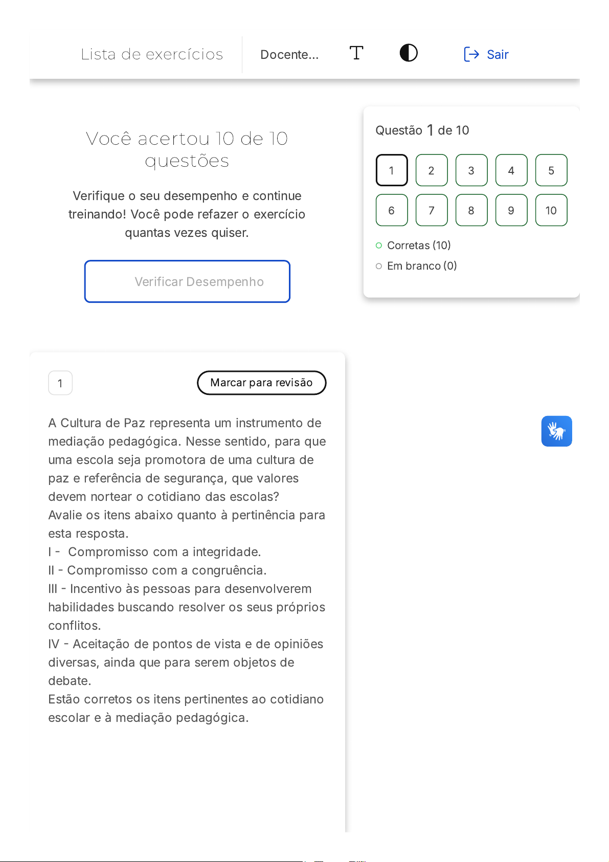 21/03/2026 19:16 https://estacio.saladeavaliacoes.com.br/exercicio/69bf18785f43b01fd92a957c/gabarito/ https://estacio.saladeavaliacoes.com.br/exercicio/69bf18785f43b01fd92a957c/gabarito/ 1/15 Você acertou 10 de 10 questões Verifique o seu desempenho e continue treinando! Você pode refazer o exercício quantas vezes quiser. Verificar Desempenho 1 Marcar para revisão A Cultura de Paz representa um instrumento de mediação pedagógica. Nesse sentido, para que uma escola seja promotora de uma cultura de paz e referência de segurança, que valores devem nortear o cotidiano das escolas? Avalie os itens abaixo quanto à pertinência para esta resposta. I � Compromisso com a integridade. II � Compromisso com a congruência. III � Incentivo às pessoas para desenvolverem habilidades buscando resolver os seus próprios conflitos. IV � Aceitação de pontos de vista e de opiniões diversas, ainda que para serem objetos de debate. Estão corretos os itens pertinentes ao cotidiano escolar e à mediação pedagógica. Questão 1 de 10 Corretas �10� Em branco �0� 1 2 3 4 5 6 7 8 9 10 Lista de exercícios Docente… Sair 21/03/2026 19:16 https://estacio.saladeavaliacoes.com.br/exercicio/69bf18785f43b01fd92a957c/gabarito/ https://estacio.saladeavaliacoes.com.br/exercicio/69bf18785f43b01fd92a957c/gabarito/ 2/15 A B C D E I, II, III I, II, IV I, III, IV II, III, IV I, II, III, IV Resposta correta Parabéns, você selecionou a alternativa correta. Confira o gabarito comentado! Gabarito Comentado Para que uma escola seja promotora de uma cultura de paz e referência de segurança, é necessário que ela seja norteada por valores como respeito mútuo, confiança, empoderamento, conexão, tolerância, integridade, congruência, incentivo ao desenvolvimento de habilidades para a resolução de conflitos, aceitação de pontos de vista e opiniões diversas, valorização do outro, reconhecimento, encorajamento, escuta, compartilhamento de ideias, aceitação de que erros acontecem e que aprendemos com eles, importância dos sentimentos, necessidade e direitos, dentre outros. Portanto, todos os itens �I, II, III, IV) estão corretos e são pertinentes ao cotidiano escolar e à mediação pedagógica. 21/03/2026 19:16 https://estacio.saladeavaliacoes.com.br/exercicio/69bf18785f43b01fd92a957c/gabarito/ https://estacio.saladeavaliacoes.com.br/exercicio/69bf18785f43b01fd92a957c/gabarito/ 3/15 A B C D E 2 Marcar para revisão A ação mediadora por parte do docente pode e deve representar um compromisso social. Como a ação mediadora nas escolas pode contribuir para modificar as estruturas de exclusão social naturalizadas na sociedade? Promovendo a centralidade do(a) docente. Permitindo aos alunos fazerem o que desejam livremente. Atendendo as ordens da direção e da hierarquia. Valorizando os saberes curricularizados. Valorizando os saberes pessoais e locais. Resposta correta Parabéns, você selecionou a alternativa correta. Confira o gabarito comentado! Gabarito Comentado A ação mediadora do docente, quando valoriza os saberes pessoais e locais, contribui para a modificação das estruturas de exclusão social que estão naturalizadas na sociedade. Isso ocorre porque, ao reconhecer e valorizar a diversidade e a singularidade dos alunos, a 21/03/2026 19:16 https://estacio.saladeavaliacoes.com.br/exercicio/69bf18785f43b01fd92a957c/gabarito/ https://estacio.saladeavaliacoes.com.br/exercicio/69bf18785f43b01fd92a957c/gabarito/ 4/15 A B C prática educativa torna-se mais eficaz. Além disso, a promoção de ações colaborativas e de respeito às singularidades faz com que as salas de aula possam se tornar um reflexo de uma sociedade mais justa e solidária. Portanto, a alternativa correta é a E� "Valorizando os saberes pessoais e locais". 3 Marcar para revisão Estar na escola ou em outro ambiente para aprender, além de ser um grande estímulo, é também um grande desafio. Na aprendizagem, o papel do(a) docente como mediador(a) pedagógico(a) pode ser observado quando: I - traz centralidade para os aspectos que sejam de fato cruciais. II - atribui significado à informação compartilhada. III - torna o estímulo ambiental inicial significativo. IV - favorece o desenvolvimento, não o resultado, como princípio. Estão corretas as afirmativas: I, II, III I, II, IV I, III, IV 21/03/2026 19:16 https://estacio.saladeavaliacoes.com.br/exercicio/69bf18785f43b01fd92a957c/gabarito/ https://estacio.saladeavaliacoes.com.br/exercicio/69bf18785f43b01fd92a957c/gabarito/ 5/15 D E II, III, IV I, II, III, IV Resposta correta Parabéns, você selecionou a alternativa correta. Confira o gabarito comentado! Gabarito Comentado O papel do docente como mediador pedagógico é multifacetado e envolve várias ações importantes. Primeiro, ele deve trazer centralidade para os aspectos que são realmente cruciais para a aprendizagem �I�. Em segundo lugar, ele deve atribuir significado à informação compartilhada �II�, tornando-a relevante e compreensível para os alunos. Além disso, o docente deve tornar o estímulo ambiental inicial significativo �III�, criando um ambiente de aprendizagem propício. Por fim, o docente deve favorecer o desenvolvimento, não o resultado, como princípio �IV�, enfatizando o processo de aprendizagem em vez de apenas o resultado final. Portanto, todas as afirmativas estão corretas �I, II, III, IV�, o que faz da alternativa E a resposta correta. 4 Marcar para revisão O docente é um dos mais importantes agentes mediadores e, para promover a ação 21/03/2026 19:16 https://estacio.saladeavaliacoes.com.br/exercicio/69bf18785f43b01fd92a957c/gabarito/ https://estacio.saladeavaliacoes.com.br/exercicio/69bf18785f43b01fd92a957c/gabarito/ 6/15 A B C D E mediadora na instituição educativa, ele precisa estar atento aos seus papéis. Pode ser considerado uma ação mediadora bem-sucedida quando: Tutela-se plenamente o aluno. Atende-se aos desejos da família. Cumpre