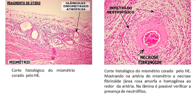 FRAGMENTO DE ÚTERO GLÂNDULAS ENDOMETRIAIS ATRÓFICAS INFILTRADO NEUTROFILICO NECROSE MIOMETRIO FIBRINOIDE Corte histológico do miométrio Corte histológico do miométrio corado pelo HE. corado pelo HE. Mostrando na artéria do miométrio a necrose (área rosa amorfa e homogênea ao redor da artéria. Na lâmina é verificar a presença de