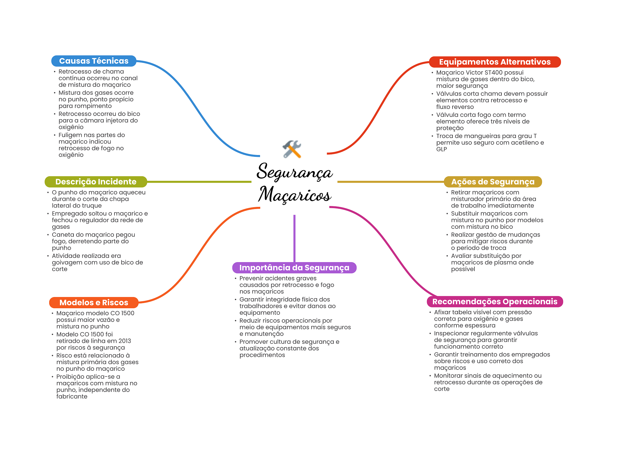 Causas Técnicas Equipamentos Alternativos Retrocesso de chama Maçarico Victor ST400 possui contínua ocorreu no canal mistura de gases dentro do bico, de mistura do maçarico maior segurança Mistura dos gases ocorre Válvulas corta chama devem possuir no punho, ponto propício elementos contra retrocesso e para rompimento fluxo reverso Retrocesso ocorreu do bico Válvula corta fogo com termo para a câmara injetora do elemento oferece três níveis de oxigênio proteção Fuligem nas partes do Troca de mangueiras para grau T maçarico indicou permite uso seguro com acetileno e retrocesso de fogo no GLP oxigênio Segurança Descrição Incidente Ações de Segurança punho do maçarico aqueceu Maçaricos Retirar maçaricos com durante corte da chapa misturador primário da área lateral do truque de trabalho imediatamente Empregado soltou maçarico e Substituir maçaricos com fechou regulador da rede de mistura no punho por modelos gases com mistura no bico Caneta do maçarico pegou Realizar gestão de mudanças fogo, derretendo parte do para mitigar riscos durante punho O período de troca Atividade realizada era Avaliar substituição por goivagem com uso de bico de maçaricos de plasma onde corte Importância da Segurança possível Prevenir acidentes graves causados por retrocesso e fogo nos maçaricos Modelos e Riscos Garantir integridade física dos trabalhadores e evitar danos ao Recomendações Operacionais Maçarico modelo 1500 equipamento Afixar tabela visível com pressão possui maior vazão e Reduzir riscos operacionais por correta para oxigênio e gases mistura no punho meio de equipamentos mais seguros conforme espessura Modelo CO 1500 foi e manutenção Inspecionar regularmente válvulas retirado de linha em 2013 Promover cultura de segurança e de segurança para garantir por riscos à segurança atualização constante dos funcionamento correto Risco está relacionado à procedimentos Garantir treinamento dos empregados mistura primária dos gases sobre riscos e uso correto dos no punho do maçarico maçaricos Proibição aplica-se a Monitorar sinais de aquecimento ou maçaricos com mistura no retrocesso durante as operações de punho, independente do corte fabricante