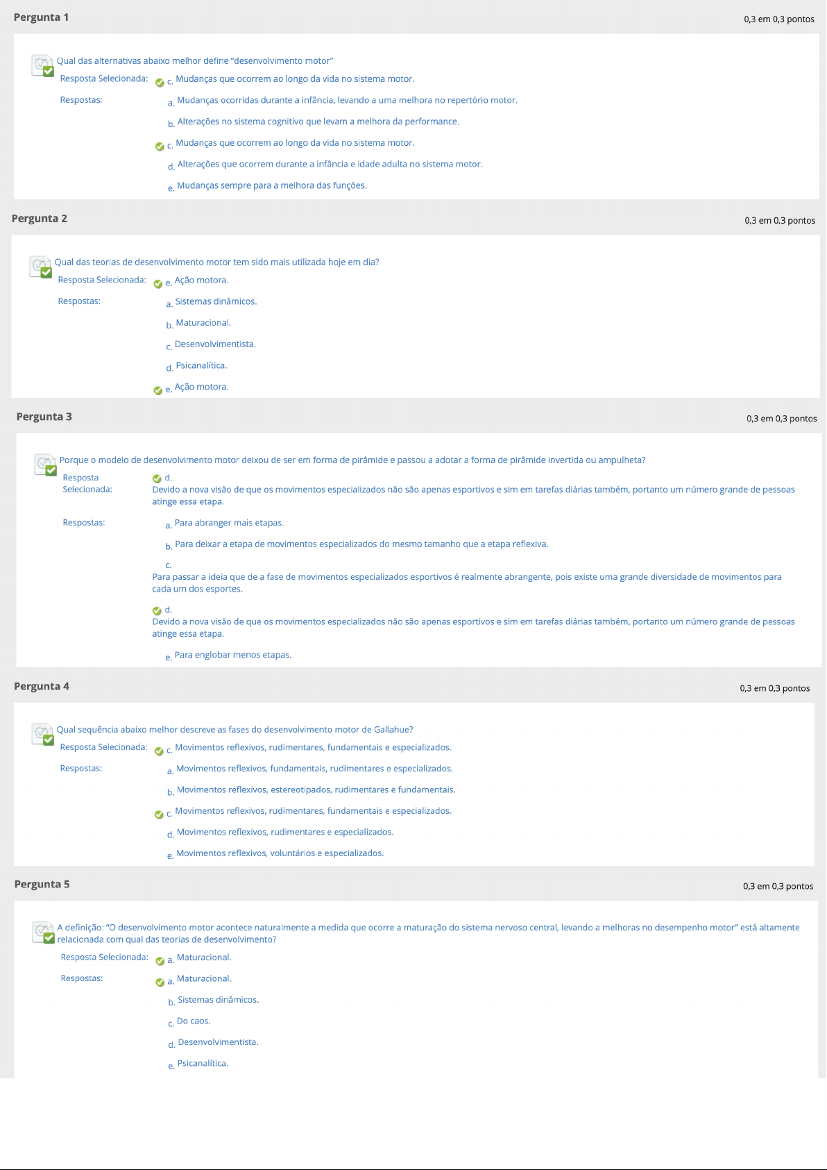 Pergunta 1 0,3 em 0,3 pontos Qual das alternativas abaixo melhor define "desenvolvimento motor" Resposta Selecionada: C. Mudanças que ocorrem ao longo da vida no sistema motor. Respostas: a. Mudanças ocorridas durante a infância, levando a uma melhora no repertório motor. b. Alterações no sistema cognitivo que levam a melhora da performance. Mudanças que ocorrem ao longo da vida no sistema motor. d. Alterações que ocorrem durante a infância e idade adulta no sistema motor. e. Mudanças sempre para a melhora das funções. Pergunta 2 0,3 em 0,3 pontos Qual das teorias de desenvolvimento motor tem sido mais utilizada hoje em dia? Resposta Selecionada: e. Ação motora. Respostas: a. Sistemas dinâmicos. b. Maturacional. C. Desenvolvimentista. d. Psicanalítica. e. Ação motora. Pergunta 3 0,3 em 0,3 pontos Porque modelo de desenvolvimento motor deixou de ser em forma de pirâmide e passou a adotar a forma de pirâmide invertida ou ampulheta? Resposta d. Selecionada: Devido a nova visão de que os movimentos especializados não são apenas esportivos e sim em tarefas diárias também, portanto um número grande de pessoas atinge essa etapa. Respostas: a. Para abranger mais etapas. b. Para deixar a etapa de movimentos especializados do mesmo tamanho que a etapa reflexiva. C. Para passar a ideia que de a fase de movimentos especializados esportivos é realmente abrangente, pois existe uma grande diversidade de movimentos para cada um dos esportes. d. Devido a nova visão de que os movimentos especializados não são apenas esportivos e sim em tarefas diárias também, portanto um número grande de pessoas atinge essa etapa. e. Para englobar menos etapas. Pergunta 4 0,3 em 0,3 pontos Qual sequência abaixo melhor descreve as fases do desenvolvimento motor de Gallahue? Resposta Selecionada: C. Movimentos reflexivos, rudimentares, fundamentais e especializados. Respostas: a. Movimentos reflexivos, fundamentais, rudimentares e especializados. b. Movimentos reflexivos, estereotipados, rudimentares e fundamentais. Movimentos reflexivos, rudimentares, fundamentais e especializados. d. Movimentos reflexivos, rudimentares e especializados. e. Movimentos reflexivos, voluntários e especializados. Pergunta 5 0,3 em 0,3 pontos A definição: "O desenvolvimento motor acontece naturalmente a medida que ocorre a maturação do sistema nervoso central, levando a melhoras no desempenho motor" está altamente relacionada com qual das teorias de desenvolvimento? Resposta Selecionada: a. Maturacional. Respostas: a. Maturacional. b. Sistemas dinâmicos. Do caos. d. Psicanalítica. e.Pergunta 6 0,3 em 0,3 pontos Assinale a alternativa que apresenta somente movimentos locomotores: Resposta Selecionada: d. Correr, saltar e galopar. Respostas: a. Andar, se equilibrar e saltar. b. Escrever, correr e rolar. Andar, galopar e agarrar. d. Correr, saltar e galopar. e. Deslizar, escalar e receber. Pergunta 7 0,3 em 0,3 pontos Durante processo de desenvolvimento motor vários fatores são determinantes para a formação do repertório motor de cada indivíduo, e justamente esses fatores são que tornam um indivíduo diferente do outro, pois passam por vivências diferentes dentro do ciclo desenvolvimental. Qual das alternativas abaixo apresenta os fatores mais importantes dentro do processo de desenvolvimento motor? Resposta b. Selecionada: ambiente familiar com tudo que ele abrange, como educação, exemplos oferecidos pelos mais velhos, e tipo de criação, os movimentos que indivíduo é estimulado a fazer dentro de suas tarefas diárias e a carga genética individual de cada um. Respostas: a. Os móveis disponíveis no ambiente, pois eles "ditam" as ações possíveis de serem realizadas, a família de cada pessoa, por representar a herança genética de cada um, e tipo de atividade física realizado. b. ambiente familiar com tudo que ele abrange, como educação, exemplos oferecidos pelos mais velhos, e tipo de criação, os movimentos que indivíduo é estimulado a fazer dentro de suas tarefas diárias e a carga genética individual de cada um. C. processo de maturação que é igual a todos os indivíduos e não depende de carga genética, o controle motor que é adquirido com a repetição de movimentos e aprendizagem dos movimentos, ou seja, como eles são ensinados influencia na maneira como serão executados. d. A velocidade do crescimento físico, que se for muito rápida ou lenta pode afetar os padrões de movimentos executados, a velocidade da maturação do sistema nervoso central que também precisa acontecer em uma velocidade padrão e desenvolvimento e aprimoramento das sinapses para levarem os impulsos elétricos rapidamente ao sistema efetor. e. crescimento de amadurecimento dos órgãos internos do corpo, que servirão de base para restante da formação corporal, ambiente familiar em que indivíduo é educado e o desenvolvimento das competências esportivas universais. Pergunta 8 0,3 em 0,3 pontos Durante processo de desenvolvimento motor, crianças aprendem a realizar novos movimentos que servirão de base para a realização futuramente de movimentos cotidianos. Inicialmente, o recém-nascido nasce com um repertório motor composto unicamente por movimentos necessários à sua sobrevivência e que servirão de base para a realização de movimentos mais elaborados, um exemplo destes movimentos são a sucção e os movimentos de chute alternando as pernas. Futuramente aprende a controlar pescoço, firmar a cabeça e rolar para a posição preferida (seja decúbito dorsal ou ventral) para futuramente direcionar os movimentos dos membros, como pegar um objeto. Depois de aproximadamente 10 meses bebê vai tentar ficar em pé para então conseguir dar os primeiros passos sozinho. Baseado no texto acima, assinale a alternativa que contém, respectivamente, os nomes dos tipos de movimentos que estão destacados: Resposta Selecionada: a. Movimentos reflexivos, fundamental, rudimentar, manipulativo,