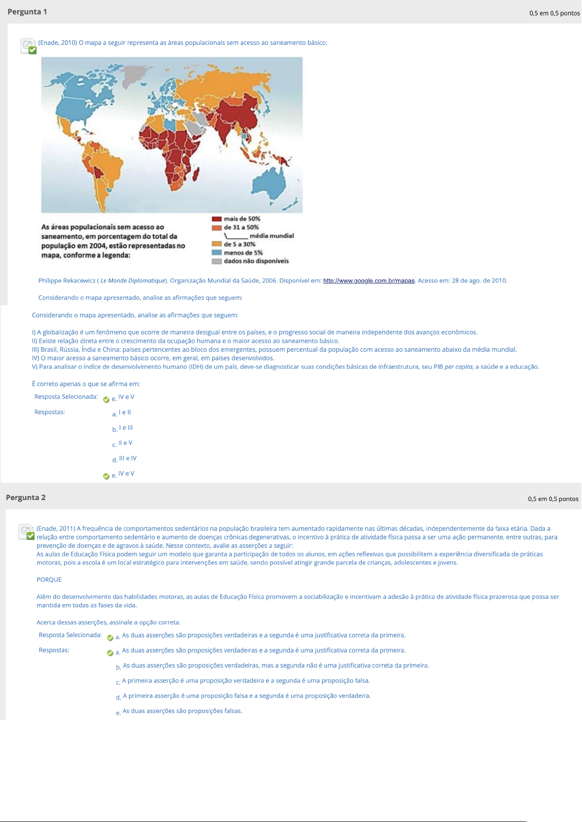 Pergunta 1 0,5 em 0,5 pontos (Enade, 2010) mapa a seguir representa as áreas populacionais sem acesso ao saneamento básico: mais de 50% As áreas populacionais sem acesso ao de 31 a 50% saneamento, em porcentagem do total da média mundial população em 2004, estão representadas no de 5 a 30% mapa, conforme a legenda: menos de 5% dados não disponíveis Philippe Rekacewicz Le Monde Diplomatique). Organização Mundial da Saúde, 2006. Disponível em: http://www.google.com.br/mapas. Acesso em: 28 de ago. de 2010. Considerando mapa apresentado, analise as afirmações que seguem: Considerando mapa apresentado, analise as afirmações que seguem: I) A globalização é um fenômeno que ocorre de maneira desigual entre os países, e progresso social de maneira independente dos avanços econômicos. II) Existe relação direta entre crescimento da ocupação humana e maior acesso ao saneamento básico. III) Brasil, Rússia, Índia e China: países pertencentes ao bloco dos emergentes, possuem percentual da população com acesso ao saneamento abaixo da média mundial. IV) maior acesso a saneamento básico ocorre, em geral, em países desenvolvidos. V) Para analisar índice de desenvolvimento humano (IDH) de um país, deve-se diagnosticar suas condições básicas de infraestrutura, seu PIB per capita, a saúde e a educação. É correto apenas que se afirma em: Resposta Selecionada: e. IVeV Respostas: a. b. III V d. III IV e. IV V Pergunta 2 0,5 em 0,5 pontos (Enade, 2011) A frequência de comportamentos sedentários na população brasileira tem aumentado rapidamente nas últimas décadas, independentemente da faixa etária. Dada a relação entre comportamento sedentário e aumento de doenças crônicas degenerativas, incentivo à prática de atividade física passa a ser uma ação permanente, entre outras, para prevenção de doenças e de agravos à saúde. Nesse contexto, avalie as asserções a seguir: As aulas de Educação Física podem seguir um modelo que garanta a participação de todos os alunos, em ações reflexivas que possibilitem a experiência diversificada de práticas motoras, pois a escola é um local estratégico para intervenções em saúde, sendo possível atingir grande parcela de crianças, adolescentes e jovens. PORQUE Além do desenvolvimento das habilidades motoras, as aulas de Educação promovem a sociabilização e incentivam a adesão à prática de atividade física prazerosa que possa ser mantida em todas as fases da vida. Acerca dessas asserções, assinale a opção correta. Resposta Selecionada: a. As duas asserções são proposições verdadeiras e a segunda é uma justificativa correta da primeira. Respostas: a. As duas asserções são proposições verdadeiras e a segunda é uma justificativa correta da primeira. b. As duas asserções são proposições verdadeiras, mas a segunda não é uma justificativa correta da primeira. A primeira asserção é uma proposição verdadeira e a segunda é uma proposição falsa. d. A primeira asserção é uma proposição falsa e a segunda é uma proposição verdadeira. e. As duas asserções são proposições falsas.Pergunta 3 0,5 em 0,5 pontos (Enade, 2013) Uma empresa de grande porte da área de produtos alimentícios instalada em uma pequena cidade de interior é responsável por parte da economia local, empregando um número expressivo de habitantes da cidade nos setores de produção, embalagem, estoque e distribuição. Consciente de sua responsabilidade social, a empresa decide criar um programa de qualidade de vida para seus empregados. Para tanto, contrata diferentes profissionais, pois entende que há necessidades específicas em cada setor. Um profissional de educação física e um profissional da fisioterapia são convidados a integrar a equipe multidisciplinar e desenvolver projeto pretendido. Nesta situação, são ações que esses profissionais podem desenvolver de forma a contribuir efetivamente na melhoria da qualidade de vida dos empregados da empresa: Identificar grupos de interesse em diferentes práticas corporais e, a partir de então, estabelecer as ofertas de atividades físicas coletivas, para que, dessa forma, ocorra maior aderência dos empregados às práticas. II- Propor sessões semanais de ginástica laboral, utilizando série padronizada de alongamento para que os empregados de todos os setores possam realizá-la de forma correta. III- Organizar campeonatos esportivos, exigindo índices de rendimento compatíveis com competições da região onde vivem os empregados, para que aqueles que representam a empresa em eventos esportivos possam ser treinados. IV- Criar estratégias de comunicação variadas, como palestras ou divulgação em cartazes e folhetos, para disseminar orientações regulares sobre a postura corporal correta a ser adotada por cada empregado em suas diferentes funções. V- Promover eventos de recreação e lazer, buscando integrar os empregados e seus familiares, levando em consideração a cultura corporal local na escolha das atividades propostas. É correto apenas que se afirma em: Resposta Selecionada: C. Respostas: a. III b. III IV IV d. II, III V e. II, IV V Pergunta 4 0,5 em 0,5 pontos A expressão "qualidade de vida" tem sido utilizada desde os anos 60, principalmente com força política, sendo que primeiro a utilizar esta expressão foi presidente dos Estados Unidos Lyndon Johnson em seu discurso. conhecimento popular se apropriou desta expressão como uma forma de simplificar a melhora ou um padrão elevado de bem-estar nas vidas dos indivíduos, seja de ordem social, emocional ou econômica. Assinale a alternativa correta a respeito do conceito de qualidade de vida. Resposta a. Selecionada: Qualidade de vida é um pressuposto totalmente humano e está relacionado ao grau de satisfação que é encontrado nos contextos da vida familiar, social, amorosa, na própria estética e no ambiente em que se está inserido. Respostas: a. Qualidade 
