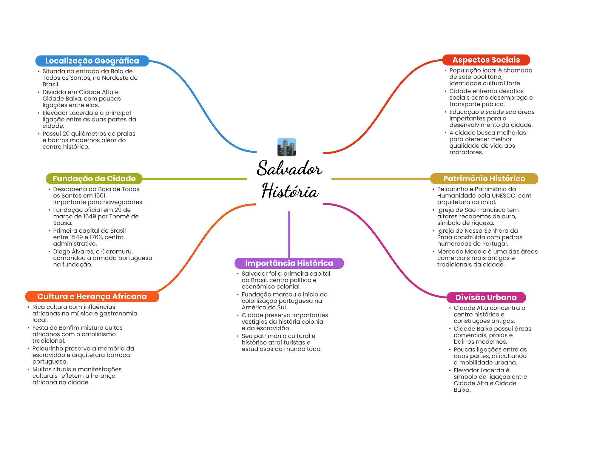 Localização Geográfica Aspectos Sociais Situada na entrada da Baía de População local é chamada Todos Santos, no Nordeste do de soteropolitana, Brasil. identidade cultural forte. Dividida em Cidade Alta e Cidade enfrenta desafios Cidade Baixa, com poucas sociais como desemprego e ligações entre elas. transporte público. Elevador Lacerda é a principal Educação e saúde são áreas ligação entre as duas partes da importantes para cidade. desenvolvimento da cidade. Possui 20 quilômetros de praias A cidade busca melhorias e bairros modernos além do para oferecer melhor centro histórico. qualidade de vida aos moradores. Salvador Fundação da Cidade Patrimônio Histórico Descoberta da Baía de Todos História Pelourinho é Patrimônio da OS Santos em 1501, Humanidade pela UNESCO, com importante para navegadores. arquitetura colonial. Fundação oficial em 29 de Igreja de São Francisco tem março de 1549 por Thomé de altares recobertos de ouro, Sousa. símbolo de riqueza. Primeira capital do Brasil Igreja de Nossa Senhora da entre 1549 e 1763, centro Praia construída com pedras administrativo. numeradas de Portugal. Diogo Álvares, Caramuru, Mercado Modelo é uma das áreas comandou a armada portuguesa comerciais mais antigas e na fundação. Importância Histórica tradicionais da cidade. Salvador foi a primeira capital do Brasil, centro político e econômico colonial. Cultura e Herança Africana Fundação marcou início da Divisão Urbana colonização portuguesa na Rica cultura com influências América do Sul. Cidade Alta concentra africanas na música e gastronomia Cidade preserva importantes centro histórico e local. vestígios da história colonial construções antigas. Festa do Bonfim mistura cultos e da escravidão. Cidade Baixa possui áreas africanos com catolicismo Seu patrimônio cultural e comerciais, praias e tradicional. histórico atrai turistas e bairros modernos. Pelourinho preserva a memória da estudiosos do mundo todo. Poucas ligações entre as escravidão e arquitetura barroca duas partes, dificultando portuguesa. a mobilidade urbana. Muitos rituais e manifestações Elevador Lacerda é culturais refletem a herança símbolo da ligação entre africana na cidade. Cidade Alta e Cidade Baixa.