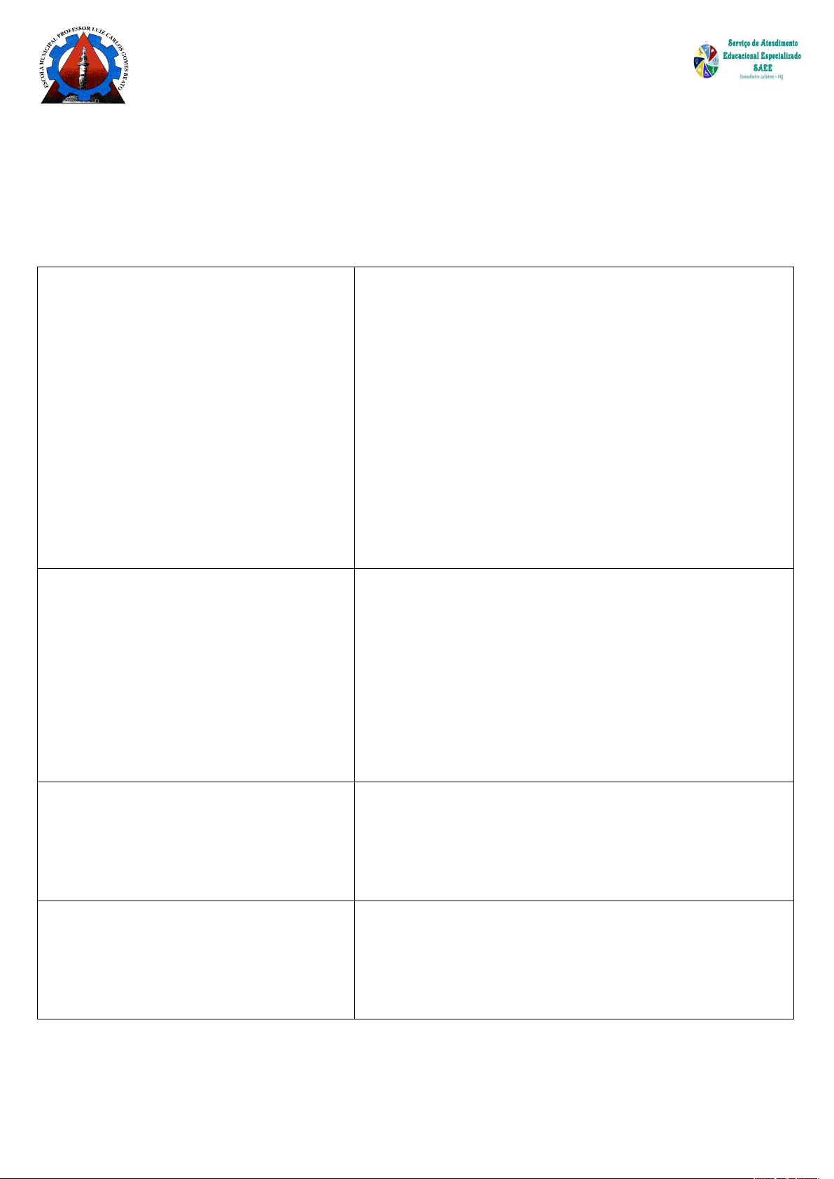 ESCOLA MUNICIPAL “PROFESSOR LUIZ CARLOS GOMES BEATO” Ensino Fundamental dos Anos Iniciais e Finais / CNPJ: 03.041.202/0001-70 Lei 4063/96 de 25/10/96 - Portaria nº. 040/97 de 08/07/97 SEE Rua Dias de Souza, 353 – Bairro de Lourdes, Conselheiro Lafaiete – MG PLANO DE AULA DIÁRIO – SAFE Nome do aluno(a):__________________________Escolaridade:____________ Período (1º semestre): ___/___/___ a ___/___/___. Data: ___/___/___ Atendimento a ser desenvolvido/ estimulado ( ) Desenvolvimento de funções cognitivas (visual, auditiva, tátil, espacial, temporal) ( ) Ensino das técnicas de cálculo no Soroban ( ) Desenvolvimento de vida autônoma ( ) Ensino do uso de recursos ópticos e não ópticos ( ) Enriquecimento curricular ( ) Ensino do uso da Comunicação Alternativa e Aumentativa (CAA) ( ) Ensino da informática acessível ( ) Ensino de técnicas para orientação e mobilidade ( ) Ensino da Língua Brasileira de Sinais (Libras) ( ) Ensino do Sistema Braille ( ) Ensino da Língua Portuguesa como Segunda Língua ( ) AVD/AVP ( )Atenção ( ) Memória ( ) Social ( ) Linguagem ( ) Motora ( ) Pensamento ( ) Raciocínio lógico matemático Áreas do desenvolvimento a serem trabalhadas e seus respectivos descritores ( ) Cognitiva: Percepção e discriminação, memória, atenção, raciocínio lógico matemático e ( ) Motora: motricidade fina, motricidade ampla (coordenação geral, estética e dinâmica), orientação, mobilidade, adequação postural e acessibilidade espacial. ( ) Expressão oral, escrita e gestual: Expressão livre por meio das Artes, Língua Portuguesa na modalidade escrita, sistema Braile, Comunicação Alternativa e Aumentativa (CAA). ( ) Afetividade - Autoestima, confiança, comportamento e interação. ( )Informática acessível ( )Autocuidado Recursos Materiais/Instrumentos didáticos-pedagógicos ou técnicos ( ) Software educativo ___________________________ _____________________________________________ ( ) Material confeccionado/adaptado _______________ _____________________________________________ ( ) outros ____________________________________ Objetivos a serem desenvolvidos de acordo com os itens acima descritos _____________________________________________ _____________________________________________ _____________________________________________ _____________________________________________ _____________________________________________ Observações: ________________________________________________________________________________________________________________________________________________________________ ________________________________________________________________________________ O objetivo a ser desenvolvido com o aluno encontra-se em folha anexa, conforme a marcação. O período compreendido encontra-se no controle da frequência. ______________________________________ Assinatura do professor do AEE Com base nos itens descritos, os objetivos a serem desenvolvidos são: 1. Cognitiva: - Desenvolver habilidades de percepção e discriminação através de atividades sensoriais. - Aprimorar a memória por meio de exercícios de memorização e recordação. - Fomentar a atenção em diversas tarefas e situações. - Estimular o raciocínio lógico matemático por meio de quebra-cabeças, jogos e problemas. - Promover a conceitualização através de atividades de categorização e classificação. 2. Motora: - Aprimorar a motricidade fina por meio de atividades que envolvam precisão manual, como recoltar, desenhar e montar. - Desenvolver a motricidade ampla através de exercícios que estimulem a coordenação geral, a estética e a dinâmica do movimento. Promover a orientação espacial e a mobilidade através de atividades de exploração do ambiente e deslocamento. - Estimular a adequação postural por meio de exercícios de fortalecimento e equilíbrio. - Proporcionar acessibilidade espacial adaptando o ambiente para facilitar a locomoção e o acesso. 3. Expressão oral, escrita e gestual: - Incentivar a expressão livre por meio das artes, como pintura, escultura e música. - Desenvolver a habilidade na lingua portuguesa na modalidade escrita através de exercícios de escrita e interpretação de textos. - Introduzir o sistema Braille para aqueles que necessitam e promover o aprendizado e uso adequado. Implementar estratégias de Comunicação Alternativa e Aumentativa (CAA) para facilitar a expressão e comunicação. 4. Afetividade: - Promover a autoestima através de atividades que valorizem as conquistas individuais. -Estimular a confiança por meio do reconhecimento e apoio às habilidades e potencialidades de cada pessoa. - Fomentar comportamentos positivos e interações sociais saudáveis em diferentes contextos. 5. Informática acessível: - Proporcionar acesso a tecnologias e recursos digitais adaptados às necessidades individuais. - Oferecer treinamento e suporte para o uso eficaz de dispositivos e softwares acessíveis. 6. Autocuidado: - Desenvolver a habilidade de autocuidado, como higiene pessoal, alimentação saudável e vestimenta apropriada. - Promover à independência nas atividades diárias, capacitando as pessoas a cuidarem de si mesmas com autonomia. ______________________________________ Assinatura do professor do AEE image1.jpg image2.png