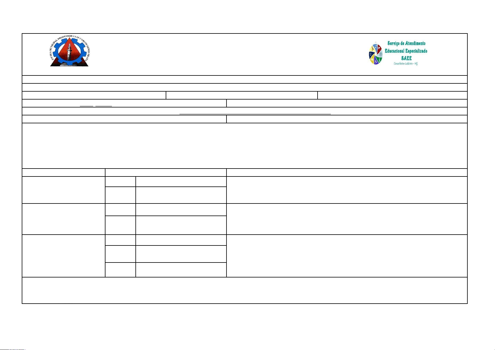 ESCOLA MUNICIPAL “PROFESSOR LUIZ CARLOS GOMES BEATO” Ensino Fundamental dos Anos Iniciais e Finais / CNPJ: 03.041.202/0001-70 Lei 4063/96 de 25/10/96 - Portaria nº. 040/97 de 08/07/97 SEE Rua Dias de Souza, 353 – Bairro de Lourdes, Conselheiro Lafaiete – MG AVALIAÇÃO PEDAGÓGICA¹ - EDUCAÇÃO ESPECIAL - AEE² Nome do estudante: Ano e modalidade que está matriculado: Turma: Turno: Data de Nascimento: / / Idade: Estudante tem aposio especializado em sala? ( ) SIM, citar: ( ) NÃO Diagnóstico (CID/DSM): Nome do médico e especialidade: Todos os itens avaliados, referentes a cada área em destaque na planilha, devem ter a coluna preenchida com a legenda: D (Desenvolvido); ED (Em Desenvolvimento); ND (Não desenvolvido). Esta avaliação deve ser realizada a partir das características do sujeito, bem como seu contexto de vida, tais como: histórico, ritmo de aprendizagem, potencialidades apresentadas, limitações identificadas, níveis de aprendizagem, entre outros aspectos. Busca-se, nesse registro, identificar as barreiras impeditivas existentes para o processo de aprendizagem e desenvolvimento global. Função Cognitiva Observação Consideração da avaliação PERCEPÇÃO VISUAL Discrimina objetos Permite a análise de diferentes características de um estímulo visual, bem como a relação de significado quanto ao que se vê (forma, cor, tamanho, textura e peso). Discrimina objetos com pistas PERCEPÇÃO AUDITIVA Discrimina sons Permite a análise de diferentes características de um estímulo auditivo (detecção do som, sensação sonora, discriminação, localização, reconhecimento, compreensão, atenção e memória relacionada ao som). Discrimina sons com pistas PERCEPÇÃO TÁTIL Discrimina objetos A percepção tátil permite o reconhecimento das características de um objeto (forma, tamanho e textura), bem como outras sensações (pressão, temperatura e dor). Discrimina objetos com pistas Discrimina diferentes texturas ¹ Avaliação pedagógica para Educação Infantil e Ensino Fundamental, desenvolvida a partir da Proposta Pedagógica para a Educação Infantil e Currículo Comum para o Ensino Fundamental do Sistema Municipal de Conselheiro Lafaiete/MG. ² Este documento não pode ser modificado. ESCOLA MUNICIPAL “PROFESSOR LUIZ CARLOS GOMES BEATO” Ensino Fundamental dos Anos Iniciais e Finais / CNPJ: 03.041.202/0001-70 Lei 4063/96 de 25/10/96 - Portaria nº. 040/97 de 08/07/97 SEE Rua Dias de Souza, 353 – Bairro de Lourdes, Conselheiro Lafaiete – MG PERCEPÇÃO ESPACIAL Percebe a representação de objetos Essa percepção permite a compreensão da disposição do entorno em relação ao próprio corpo e aos objetos, ao corpo de outras pessoas e de outros seres vivos. Ainda, os objetos em relação a outros objetos e a noção de conceitos (atrás, à frente, em cima, embaixo, longe, perto, antes e depois). Percebe a representação de objetos em determinadas situações PERCEPÇÃO TEMPORAL Apresenta noções de temporalidade Capacidade de situar um fato quanto à relação temporal (ontem, hoje, amanhã, ano, mês, semana, dia, hora, estação do ano, passado, presente e futuro), produção de ritmo e movimento (lento, moderado e rápido), duração (curta, média e longa), sucessão (antes, durante e depois) e ordem temporal. Apresenta noção de temporalidade em determinadas situações ATENÇÃO VOLUNTÁRIA Mantém concentração ativa e intencional Orientação voluntária para realização de uma determinada tarefa ou estímulo (capacidade para ouvir histórias, filmes, desenhos); observar e acompanhar visualmente quem está falando, por exemplo, durante a explicação de uma atividade de forma intencional e voluntária. Mantém concentração ativa e intencional por algum tempo ALERTA Responde ao estímulo apresentado Capacidade de atendimento a um comando, por exemplo, ao ser chamado, responder ao que é solicitado, entre outros. Responde ao estímulo em algumas situações ALTERNADA Realiza tarefas na presença de outros estímulos Capacidade de alternar o foco atencional entre um estímulo e outro na execução de uma tarefa, por exemplo, em situação que exige tomada de decisão ou realização de uma atividade na sala de aula mesmo com o barulho do próprio ambiente ou estímulos externos. Realiza tarefas na presença de outros estímulos com ajuda SUSTENTADA Mantém atenção por longo período de tempo Permite a manutenção de foco por um período de tempo prolongado, por exemplo, para realizar uma atividade ou ouvir uma história até o fim. Mantém atenção por longo período de tempo com ajuda ESCOLA MUNICIPAL “PROFESSOR LUIZ CARLOS GOMES BEATO” Ensino Fundamental dos Anos Iniciais e Finais / CNPJ: 03.041.202/0001-70 Lei 4063/96 de 25/10/96 - Portaria nº. 040/97 de 08/07/97 SEE Rua Dias de Souza, 353 – Bairro de Lourdes, Conselheiro Lafaiete – MG MEMÓRIA DIVIDIDA Mantém atenção em dois estímulos diferentes Relacionada à possibilidade de manutenção da atenção em estímulos diferentes para executar uma ou mais tarefas distintas simultaneamente, por exemplo, manter o foco em uma atividade que exige mais de uma habilidade (recorte e colagem, copiar da lousa, entre outros). Mantém atenção em dois estímulos diferentes em determinadas situações SELETIVA Mantém atenção ignorando estímulos externos Capacidade de selecionar um estímulo, dentre diversos, focalizando apenas no fator de interesse. Permite a escolha no estímulo desejado para prestar atenção. Mantém atenção ignorando estímulos externos com ajuda CURTO PRAZO Resgata acontecimentos do cotidiano Capacidade de relatar fatos, por exemplo, algo que ocorreu ao longo do dia, em casa ou na escola, ou recontar detalhes de uma História/música que acabou de ouvir. Resgata acontecimentos do cotidiano com ajuda. LONGO PRAZO EPISÓDICA Resgata acontecimentos. Capacidade de relatar fatos ocorridos em determinadas ocasiões ao longo da vida, por exemplo, 