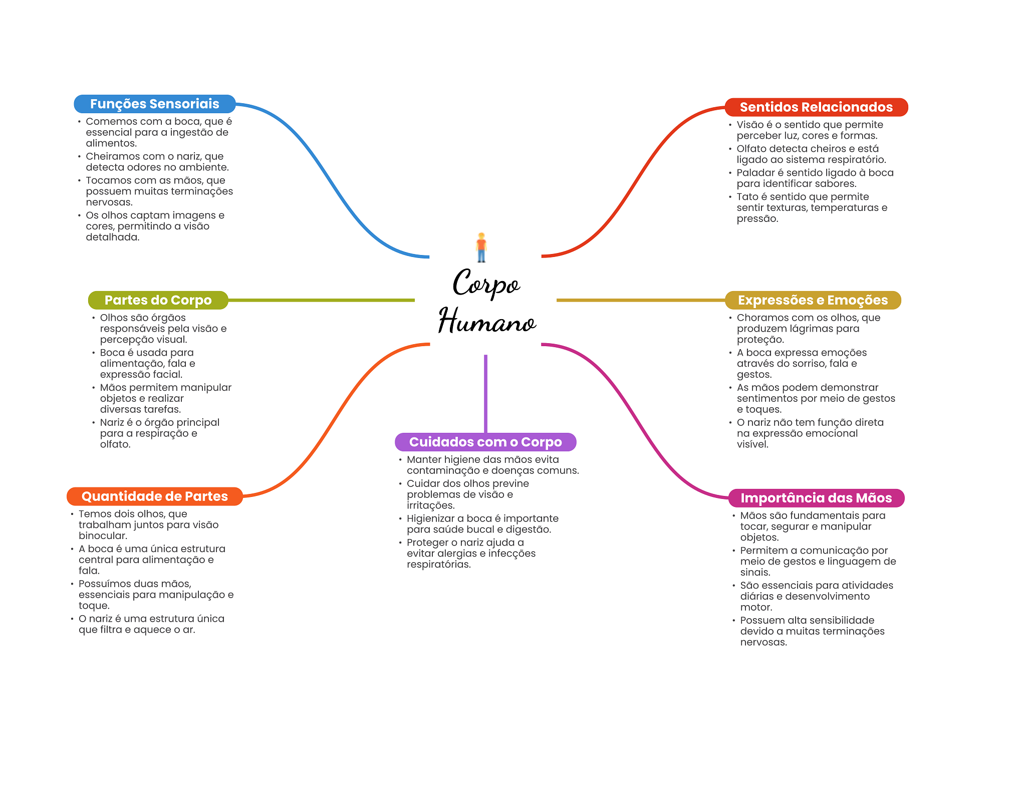 Funções Sensoriais Sentidos Relacionados Comemos com a boca, que é Visão é sentido que permite essencial para a ingestão de perceber luz, cores e formas. alimentos. Olfato detecta cheiros e está Cheiramos com nariz, que ligado ao sistema respiratório. detecta odores no ambiente. Paladar é sentido ligado à boca Tocamos com as mãos, que para identificar sabores. possuem muitas terminações Tato é sentido que permite nervosas. sentir texturas, temperaturas e Os olhos captam imagens e pressão. cores, permitindo a visão detalhada. Corpo Partes do Corpo Expressões e Emoções Olhos são órgãos Humano Choramos com olhos, que responsáveis pela visão e produzem lágrimas para percepção visual. proteção. Boca é usada para A boca expressa emoções alimentação, fala e através do sorriso, fala e expressão facial. gestos. Mãos permitem manipular As mãos podem demonstrar objetos e realizar sentimentos por meio de gestos diversas tarefas. e toques. Nariz é órgão principal nariz não tem função direta para a respiração e na expressão emocional olfato. Cuidados com Corpo visível. Manter higiene das mãos evita contaminação e doenças comuns. Cuidar dos olhos previne Quantidade de Partes problemas de visão e Importância das Mãos irritações. Temos dois olhos, que Higienizar a boca é importante Mãos são fundamentais para trabalham juntos para visão binocular. para saúde bucal e digestão. tocar, segurar e manipular Proteger nariz ajuda a objetos. A boca é uma única estrutura evitar alergias e infecções Permitem a comunicação por central para alimentação e respiratórias. meio de gestos e linguagem de fala. sinais. Possuímos duas mãos, São essenciais para atividades essenciais para manipulação e diárias e desenvolvimento toque. motor. nariz é uma estrutura única Possuem alta sensibilidade que filtra e aquece ar. devido a muitas terminações nervosas.