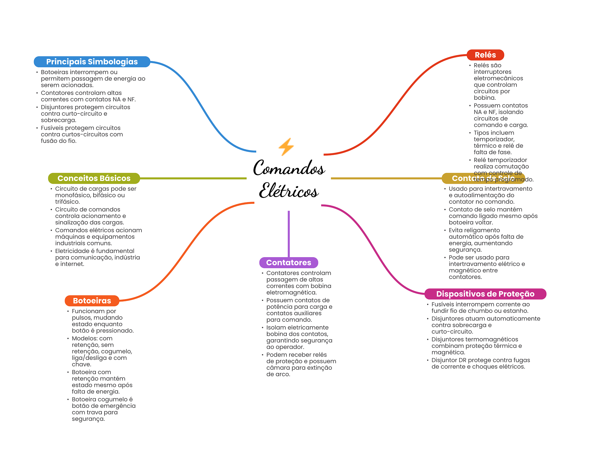 Relés Principais Simbologias Relés são Botoeiras interrompem ou interruptores permitem passagem de energia ao eletromecânicos serem acionadas. que controlam Contatores controlam altas circuitos por correntes com contatos NA e NF. bobina. Disjuntores protegem circuitos Possuem contatos contra curto-circuito e NA e NF, isolando sobrecarga. circuitos de Fusíveis protegem circuitos comando e carga. contra curtos-circuitos com Tipos incluem fusão do fio. temporizador, térmico e relé de falta de fase. Relé temporizador Comandos realiza comutação com controle de Conceitos Básicos Contato Circuito de cargas pode ser monofásico, bifásico ou Elétricos Usado para intertravamento e autoalimentação do trifásico. contator no comando. Circuito de comandos Contato de selo mantém controla acionamento e comando ligado mesmo após sinalização das cargas. botoeira voltar. Comandos elétricos acionam Evita religamento máquinas e equipamentos automático após falta de industriais comuns. energia, aumentando Eletricidade é fundamental segurança. para comunicação, indústria Pode ser usado para e internet. Contatores intertravamento elétrico e Contatores controlam magnético entre contatores. passagem de altas correntes com bobina eletromagnética. Dispositivos de Proteção Botoeiras Possuem contatos de potência para carga e Fusíveis interrompem corrente ao Funcionam por contatos auxiliares fundir fio de chumbo ou estanho. pulsos, mudando para comando. Disjuntores atuam automaticamente estado enquanto Isolam eletricamente contra sobrecarga e botão é pressionado. bobina dos contatos, curto-circuito. Modelos: com garantindo segurança Disjuntores termomagnéticos retenção, sem ao operador. combinam proteção térmica e retenção, cogumelo, Podem receber relés magnética. liga/desliga e com chave. de proteção e possuem Disjuntor DR protege contra fugas câmara para extinção de corrente e choques elétricos. Botoeira com de arco. retenção mantém estado mesmo após falta de energia. Botoeira cogumelo é botão de emergência com trava para segurança.