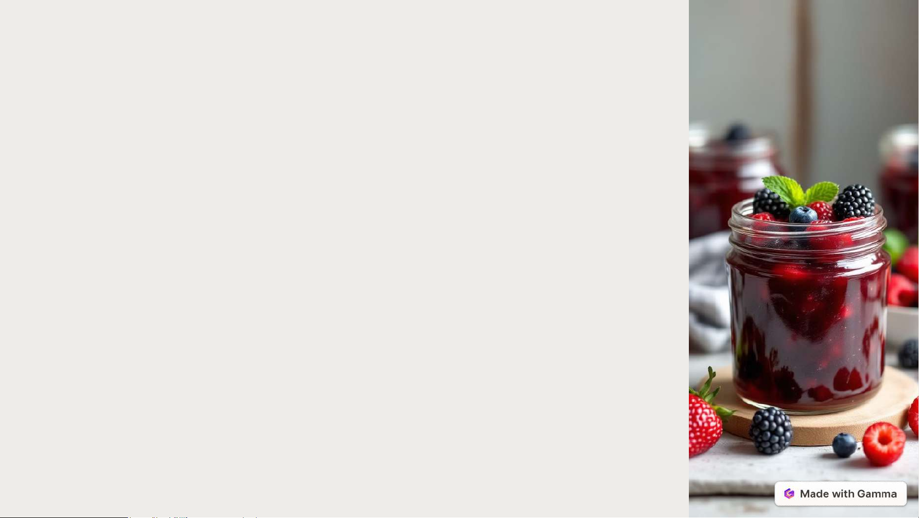 Geleias Caseiras Zero Açúcar Estas geleias são perfeitas para acompanhar pães, bolos, panquecas ou simplesmente saborear com uma colher. O melhor de tudo: são livres de açúcares refinados, preservando o sabor natural das frutas e utilizando adoçantes naturais em quantidades moderadas. https://gamma.app/?utm_source=made-with-gamma Dicas para Conservação e Uso das Geleias Esterilização dos Potes Lave bem os potes de vidro e tampas com água quente e sabão. Coloque os potes limpos em uma panela grande com água (cobrindo completamente). Ferva por 10 minutos. Retire com uma pinça e deixe secar sobre um pano limpo. Os potes devem estar completamente secos antes de receber as geleias. Armazenamento Todas as geleias devem ser conservadas na geladeira após abertas. Para maior durabilidade, use sempre utensílios limpos para retirar a geleia do pote. Se notar alterações de cor, odor ou desenvolvimento de mofo, descarte imediatamente. https://gamma.app/?utm_source=made-with-gamma Usos Criativos para Geleias Zero Açúcar Recheios Como recheio de bolos e tortas zero açúcar Sobre panquecas ou waffles sem glúten Acompanha queijos vegetais sem lactose Misturas Misturadas em iogurtes vegetais caseiros Coberturas C para sobremesas Bebidas Adicionadas a smoothies e shakes proteicos Como adonçante natural para bebidas https://gamma.app/?utm_source=made-with-gamma Geleia de Banana com Canela Ingredientes 4 bananas maduras amassadas Suco de 1 limão 1 colher de chá de canela em pó 1 colher de chá de extrato de baunilha 2 colheres de sopa de eritritol 1 colher de sopa de sementes de chia Dica: Esta geleia é perfeita para passar em pães ou panquecas no café da manhã! Modo de Preparo Em uma panela, coloque as bananas amassadas, o suco de limão, a canela e o adoçante. Leve ao fogo médio-baixo e cozinhe por 10 minutos, mexendo frequentemente. Adicione o extrato de baunilha e as sementes de chia. Cozinhe por mais 5 minutos, mexendo sempre para não grudar no fundo da panela. Retire do fogo e deixe esfriar (a geleia vai engrossar mais ao esfriar). Transfira para potes de vidro esterilizados e conserve na geladeira por até 7 dias. https://gamma.app/?utm_source=made-with-gamma Geleia de Uva Rubi Ingredientes 3 xícaras de uvas vermelhas ou roxas sem sementes 1 maçã verde ralada (com casca) 3 colheres de sopa de eritritol Suco de 1 limão 1 colher de chá de ágar-ágar em pó (substitui a pectina) Dica: Esta geleia combina perfeitamente com queijos vegetais sem lactose! Modo de Preparo Lave bem as uvas e retire-as dos cachos. Em uma panela, coloque as uvas, a maçã ralada, o adoçante e o suco de limão. Leve ao fogo médio- baixo e cozinhe por 15 minutos, amassando as uvas durante o cozimento. Passe a mistura por uma peneira para remover as cascas (opcional). Retorne o líquido à panela, adicione o ágar-ágar e cozinhe por mais 2 minutos, mexendo constantemente. Retire do fogo e deixe esfriar antes de transferir para potes de vidro esterilizados. Conserve na geladeira por até 2 semanas. https://gamma.app/?utm_source=made-with-gamma Geleia de Morango com Chia Ingredientes 2 xícaras de morangos frescos ou congelados 2 colheres de sopa de sementes de chia 2 colheres de sopa de eritritol ou xilitol Suco de 1/2 limão 1/2 colher de chá de extrato de baunilha (opcional) Modo de Preparo Lave bem os morangos, retire os cabinhos e corte-os em pedaços pequenos. Em uma panela, coloque os morangos picados, o adoçante e o suco de limão. Leve ao fogo médio e cozinhe por 10 minutos, mexendo ocasionalmente e amassando levemente as frutas. Retire do fogo, adicione as sementes de chia e o extrato de baunilha, mexendo bem. Deixe esfriar na panela por 15 minutos (a mistura vai engrossar com a chia). Transfira para um pote de vidro esterilizado e conserve na geladeira por até 7 dias. Dica: Para uma textura mais lisa, bata os morangos no liquidificador antes de cozinhar. https://gamma.app/?utm_source=made-with-gamma Geleia de Maracujá Cremosa Ingredientes Polpa de 6 maracujás maduros 1 maçã verde ralada (com casca) 3 colheres de sopa de monk fruit em pó 1/2 xícara de água 1/2 colher de chá de ágar-ágar em pó Modo de Preparo Corte os maracujás ao meio e retire a polpa com uma colher. Em um liquidificador, bata levemente a polpa apenas para soltar as sementes (não triture demais). Passe por uma peneira para separar as sementes. Reserve algumas para decoração, se desejar. Em uma panela, coloque o suco de maracujá, a maçã ralada, o adoçante e a água. Leve ao fogo médio e cozinhe por 10 minutos. Adicione o ágar-ágar, misture bem e cozinhe por mais 3 minutos. Desligue o fogo e adicione algumas sementes de maracujá reservadas, se desejar. Deixe esfriar e transfira para potes esterilizados. Conserve na geladeira por até 10 dias. https://gamma.app/?utm_source=made-with-gamma Geleia de Damasco com Gengibre Ingredientes 2 xícaras de damascos secos sem açúcar 1/2 xícara de água filtrada 1/2 xícara de suco de laranja natural 2 colheres de sopa de adoçante xilitol 1 colher de chá de gengibre ralado 1 colher de chá de ágar-ágar em pó Modo de Preparo Pique os damascos em pedaços pequenos. Em uma tigela, coloque os damascos e cubra com água morna. Deixe de molho por 2 horas (ou durante a noite). Escorra a água e transfira os damascos para uma panela. Adicione a água filtrada, suco de laranja, adoçante e gengibre. Leve ao fogo médio-baixo e cozinhe por 15 minutos, mexendo ocasionalmente. Adicione o ágar-ágar, misture bem e cozinhe por mais 2 minutos. Retire do fogo e deixe esfriar antes de transferir para potes de vidro. Conserve na geladeira por até 2 semanas. https://gamma.app/?utm_source=made-with-gamma Geleia de Jabuticaba Ingredientes 3 xícaras de jabuticabas maduras 2 colheres de sopa de eritritol 1 canela em pau 2 cravos-da-índia Suco de 1/2 limão 1 colher de sopa de sementes de chia Modo de Preparo Lave bem as jabuticabas e retire as sementes. Em uma pan