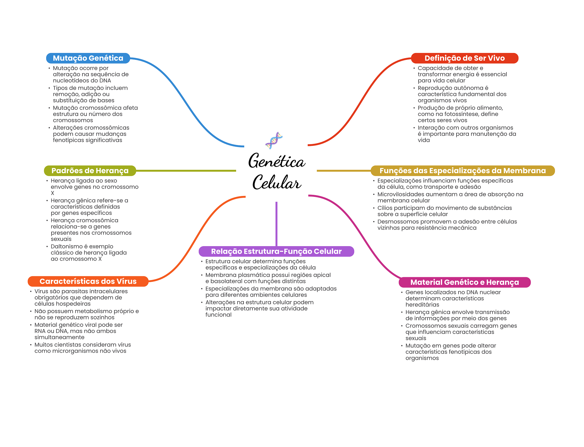Mutação Genética Definição de Ser Vivo Mutação ocorre por Capacidade de obter e alteração na sequência de transformar energia é essencial nucleotídeos do DNA para vida celular Tipos de mutação incluem Reprodução autônoma é remoção, adição ou característica fundamental dos substituição de bases organismos vivos Mutação cromossômica afeta Produção de próprio alimento, estrutura ou número dos como na fotossíntese, define certos seres vivos Alterações cromossômicas Interação com outros organismos podem causar mudanças é importante para manutenção da fenotípicas significativas vida Genética Padrões de Herança Funções das Especializações da Membrana Herança ligada ao sexo Celular Especializações influenciam funções específicas envolve genes no cromossomo da célula, como transporte e adesão X Microvilosidades aumentam a área de absorção na Herança gênica refere-se a membrana celular características definidas Cílios participam do movimento de substâncias por genes específicos sobre a superfície celular Herança cromossômica Desmossomos promovem a adesão entre células relaciona-se a genes vizinhas para resistência mecânica presentes nos cromossomos sexuais Daltonismo é exemplo clássico de herança ligada Relação Estrutura-Função Celular ao cromossomo X Estrutura celular determina funções específicas e especializações da célula Membrana plasmática possui regiões apical Características dos Vírus e basolateral com funções distintas Material Genético e Herança Vírus são parasitas intracelulares Especializações da membrana são adaptadas Genes localizados no DNA nuclear obrigatórios que dependem de para diferentes ambientes celulares determinam características células hospedeiras Alterações na estrutura celular podem hereditárias Não possuem metabolismo próprio e impactar diretamente sua atividade funcional Herança gênica envolve transmissão não se reproduzem sozinhos de informações por meio dos genes Material genético viral pode ser Cromossomos sexuais carregam genes RNA ou DNA, mas não ambos que influenciam características simultaneamente sexuais Muitos cientistas consideram vírus Mutação em genes pode alterar como microrganismos não vivos características fenotípicas dos organismos