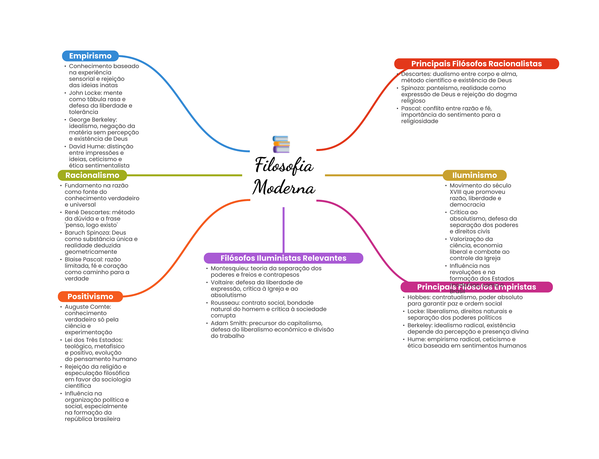 Empirismo Conhecimento baseado Principais Filósofos Racionalistas na experiência Descartes: dualismo entre corpo e alma, sensorial e rejeição método científico e existência de Deus das ideias inatas Spinoza: panteísmo, realidade como John Locke: mente expressão de Deus e rejeição do dogma como tábula rasa e religioso defesa da liberdade e Pascal: conflito entre razão e fé, tolerância importância do sentimento para a George Berkeley: religiosidade idealismo, negação da matéria sem percepção e existência de Deus David Hume: distinção entre impressões e ideias, ceticismo e ética sentimentalista Filosofia Racionalismo Fundamento na razão como fonte do Moderna Movimento do século XVIII que promoveu conhecimento verdadeiro razão, liberdade e e universal democracia René Descartes: método Crítica ao da dúvida e a frase absolutismo, defesa da 'penso, logo existo' separação dos poderes Baruch Spinoza: Deus e direitos civis como substância única e Valorização da realidade deduzida ciência, economia geometricamente liberal e combate ao Blaise Pascal: razão Filósofos Iluministas Relevantes controle da Igreja limitada, fé e coração Montesquieu: teoria da separação dos Influência nas como caminho para a poderes e freios e contrapesos revoluções e na verdade formação dos Estados Voltaire: defesa da liberdade de expressão, crítica à Igreja e ao Principais Empiristas Positivismo absolutismo Hobbes: contratualismo, poder absoluto Rousseau: contrato social, bondade Auguste Comte: para garantir paz e ordem social natural do homem e crítica à sociedade conhecimento Locke: liberalismo, direitos naturais e corrupta verdadeiro só pela separação dos poderes políticos ciência e Adam Smith: precursor do capitalismo, Berkeley: idealismo radical, existência defesa do liberalismo econômico e divisão experimentação depende da percepção e presença divina do trabalho Lei dos Três Estados: Hume: empirismo radical, ceticismo e teológico, metafísico ética baseada em sentimentos humanos e positivo, evolução do pensamento humano Rejeição da religião e especulação filosófica em favor da sociologia científica Influência na organização política e social, especialmente na formação da república brasileira