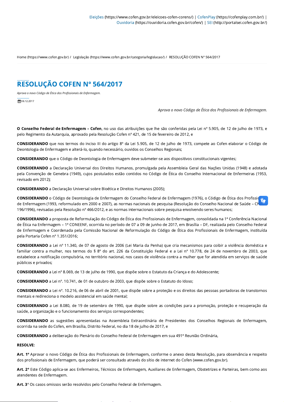 Eleições (https://www.cofen.gov.br/eleicoes-cofen-corens/) | CofenPlay (https://cofenplay.com.br/) | Ouvidoria (https://ouvidoria.cofen.gov.br/cofen/) | SEI (http://portalsei.cofen.gov.br/) Home (https://www.cofen.gov.br) / Legislação (https://www.cofen.gov.br/categoria/legislacao/) / RESOLUÇÃO COFEN Nº 564/2017 RESOLUÇÃO COFEN Nº 564/2017 Aprova o novo Código de Ética dos Profissionais de Enfermagem. 06.12.2017 Aprova o novo Código de Ética dos Profissionais de Enfermagem. O Conselho Federal de Enfermagem – Cofen, no uso das atribuições que lhe são conferidas pela Lei nº 5.905, de 12 de julho de 1973, e pelo Regimento da Autarquia, aprovado pela Resolução Cofen nº 421, de 15 de fevereiro de 2012, e CONSIDERANDO que nos termos do inciso III do artigo 8º da Lei 5.905, de 12 de julho de 1973, compete ao Cofen elaborar o Código de Deontologia de Enfermagem e alterá-lo, quando necessário, ouvidos os Conselhos Regionais; CONSIDERANDO que o Código de Deontologia de Enfermagem deve submeter-se aos dispositivos constitucionais vigentes; CONSIDERANDO a Declaração Universal dos Direitos Humanos, promulgada pela Assembleia Geral das Nações Unidas (1948) e adotada pela Convenção de Genebra (1949), cujos postulados estão contidos no Código de Ética do Conselho Internacional de Enfermeiras (1953, revisado em 2012); CONSIDERANDO a Declaração Universal sobre Bioética e Direitos Humanos (2005); CONSIDERANDO o Código de Deontologia de Enfermagem do Conselho Federal de Enfermagem (1976), o Código de Ética dos Profissionais de Enfermagem (1993, reformulado em 2000 e 2007), as normas nacionais de pesquisa (Resolução do Conselho Nacional de Saúde – CNS nº 196/1996), revisadas pela Resolução nº 466/2012, e as normas internacionais sobre pesquisa envolvendo seres humanos; CONSIDERANDO a proposta de Reformulação do Código de Ética dos Profissionais de Enfermagem, consolidada na 1ª Conferência Nacional de Ética na Enfermagem – 1ª CONEENF, ocorrida no período de 07 a 09 de junho de 2017, em Brasília – DF, realizada pelo Conselho Federal de Enfermagem e Coordenada pela Comissão Nacional de Reformulação do Código de Ética dos Profissionais de Enfermagem, instituída pela Portaria Cofen nº 1.351/2016; CONSIDERANDO a Lei nº 11.340, de 07 de agosto de 2006 (Lei Maria da Penha) que cria mecanismos para coibir a violência doméstica e familiar contra a mulher, nos termos do § 8º do art. 226 da Constituição Federal e a Lei nº 10.778, de 24 de novembro de 2003, que estabelece a notificação compulsória, no território nacional, nos casos de violência contra a mulher que for atendida em serviços de saúde públicos e privados; CONSIDERANDO a Lei nº 8.069, de 13 de julho de 1990, que dispõe sobre o Estatuto da Criança e do Adolescente; CONSIDERANDO a Lei nº. 10.741, de 01 de outubro de 2003, que dispõe sobre o Estatuto do Idoso; CONSIDERANDO a Lei nº. 10.216, de 06 de abril de 2001, que dispõe sobre a proteção e os direitos das pessoas portadoras de transtornos mentais e redireciona o modelo assistencial em saúde mental; CONSIDERANDO a Lei 8.080, de 19 de setembro de 1990, que dispõe sobre as condições para a promoção, proteção e recuperação da saúde, a organização e o funcionamento dos serviços correspondentes; CONSIDERANDO as sugestões apresentadas na Assembleia Extraordinária de Presidentes dos Conselhos Regionais de Enfermagem, ocorrida na sede do Cofen, em Brasília, Distrito Federal, no dia 18 de julho de 2017, e CONSIDERANDO a deliberação do Plenário do Conselho Federal de Enfermagem em sua 491ª Reunião Ordinária, RESOLVE: Art. 1º Aprovar o novo Código de Ética dos Profissionais de Enfermagem, conforme o anexo desta Resolução, para observância e respeito dos profissionais de Enfermagem, que poderá ser consultado através do sítio de internet do Cofen (www.cofen.gov.br). Art. 2º Este Código aplica-se aos Enfermeiros, Técnicos de Enfermagem, Auxiliares de Enfermagem, Obstetrizes e Parteiras, bem como aos atendentes de Enfermagem. Art. 3º Os casos omissos serão resolvidos pelo Conselho Federal de Enfermagem. https://www.cofen.gov.br/eleicoes-cofen-corens/ https://www.cofen.gov.br/eleicoes-cofen-corens/ https://cofenplay.com.br/ https://cofenplay.com.br/ https://ouvidoria.cofen.gov.br/cofen/ https://ouvidoria.cofen.gov.br/cofen/ http://portalsei.cofen.gov.br/ http://portalsei.cofen.gov.br/ https://www.cofen.gov.br/ https://www.cofen.gov.br/ https://www.cofen.gov.br/categoria/legislacao/ https://www.cofen.gov.br/categoria/legislacao/ Art. 4º Este Código poderá ser alterado pelo Conselho Federal de Enfermagem, por proposta de 2/3 dos Conselheiros Efetivos do Conselho Federal ou mediante proposta de 2/3 dos Conselhos Regionais. Parágrafo Único. A alteração referida deve ser precedida de ampla discussão com a categoria, coordenada pelos Conselhos Regionais, sob a coordenação geral do Conselho Federal de Enfermagem, em formato de Conferência Nacional, precedida de Conferências Regionais. Art. 5º A presente Resolução entrará em vigor 120 (cento e vinte) dias a partir da data de sua publicação no Diário Oficial da União, revogando-se as disposições em contrário, em especial a Resolução Cofen nº 311/2007, de 08 de fevereiro de 2007. Brasília, 6 de novembro de 2017. MANOEL CARLOS N. DA SILVA COREN-RO Nº 63592 Presidente MARIA R. F. B. SAMPAIO COREN-PI Nº 19084 Primeira-Secretária ANEXO DA RESOLUÇÃO COFEN Nº 564/2017 PREÂMBULO O Conselho Federal de Enfermagem, ao revisar o Código de Ética dos Profissionais de Enfermagem – CEPE, norteou-se por princípios fundamentais, que representam imperativos para a conduta profissional e consideram que a Enfermagem é uma ciência, arte e uma prática social, indispensável à organização e ao funcionamento dos serviços de saúde; tem como responsabilidades a promoção e a restauração da saúde, a prevenção de agravos e doen