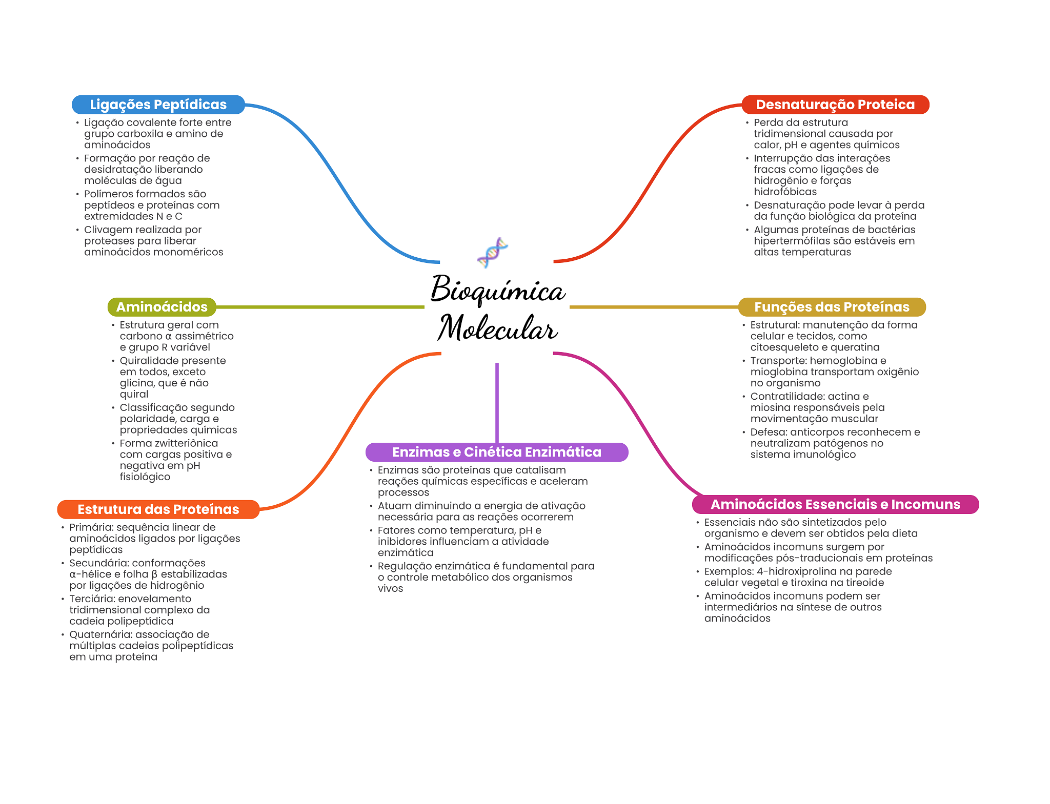 Ligações Peptídicas Desnaturação Proteica Ligação covalente forte entre Perda da estrutura grupo carboxila e amino de tridimensional causada por aminoácidos calor, pH e agentes químicos Formação por reação de Interrupção das interações desidratação liberando fracas como ligações de moléculas de água hidrogênio e forças Polímeros formados são hidrofóbicas peptídeos e proteínas com Desnaturação pode levar à perda extremidades N e da função biológica da proteína Clivagem realizada por Algumas proteínas de bactérias proteases para liberar hipertermófilas são estáveis em aminoácidos monoméricos altas temperaturas Bioquímica Aminoácidos Funções das Proteínas Estrutura geral com Molecular Estrutural: manutenção da forma carbono assimétrico celular e tecidos, como e grupo R variável citoesqueleto e queratina Quiralidade presente Transporte: hemoglobina e em todos, exceto mioglobina transportam oxigênio glicina, que é não no organismo quiral Contratilidade: actina e Classificação segundo miosina responsáveis pela polaridade, carga e movimentação muscular propriedades químicas Defesa: anticorpos reconhecem e Forma zwitteriônica neutralizam patógenos no com cargas positiva e Enzimas e Cinética Enzimática sistema imunológico negativa em pH Enzimas são proteínas que catalisam fisiológico reações químicas específicas e aceleram processos Estrutura das Proteínas Atuam diminuindo a energia de ativação Aminoácidos Essenciais e Incomuns necessária para as reações ocorrerem Primária: sequência linear de Essenciais não são sintetizados pelo Fatores como temperatura, pH e aminoácidos ligados por ligações organismo e devem ser obtidos pela dieta inibidores influenciam a atividade peptídicas enzimática Aminoácidos incomuns surgem por Secundária: conformações modificações pós-traducionais em proteínas Regulação enzimática é fundamental para α-hélice e folha estabilizadas controle metabólico dos organismos Exemplos: 4-hidroxiprolina na parede por ligações de hidrogênio vivos celular vegetal e tiroxina na tireoide Terciária: enovelamento Aminoácidos incomuns podem ser tridimensional complexo da intermediários na sintese de outros cadeia polipeptídica aminoácidos Quaternária: associação de múltiplas cadeias polipeptídicas em uma proteína