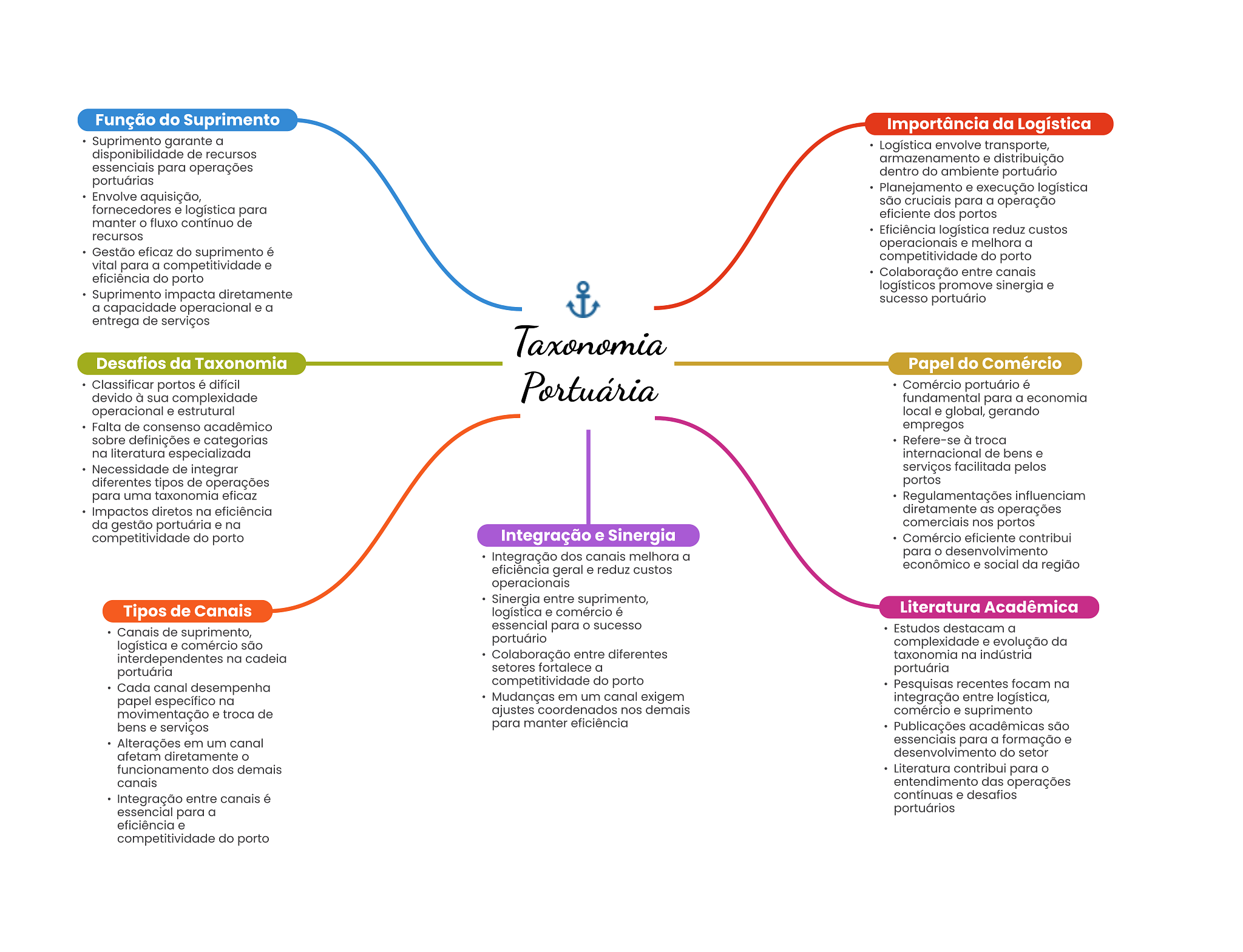 Função do Suprimento Importância da Logística Suprimento garante a Logística envolve transporte, disponibilidade de recursos armazenamento e distribuição essenciais para operações dentro do ambiente portuário portuárias Planejamento e execução logística Envolve aquisição, são cruciais para a operação fornecedores e logística para eficiente dos portos manter fluxo contínuo de Eficiência logística reduz custos recursos operacionais e melhora a Gestão eficaz do suprimento é competitividade do porto vital para a competitividade e eficiência do porto Colaboração entre canais logísticos promove sinergia e Suprimento impacta diretamente sucesso portuário a capacidade operacional e a entrega de serviços Taxonomia Desafios da Taxonomia Papel do Comércio Classificar portos é difícil Portuária Comércio é devido à sua complexidade fundamental para a economia operacional e estrutural local e global, gerando Falta de consenso acadêmico empregos sobre definições e categorias Refere-se à troca na literatura especializada internacional de bens e Necessidade de integrar serviços facilitada pelos diferentes tipos de operações portos para uma taxonomia eficaz Regulamentações influenciam Impactos diretos na eficiência diretamente as operações da gestão portuária e na comerciais nos portos competitividade do porto Integração e Sinergia Comércio eficiente contribui Integração dos canais melhora a para O desenvolvimento eficiência geral e reduz custos econômico e social da região operacionais Sinergia entre suprimento, Tipos de Canais logística e comércio é Literatura Acadêmica Canais de suprimento, essencial para sucesso Estudos destacam a logística e comércio são portuário complexidade e evolução da interdependentes na cadeia Colaboração entre diferentes taxonomia na indústria portuária setores fortalece a portuária Cada canal desempenha competitividade do porto Pesquisas recentes focam na papel específico na Mudanças em um canal exigem integração entre logística, movimentação e troca de ajustes coordenados nos demais comércio e suprimento bens e serviços para manter eficiência Publicações acadêmicas são Alterações em um canal essenciais para a formação e afetam diretamente desenvolvimento do setor funcionamento dos demais Literatura contribui para canais entendimento das operações Integração entre canais é contínuas e desafios essencial para a portuários eficiência e competitividade do porto