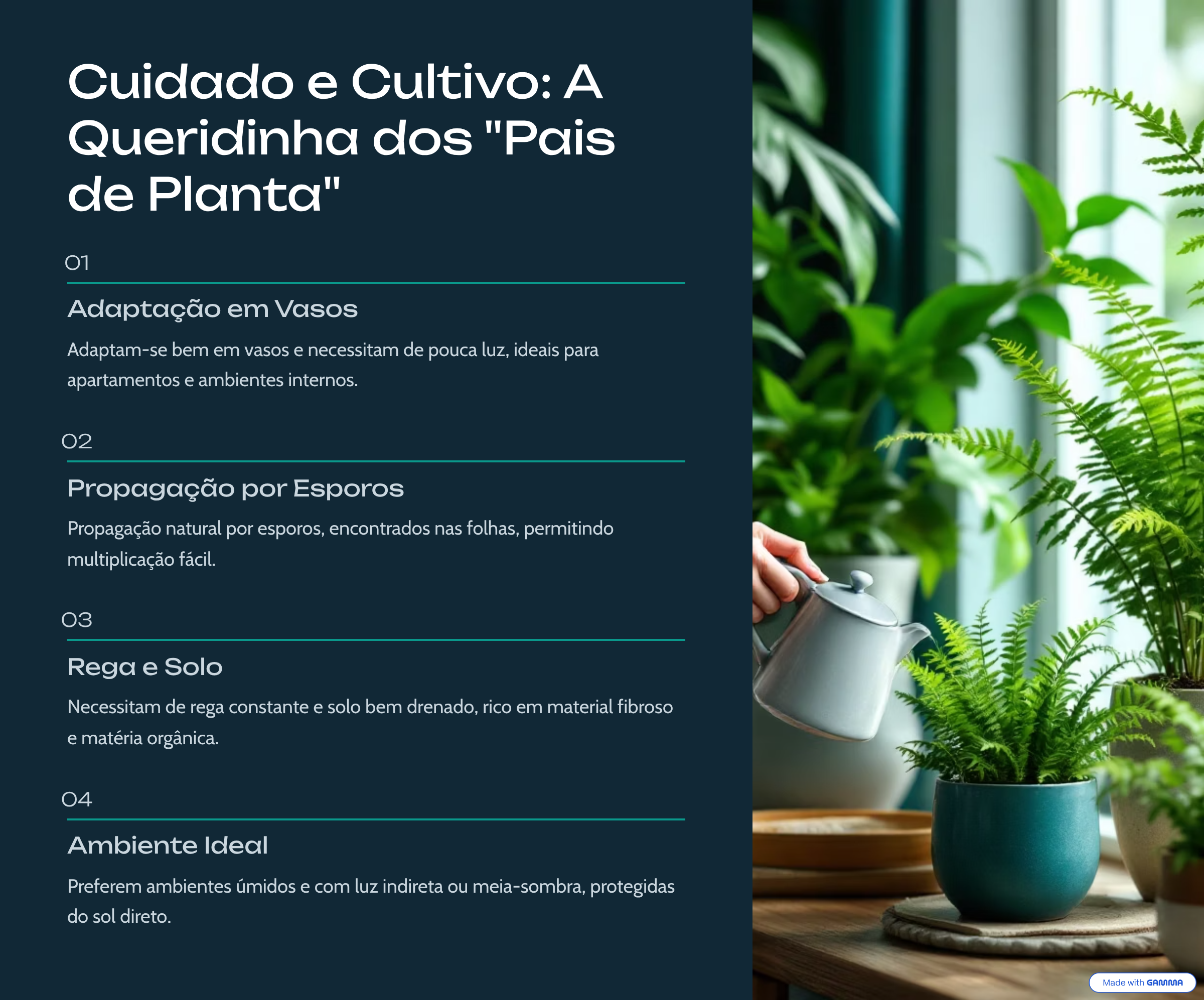Cuidado e Cultivo: A Queridinha dos "Pais de Planta" 01 Adaptação em Vasos Adaptam-se bem em vasos e necessitam de pouca luz, ideais para apartamentos e ambientes internos. 02 Propagação por Esporos Propagação natural por esporos, encontrados nas folhas, permitindo multiplicação fácil. 03 Rega e Solo Necessitam de rega constante e solo bem drenado, rico em material fibroso e matéria orgânica. 04 Ambiente Ideal Preferem ambientes úmidos e com luz indireta ou meia-sombra, protegidas do sol direto. Made with