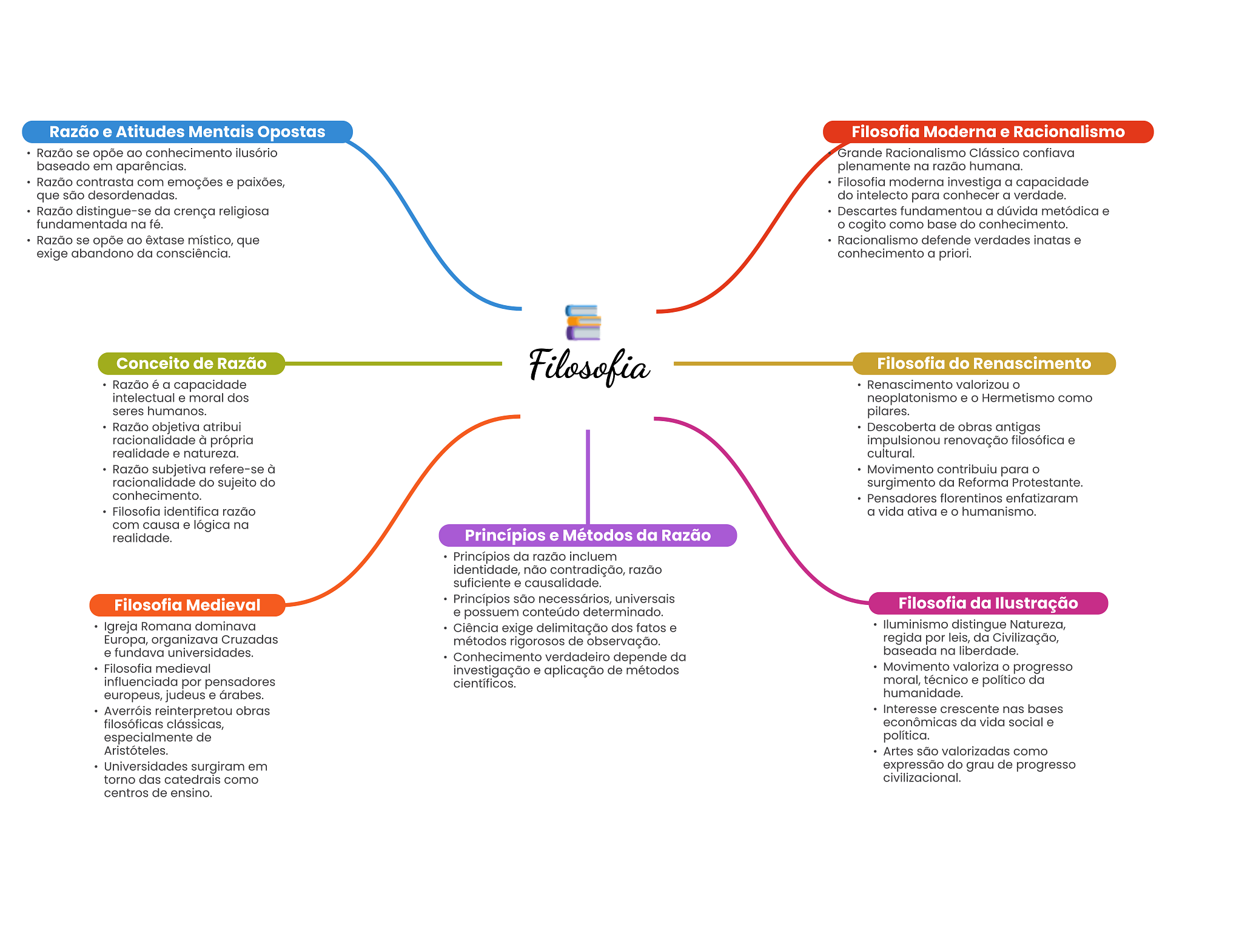 Razão e Atitudes Mentais Opostas Filosofia Moderna e Racionalismo Razão se opõe ao conhecimento ilusório Grande Racionalismo Clássico confiava baseado em aparências. plenamente na razão humana. Razão contrasta com emoções e paixões, Filosofia moderna investiga a capacidade que são desordenadas. do intelecto para conhecer a verdade. Razão distingue-se da crença religiosa Descartes fundamentou a dúvida metódica e fundamentada na fé. cogito como base do conhecimento. Razão se opõe ao êxtase místico, que Racionalismo defende verdades inatas e exige abandono da consciência. conhecimento a priori. Conceito de Razão Filosofia Filosofia do Renascimento Razão é a capacidade Renascimento valorizou intelectual e moral dos neoplatonismo e O Hermetismo como seres humanos. pilares. Razão objetiva atribui Descoberta de obras antigas racionalidade à própria impulsionou renovação filosófica e realidade e natureza. cultural. Razão subjetiva refere-se à Movimento contribuiu para O racionalidade do sujeito do surgimento da Reforma Protestante. conhecimento. Pensadores florentinos enfatizaram Filosofia identifica razão a vida ativa e humanismo. com causa e lógica na realidade. Princípios e Métodos da Razão Princípios da razão incluem identidade, não contradição, razão suficiente e causalidade. Filosofia Medieval Princípios são necessários, universais Filosofia da Ilustração e possuem conteúdo determinado. Igreja Romana dominava Ciência exige delimitação dos fatos e distingue Natureza, Europa, organizava Cruzadas métodos rigorosos de observação. regida por leis, da Civilização, e fundava universidades. baseada na liberdade. Conhecimento verdadeiro depende da Filosofia medieval investigação e aplicação de métodos Movimento valoriza progresso influenciada por pensadores científicos. moral, técnico e político da europeus, judeus e árabes. humanidade. Averróis reinterpretou obras Interesse crescente nas bases filosóficas clássicas, econômicas da vida social e especialmente de política. Aristóteles. Artes são valorizadas como Universidades surgiram em expressão do grau de progresso torno das catedrais como civilizacional. centros de ensino.
