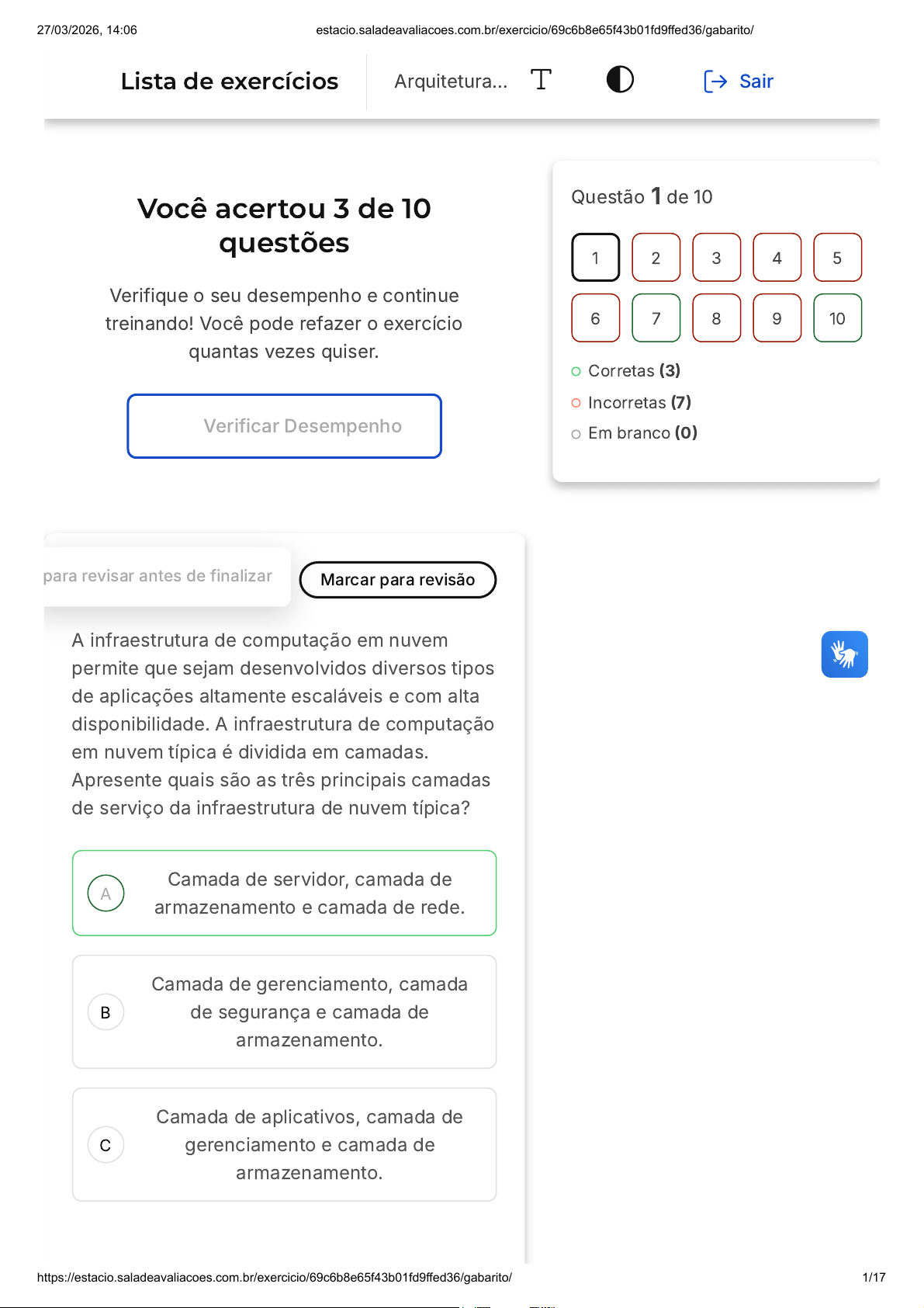 Você acertou 3 de 10 questões Verifique o seu desempenho e continue treinando! Você pode refazer o exercício quantas vezes quiser. Verificar Desempenho A B C 1 Marcar para revisãopara revisar antes de finalizar A infraestrutura de computação em nuvem permite que sejam desenvolvidos diversos tipos de aplicações altamente escaláveis e com alta disponibilidade. A infraestrutura de computação em nuvem típica é dividida em camadas. Apresente quais são as três principais camadas de serviço da infraestrutura de nuvem típica? Camada de servidor, camada de armazenamento e camada de rede. Camada de gerenciamento, camada de segurança e camada de armazenamento. Camada de aplicativos, camada de gerenciamento e camada de armazenamento. Questão 1 de 10 Corretas (3) Incorretas (7) Em branco (0) 1 2 3 4 5 6 7 8 9 10 Lista de exercícios Arquitetura… Sair 27/03/2026, 14:06 estacio.saladeavaliacoes.com.br/exercicio/69c6b8e65f43b01fd9ffed36/gabarito/ https://estacio.saladeavaliacoes.com.br/exercicio/69c6b8e65f43b01fd9ffed36/gabarito/ 1/17 D E Camada de virtualização, camada de gerenciamento e camada de armazenamento. Camada de computação, camada de armazenamento e camada de gerenciamento. Resposta correta Parabéns, você selecionou a alternativa correta. Confira o gabarito comentado! Gabarito Comentado As três principais camadas de serviço da infraestrutura em nuvem típica são: a camada de servidor, a camada de armazenamento e a camada de rede. A camada de servidor é composta por servidores virtuais, servidores físicos ou uma combinação de ambos. A camada de armazenamento engloba sistemas de arquivos, bancos de dados e outros tipos de armazenamento. Por fim, a camada de rede inclui serviços de conectividade, segurança e gerenciamento de aplicativos. Essas camadas trabalham em conjunto para fornecer uma infraestrutura de computação em nuvem eficiente e escalável, permitindo o desenvolvimento de aplicações com alta disponibilidade. 2 Marcar para revisão Na arquitetura de computação em nuvem, um dos serviços existentes no back-end é o 27/03/2026, 14:06 estacio.saladeavaliacoes.com.br/exercicio/69c6b8e65f43b01fd9ffed36/gabarito/ https://estacio.saladeavaliacoes.com.br/exercicio/69c6b8e65f43b01fd9ffed36/gabarito/ 2/17 A B C D E serviço de armazenamento na nuvem. Como esse serviço pode ser utilizado? Para descartar backups automáticos de arquivos Para gerenciar escalabilidade de recursos em nuvem Para garantir a segurança de dados em nuvem Para compartilhar arquivos entre diferentes usuários e dispositivos Para automatizar tarefas de gerenciamento de redes Resposta incorreta Opa! A alternativa correta é a letra D. Confira o gabarito comentado! Gabarito Comentado O serviço de armazenamento na nuvem é uma ferramenta essencial na arquitetura de computação em nuvem. Ele permite que os usuários armazenem e acessem arquivos de maneira remota, independentemente de onde estejam fisicamente. Isso significa que os usuários podem acessar seus arquivos de qualquer lugar, desde que tenham uma conexão com a internet e as credenciais de acesso corretas. Além disso, este serviço também possibilita o compartilhamento de arquivos com outros usuários, independentemente de onde eles estejam. Isso facilita a colaboração 27/03/2026, 14:06 estacio.saladeavaliacoes.com.br/exercicio/69c6b8e65f43b01fd9ffed36/gabarito/ https://estacio.saladeavaliacoes.com.br/exercicio/69c6b8e65f43b01fd9ffed36/gabarito/ 3/17 A B C D E eficiente em projetos e tarefas em equipe. Esta funcionalidade é especialmente útil para empresas ou equipes que trabalham em diferentes locais, pois permite que eles compartilhem arquivos de maneira segura e fácil. Portanto, a alternativa D, "Para compartilhar arquivos entre diferentes usuários e dispositivos", é a resposta correta. 3 Marcar para revisão Os serviços de computação em nuvem são oferecidos por diversos provedores de computação em nuvem, que podem oferecer a possibilidade de criação, administração e gerenciamento de servidores. Com base nesse conceito, assinale a alternativa que apresenta os 3 maiores provedores de soluções em nuvem que permitem a criação, administração e gerenciamento de servidores? Google Cloud Platform, AWS, Microsoft Azure. AWS, Oracle Cloud, IBM Cloud. AWS, Google Cloud Platform, Alibaba Cloud. Microsoft Azure, Oracle Cloud, IBM Cloud. AWS, Microsoft Azure, Alibaba Cloud. 27/03/2026, 14:06 estacio.saladeavaliacoes.com.br/exercicio/69c6b8e65f43b01fd9ffed36/gabarito/ https://estacio.saladeavaliacoes.com.br/exercicio/69c6b8e65f43b01fd9ffed36/gabarito/ 4/17 Resposta incorreta Opa! A alternativa correta é a letra A. Confira o gabarito comentado! Gabarito Comentado Google Cloud Platform (GCP), Amazon Web Services (AWS) e Microsoft Azure são os principais provedores de soluções em nuvem que permitem a criação, administração e gerenciamento de servidores porque eles oferecem uma ampla variedade de serviços e recursos para ajudar as empresas a construir, implantar e gerenciar aplicativos e serviços em nuvem. GCP, AWS e Azure oferecem uma variedade de opções de infraestrutura, como máquinas virtuais, armazenamento, redes e banco de dados, permitindo que as empresas escalem seus recursos de acordo com suas necessidades. Além disso, eles também oferecem ferramentas de gerenciamento e automação, como gerenciamento de contêineres, monitoramento e gerenciamento de segurança, para ajudar as empresas a gerenciar e otimizar seus recursos em nuvem. Outra razão pela qual esses provedores são considerados os principais é a sua ampla adoção e suporte em todo o mundo, incluindo uma ampla gama de indústrias e setores. Eles também possuem um histórico de inovação e investimento constante em novos recursos e tecnologias, garantindo que suas plataformas estejam sempre atualizadas e ofereçam as melhores opções e funcionalidades. 27/03/2026, 14:06 estacio.saladeavaliacoes.com.br/exercicio/69c6b8e65f43b