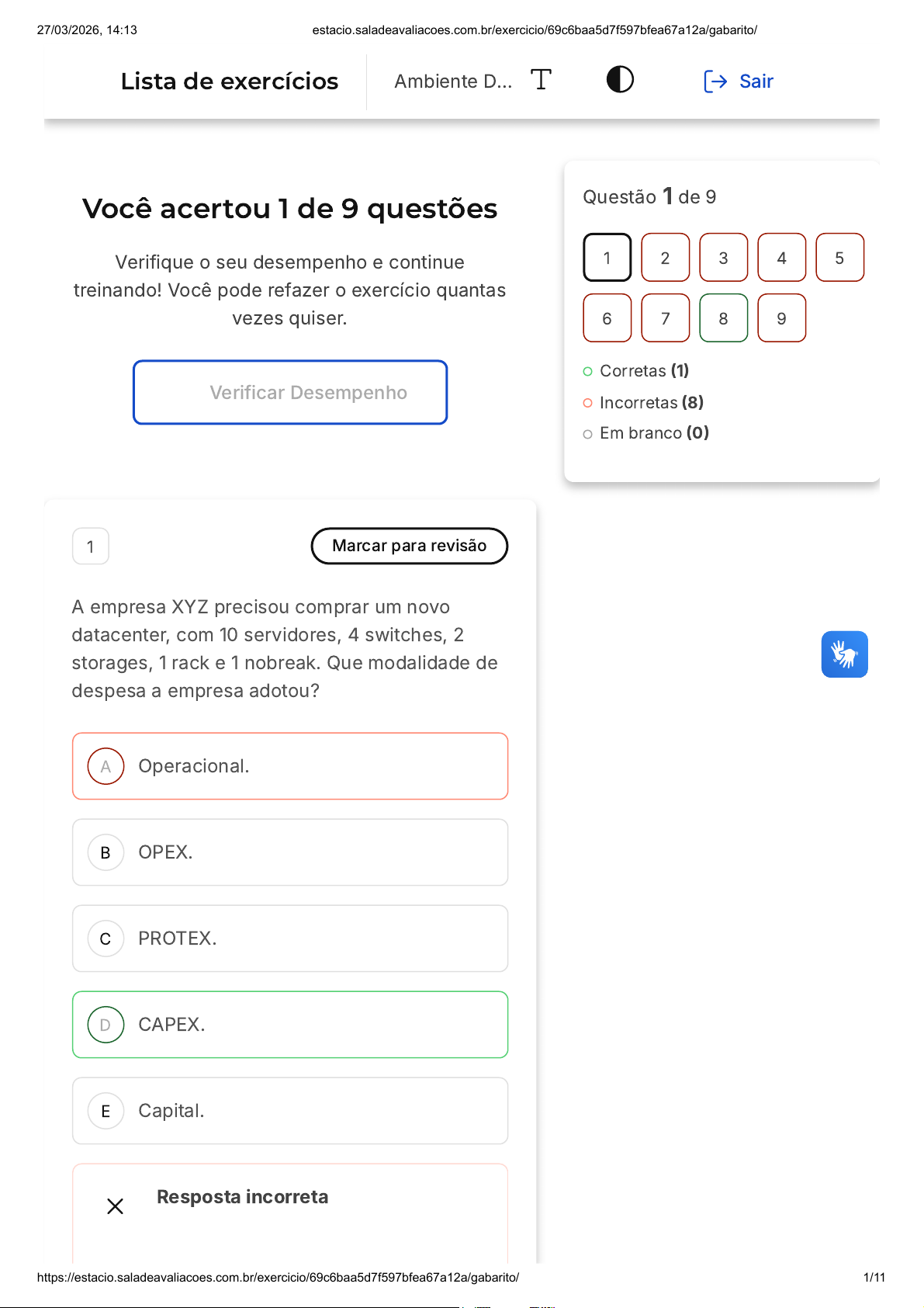 Você acertou 1 de 9 questões Verifique o seu desempenho e continue treinando! Você pode refazer o exercício quantas vezes quiser. Verificar Desempenho A B C D E 1 Marcar para revisão A empresa XYZ precisou comprar um novo datacenter, com 10 servidores, 4 switches, 2 storages, 1 rack e 1 nobreak. Que modalidade de despesa a empresa adotou? Operacional. OPEX. PROTEX. CAPEX. Capital. Resposta incorreta Questão 1 de 9 Corretas (1) Incorretas (8) Em branco (0) 1 2 3 4 5 6 7 8 9 Lista de exercícios Ambiente D… Sair 27/03/2026, 14:13 estacio.saladeavaliacoes.com.br/exercicio/69c6baa5d7f597bfea67a12a/gabarito/ https://estacio.saladeavaliacoes.com.br/exercicio/69c6baa5d7f597bfea67a12a/gabarito/ 1/11 A B C Opa! A alternativa correta é a letra D. Confira o gabarito comentado! Gabarito Comentado A alternativa correta é a CAPEX. CAPEX, ou Capital Expenditure, é uma despesa de capital que uma empresa realiza para a aquisição ou melhoria de ativos de longo prazo, como equipamentos, propriedades ou infraestruturas industriais. No caso apresentado, a empresa XYZ realizou uma despesa de capital para a compra de um novo datacenter, que inclui servidores, switches, storages, rack e nobreak. Esses são recursos tangíveis que a empresa adquiriu para melhorar sua infraestrutura e capacidade de operação, caracterizando uma despesa de CAPEX. 2 Marcar para revisão A nuvem de internet, também conhecida como nuvem computacional, é uma tecnologia que permite o armazenamento, o gerenciamento e o processamento de dados em servidores remotos via internet. No modelo de responsabilidade compartilhada, o provedor de nuvem será sempre responsável por? Aplicativos. Dados armazenados na nuvem. Atualização do sistema operacional. 27/03/2026, 14:13 estacio.saladeavaliacoes.com.br/exercicio/69c6baa5d7f597bfea67a12a/gabarito/ https://estacio.saladeavaliacoes.com.br/exercicio/69c6baa5d7f597bfea67a12a/gabarito/ 2/11 D E Datacenter físico. Identidade e infraestrutura. Resposta incorreta Opa! A alternativa correta é a letra D. Confira o gabarito comentado! Gabarito Comentado No modelo de responsabilidade compartilhada em nuvem, o provedor de nuvem é sempre responsável pelo datacenter físico. Isso ocorre porque o provedor de nuvem é o proprietário das instalações físicas, que incluem o prédio, racks, servidores, equipamentos de refrigeração e energia, entre outros. Portanto, a manutenção e a segurança dessas instalações físicas são de responsabilidade do provedor de nuvem, enquanto outras responsabilidades, como a gestão de dados e aplicativos, podem ser compartilhadas com o usuário. 3 Marcar para revisão Os clientes são divididos em diferentes categorias, como clientes potenciais, clientes atuais e clientes antigos. No modelo de responsabilidade compartilhada, o cliente/consumidor será sempre responsável por? 27/03/2026, 14:13 estacio.saladeavaliacoes.com.br/exercicio/69c6baa5d7f597bfea67a12a/gabarito/ https://estacio.saladeavaliacoes.com.br/exercicio/69c6baa5d7f597bfea67a12a/gabarito/ 3/11 A B C D E Aplicativos. Hosts Físicos. Rede Física. Atualização do sistema operacional. Informações e dados armazenados na nuvem. Resposta incorreta Opa! A alternativa correta é a letra E. Confira o gabarito comentado! Gabarito Comentado As informações e dados armazenados sempre serão responsabilidade do cliente/consumidor em qualquer nível de implementação, seja ela IAAS, PAAS ou SAAS. 4 Marcar para revisão A maior parte das regiões do Azure é emparelhada. Qual a distância mínima entre regiões pareadas? 27/03/2026, 14:13 estacio.saladeavaliacoes.com.br/exercicio/69c6baa5d7f597bfea67a12a/gabarito/ https://estacio.saladeavaliacoes.com.br/exercicio/69c6baa5d7f597bfea67a12a/gabarito/ 4/11 A B C D E 400 km. 480 km. 500 km. 550 km. 600 km. Resposta incorreta Opa! A alternativa correta é a letra B. Confira o gabarito comentado! Gabarito Comentado As regiões do Azure são geralmente emparelhadas para fornecer redundância e proteção contra desastres. Cada par de regiões é separado por uma distância mínima para garantir que eventos físicos, como desastres naturais, não afetem ambas as regiões ao mesmo tempo. No caso do Azure, essa distância mínima é de 300 milhas, que é aproximadamente 480 km. Portanto, a alternativa correta é a B, que afirma que a distância mínima entre regiões pareadas do Azure é de 480 km. 5 Marcar para revisão Os desenvolvedores e as empresas podem usar Azure para criar soluções escaláveis e seguras 27/03/2026, 14:13 estacio.saladeavaliacoes.com.br/exercicio/69c6baa5d7f597bfea67a12a/gabarito/ https://estacio.saladeavaliacoes.com.br/exercicio/69c6baa5d7f597bfea67a12a/gabarito/ 5/11 A B C D E para atender às suas necessidades de negócios. Qual o tipo de conta de armazenamento no Azure é recomendado para a maioria dos cenários do Azure, como armazenamento para aplicativos e sites? Blobs de blocos Premium. Uso Geral V2 Standard. Compartilhamento de arquivos Premium. Blobs de página Premium. Blobs de blocos Standard. Resposta incorreta Opa! A alternativa correta é a letra B. Confira o gabarito comentado! Gabarito Comentado O tipo de conta de armazenamento "Uso Geral V2 Standard" é a opção mais recomendada para a maioria dos cenários que utilizam o Azure. Isso se deve ao fato de que essa conta de armazenamento é versátil, sendo adequada para blobs, compartilhamento de arquivos, filas e tabelas. Portanto, é uma opção ideal para armazenar dados de aplicativos e sites, atendendo a uma ampla gama de necessidades de negócios. 27/03/2026, 14:13 estacio.saladeavaliacoes.com.br/exercicio/69c6baa5d7f597bfea67a12a/gabarito/ https://estacio.saladeavaliacoes.com.br/exercicio/69c6baa5d7f597bfea67a12a/gabarito/ 6/11 A B C D E 6 Marcar para revisão Existem dois tipos de modelos de infraestrutura de TI a nível de despesas a serem consideradas: CapEx e OpEx. Nesse sentido, qual é o principal objetivo de um investimento em Capex? Aumentar a capacid