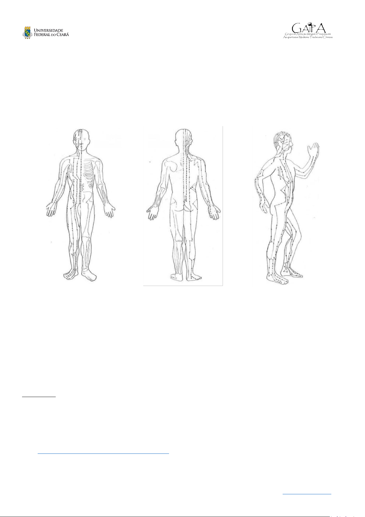 1 www.gaipa.ufc.br ROTEIRO PARA IDENTIFICAÇÃO DO TRAJETO DOS MERIDIANOS PRINCIPAIS CONTEÚDO Quadro 01. Roteiro dos meridianos principais Yīn (陰) da mão (shǒu) e do pé (zú) agrupados segundo os grandes meridianos. Quadro 02. Roteiro dos meridianos principais Yáng (陽) da mão (shǒu) e do pé (zú) agrupados segundo os grandes meridianos. Quadro 03. Trajeto dos 12 Meridianos Principais (jing mai, main meridian, twelve meridians, regular meridian). REFERÊNCIAS BEIJING COLLEGE OF CHINESE MEDICINE (Org.). Essentials of Chinese Medicine. Beijing: Foreign Languages Press; 1988. WORLD HEALTH ORGANIZATION. WHO international standard terminologies on traditional medicine in the Western Pacific Region. Manila: WHO Regional Office for the Western Pacific, 2007, pg 28-32 (38-34). Disponível em: . http://www.gaipa.ufc.br/ https://apps.who.int/iris/handle/10665/206952 ROTEIRO PARA IDENTIFICAÇÃO DO TRAJETO DOS MERIDIANOS 2 www.gaipa.ufc.br Quadro 01. Roteiro dos meridianos principais Yīn (陰) da mão (shǒu) e do pé (zú) agrupados segundo os grandes meridianos. CHANNEL OF HAND AND FOOT TAIYIN CHANNEL OF HAND AND FOOT JUEYIN CHANNEL OF HAND AND FOOT SHAOYIN Lung meridian (LU) / Fèi Jīng (手太陰肺經) Pericardium meridian (PC) / Xīn Bāo Jīng (手厥陰心包經) Heart meridian (HT) / Xīn Jīng (手少陰心經) Spleen meridian (SP) / Pí Jīng (足太陰脾經) Liver meridian (LR) / Gān Jīng (足厥陰肝經) Kidney meridian (KI) / Shèn Jīng (足少陰腎經) Fonte: adaptado de WORLD HEALTH ORGANIZATION. WHO international standard terminologies on traditional medicine in the Western Pacific Region. Manila: WHO Regional Office for the Western Pacific, 2007, pg 28-32 (38-34). Disponível em: . BEIJING COLLEGE OF CHINESE MEDICINE (Org.). Essentials of Chinese Medicine. Beijing: Foreign Languages Press; 1988. http://www.gaipa.ufc.br/ https://apps.who.int/iris/handle/10665/206952 ROTEIRO PARA IDENTIFICAÇÃO DO TRAJETO DOS MERIDIANOS 3 www.gaipa.ufc.br Quadro 02. Roteiro dos meridianos principais Yáng (陽) da mão (shǒu) e do pé (zú) agrupados segundo os grandes meridianos. CHANNEL OF HAND AND FOOT TAIYANG CHANNEL OF HAND AND FOOT SHAOYANG CHANNEL OF HAND AND FOOT YANGMING Small intestine meridian (SI) /Xiǎo Cháng Jīng(手太陽小腸經) Triple energizer meridian (TE) /Sān Jiāo Jīng(手少陽三焦經) Large intestine meridian (LI)/Dà Cháng Jīng(手陽明大腸經) Bladder meridian (BL) / Pǎng Guāng Jīng (足太陽膀胱經) Gallbladder meridian (GB) / Dǎn Jīng (足少陽膽經) Stomach meridian (ST) / Wèi Jīng (足陽明胃經) Fonte: adaptado pelo Projeto GAIPA-UFC de WORLD HEALTH ORGANIZATION. WHO international standard terminologies on traditional medicine in the Western Pacific Region. Manila: WHO Regional Office for the Western Pacific, 2007, pg 28-32 (38-34).; Disponível em: . BEIJING COLLEGE OF CHINESE MEDICINE (Org.). Essentials of Chinese Medicine. Beijing: Foreign Languages Press; 1988. http://www.gaipa.ufc.br/ https://apps.who.int/iris/handle/10665/206952 ROTEIRO PARA IDENTIFICAÇÃO DO TRAJETO DOS MERIDIANOS 4 www.gaipa.ufc.br Quadro 03. Trajeto dos 12 Meridianos Principais (jing mai, main meridian, twelve meridians, regular meridian) MERIDIAN NAME TRAJECT Lung meridian (LU) • Shǒu Tài Yīn Fèi Jīng • 手太陰肺經 Begins internally in the middle energizer, descends to connect with the large intestine, then ascends to the lung and throat, courses laterally and exits superficially at Zhongfu (LU1), and then descends along the lateral side of the arm and forearm, terminates at Shaoshang (LU11), with 11 acupuncture points on either side. Large intestine meridian (LI) • Shǒu Yáng Míng Dà Cháng Jīng • 手陽明大腸經 Originates at Shangyang (LI1) and ascends the dorsal surface of the hand and forearm, the lateral side of the arm, the dorsal side of the shoulder to Jugu (LI16) where the meridian/channel enters internally and travels posteriorly to Dazhui (GV14), and then courses anteriorly to the supraclavicular fossa where it descends past the diaphragm to connect with the large intestine. The superficial supraclavicular branch ascends the anterior lateral neck and the mandible, connects internally with the lower teeth, encircles the lips and terminates at the opposite Yingxiang (LI20). There are 20 acupuncture points on either side of the body. http://www.gaipa.ufc.br/ ROTEIRO PARA IDENTIFICAÇÃO DO TRAJETO DOS MERIDIANOS 5 www.gaipa.ufc.br Stomach meridian (ST) • Zú Yáng Míng Wèi Jīng • 足陽明胃經 Originates internally at the lateral edge of the nose, then continues to ST1 at the inferior border of the orbit, descends to the upper gum, courses around the mouth, and travels up to ST8 at the hairline of the temple. From here it continues internally to terminate at GV24. The facial branch descends from ST5 where it turns internally and descends past the diaphragm to connect with the stomach and spleen. The supraclavicular fossa branch descends along the midclavicular line to ST30 in the inguinal region, then anteriorly along the lateral margin of the femur to the patella, terminating at ST45 on the lateral side of the tip of the second toe. The gastric branch descends internally past the umbilicus and terminates at ST30. The tibial branch leaves ST36 and descends along the fibula, terminating at the lateral side of the tip of the middle toe. The dorsal foot branch leaves ST42 and descends to the medial side of the great toe at SP1. There are 45 acupuncture points on either side of the body. Spleen meridian (SP) • Zú Tài Yīn Pí Jīng • 足太陰脾經 Runs from Yinbai (SP1) at the medial side of the great toe, ascends along the medial side of the foot and tibia and anteromedial side of the thigh to the lower abdomen. It then enters the abdomen and connects with the spleen and stomach. The meridian ascends at a distance of 4.0 cun lateral to the conception vessel, and terminates superficially at Dabao (