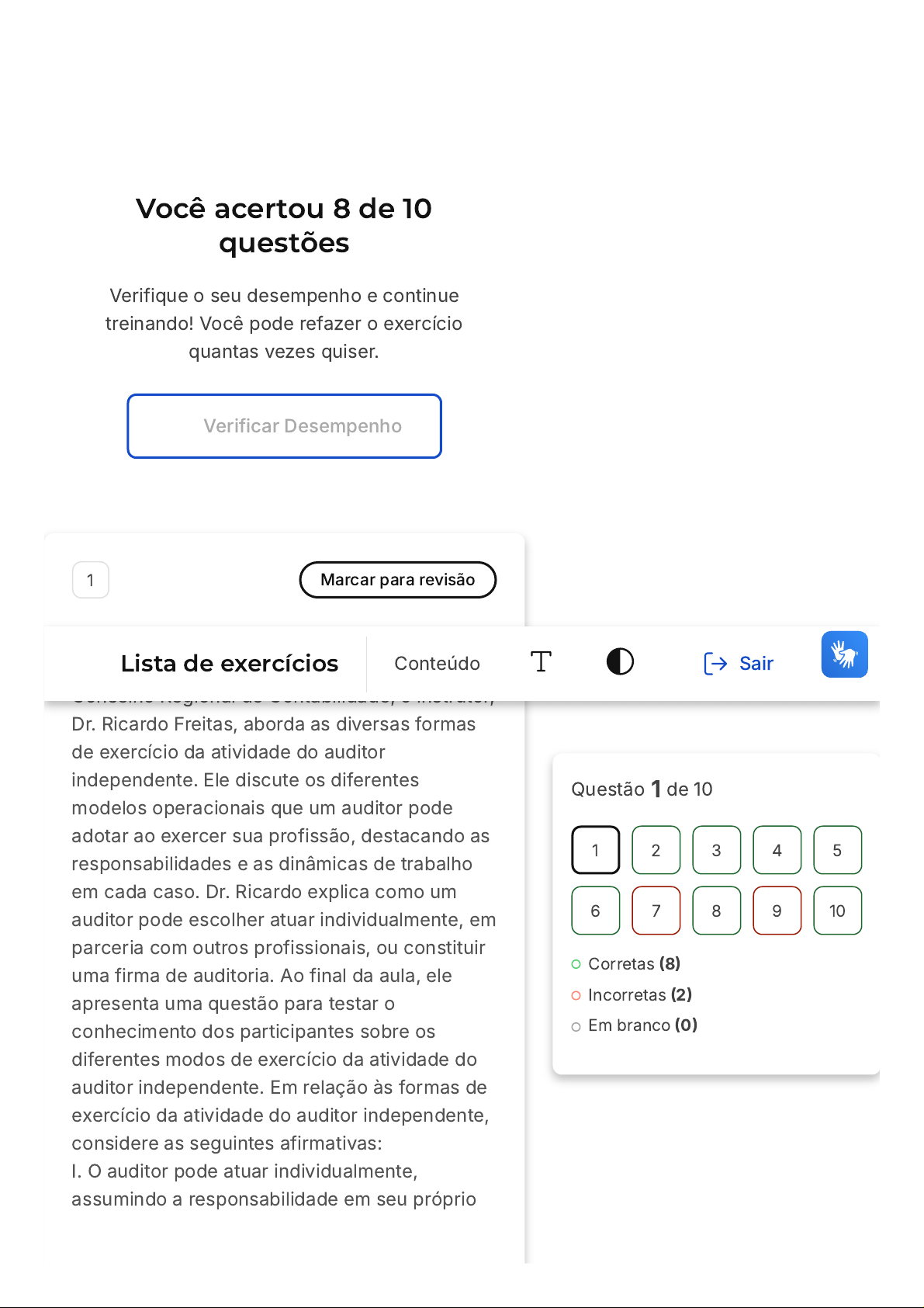 Você acertou 8 de 10 questões Verifique o seu desempenho e continue treinando! Você pode refazer o exercício quantas vezes quiser. Verificar Desempenho 1 Marcar para revisão Durante um curso de atualização para profissionais de auditoria, organizado pelo Conselho Regional de Contabilidade, o instrutor, Dr. Ricardo Freitas, aborda as diversas formas de exercício da atividade do auditor independente. Ele discute os diferentes modelos operacionais que um auditor pode adotar ao exercer sua profissão, destacando as responsabilidades e as dinâmicas de trabalho em cada caso. Dr. Ricardo explica como um auditor pode escolher atuar individualmente, em parceria com outros profissionais, ou constituir uma firma de auditoria. Ao final da aula, ele apresenta uma questão para testar o conhecimento dos participantes sobre os diferentes modos de exercício da atividade do auditor independente. Em relação às formas de exercício da atividade do auditor independente, considere as seguintes afirmativas: I. O auditor pode atuar individualmente, assumindo a responsabilidade em seu próprio Questão 1 de 10 Corretas (8) Incorretas (2) Em branco (0) 1 2 3 4 5 6 7 8 9 10 Lista de exercícios Conteúdo Sair A B C D E nome, mesmo contando com assistentes ou auxiliares. II. Em parceria com outros profissionais, o auditor divide a responsabilidade com seus colegas, atuando em nome de todos na execução dos trabalhos. III. Constituindo uma firma, o auditor pode trabalhar em conjunto com outros profissionais, operando sob uma denominação social ou firma em nome coletivo. Assinale a alternativa que indica as afirmativas corretas Apenas I Apenas II Apenas III Apenas I e II I, II e III Resposta correta Parabéns, você selecionou a alternativa correta. Confira o gabarito comentado! Gabarito Comentado Todas as afirmativas estão corretas, descrevendo as diferentes formas de exercício da atividade do auditor independente: individualmente, em parceria com outros profissionais e por A B C D E meio de uma firma que congregue vários profissionais 2 Marcar para revisão Considerando as responsabilidades na prevenção e detecção de fraudes, analise as seguintes afirmativas: I. A administração é a principal responsável pela prevenção e detecção de fraudes. II. O auditor é responsável por detectar todas as fraudes durante a auditoria. III. A governança corporativa desempenha um papel crucial na prevenção de fraudes. Assinale a alternativa que indica as afirmativas corretas Apenas a afirmativa I está correta Apenas a afirmativa II está correta Apenas as afirmativas I e III estão corretas Apenas as afirmativas II e III estão corretas Apenas as afirmativas I e II estão corretas Resposta correta Parabéns, você selecionou a alternativa correta. Confira o gabarito comentado! Gabarito Comentado A administração é a principal responsável pela prevenção e detecção de fraudes, e a governança corporativa desempenha um papel crucial na prevenção de fraudes. O auditor não é responsável por detectar todas as fraudes, mas sim por conduzir a auditoria de forma a identificar possíveis fraudes e comunicá-las 3 Marcar para revisão Sobre a estrutura de carreira em firmas de auditoria, analise as afirmativas a seguir: I. Trainees em firmas de auditoria são designados a um mentor ou supervisor que fornece orientação contínua, apoio e feedback. É o cargo principal dentro de uma firma de auditoria. II. Auditores seniores são responsáveis por gerenciar vários assistentes e revisar seu trabalho, além de elaborar ou modificar programas de auditoria conforme necessário. III. Os sócios de auditoria, além de suas responsabilidades técnicas, dedicam uma parte significativa de seu tempo às relações públicas e aos contatos profissionais para conquistar novos clientes. Assinale a alternativa que indica as afirmativas corretas A B C D E Apenas I Apenas II Apenas I e III Apenas I e II Apenas II e III. Resposta correta Parabéns, você selecionou a alternativa correta. Confira o gabarito comentado! Gabarito Comentado II e III estão corretas, refletindo aspectos importantes das funções e responsabilidades em diferentes níveis da carreira dentro de firmas de auditoria 4 Marcar para revisão Durante o seminário anual de capacitação da GlobalAudit, uma firma de auditoria com operações internacionais, os auditores juniores estão sendo treinados nas melhores práticas de coleta de evidências para auditorias financeiras. O instrutor, Pedro Costa, um auditor experiente, está enfatizando a importância da qualidade e confiabilidade das evidências coletadas para suportar as conclusões da A B C D E auditoria. Pedro explica que diferentes tipos de evidências têm diferentes níveis de confiabilidade e que é crucial para os auditores saberem identificar e registrar adequadamente essas evidências. Para reforçar os conceitos discutidos, Pedro apresenta algumas afirmativas e pede aos participantes que analisem e discutam a validade de cada uma. No processo de auditoria, a coleta de evidências é essencial para formar uma opinião sobre as demonstrações financeiras de uma empresa. Considere as afirmativas a seguir sobre a coleta de evidências: I. A confiabilidade das evidências é maior quando obtidas diretamente de fontes externas. II. Evidências obtidas por meio de entrevistas com a administração são sempre consideradas as mais confiáveis. III. As evidências devem ser registradas nos papéis de trabalho do auditor para suportar as conclusões da auditoria. Assinale a alternativa que indica as afirmativas corretas Apenas a afirmativa I está correta Apenas a afirmativa II está correta Apenas a afirmativa III está correta Apenas as afirmativas I e III estão corretas Apenas as afirmativas I e II estão corretas Resposta correta A B Parabéns, você selecionou a alternativa correta. Confira o gabarito comentado! Gabarito Comentado As evidências obtidas diretamente de fontes exte