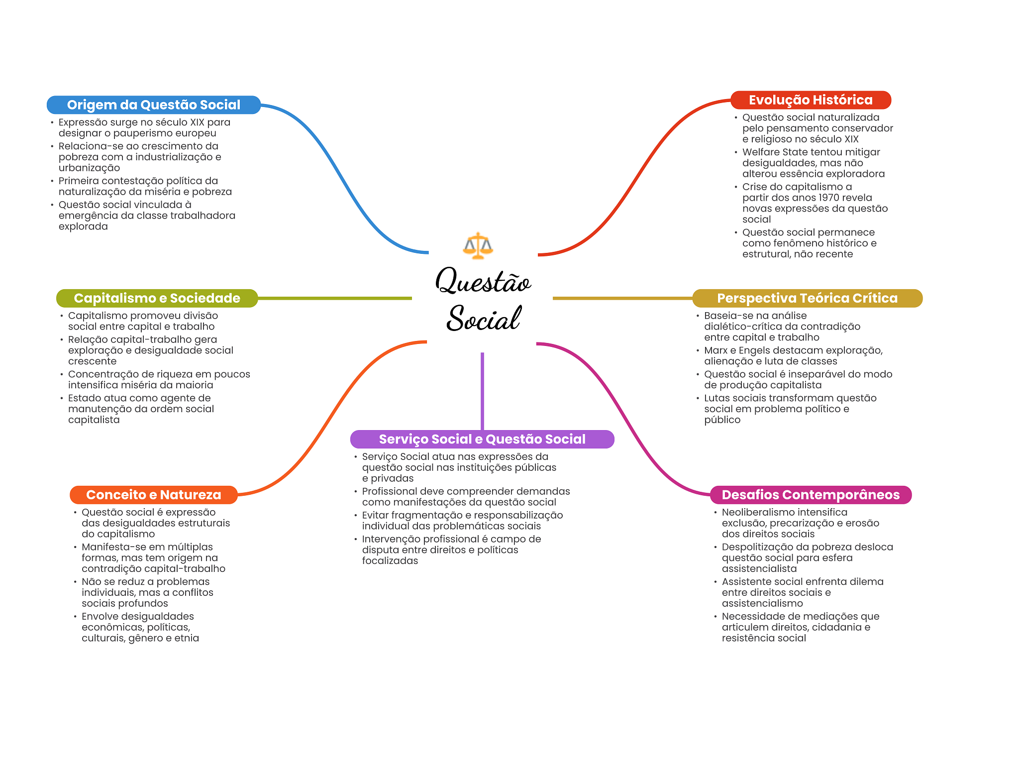 Origem da Questão Social Evolução Histórica Expressão surge no século XIX para Questão social naturalizada designar pauperismo europeu pelo pensamento conservador e religioso no século XIX Relaciona-se ao crescimento da pobreza com a industrialização e Welfare State tentou mitigar urbanização desigualdades, mas não alterou essência exploradora Primeira contestação política da naturalização da miséria e pobreza Crise do capitalismo a partir dos anos 1970 revela Questão social vinculada à novas expressões da questão emergência da classe trabalhadora social explorada Questão social permanece como fenômeno histórico e estrutural, não recente Questão Capitalismo e Sociedade Perspectiva Teórica Crítica Capitalismo promoveu divisão Social Baseia-se na análise social entre capital e trabalho dialético-crítica da contradição Relação capital-trabalho gera entre capital e trabalho exploração e desigualdade social Marx e Engels destacam exploração, crescente alienação e luta de classes Concentração de riqueza em poucos Questão social é inseparável do modo intensifica miséria da maioria de produção capitalista Estado atua como agente de Lutas sociais transformam questão manutenção da ordem social social em problema político e capitalista público Serviço Social e Questão Social Serviço Social atua nas expressões da questão social nas instituições públicas e privadas Conceito e Natureza Profissional deve compreender demandas Desafios Contemporâneos como manifestações da questão social Questão social é expressão Evitar fragmentação e responsabilização Neoliberalismo intensifica das desigualdades estruturais individual das problemáticas sociais exclusão, precarização e erosão do capitalismo dos direitos sociais Intervenção profissional é campo de Manifesta-se em múltiplas disputa entre direitos e políticas Despolitização da pobreza desloca formas, mas tem origem na focalizadas questão social para esfera contradição capital-trabalho assistencialista Não se reduz a problemas Assistente social enfrenta dilema individuais, mas a conflitos entre direitos sociais e sociais profundos assistencialismo Envolve desigualdades Necessidade de mediações que econômicas, políticas, articulem direitos, cidadania e culturais, gênero e etnia resistência social