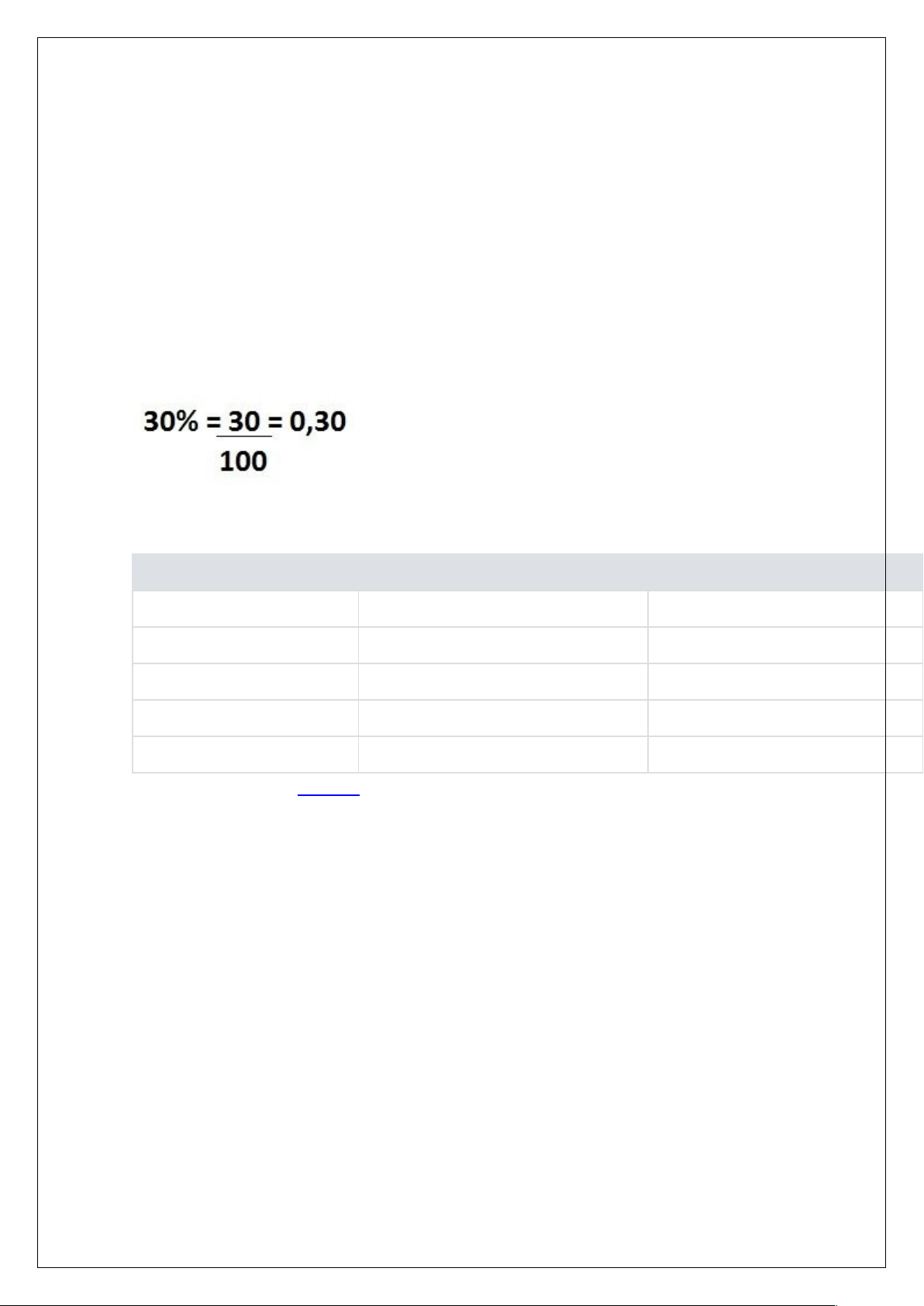 Porcentagem A Porcentagem ou Percentagem representa uma razão cujo denominador é igual a 100 e indica uma comparação de uma parte com o todo. O símbolo % é usado para designar a porcentagem. Um valor em porcentagem, pode ainda ser expresso na forma de fração centesimal (denominador igual a 100) ou como um número decimal. Exemplo: Para facilitar o entendimento, veja a tabela abaixo: Porcentagem Razão Centesimal Número Decimal 1% 1/100 0,01 5% 5/100 0,05 10% 10/100 0,1 120% 120/100 1,2 250% 250/100 2,5 Saiba mais sobre as Frações. Como Calcular a Porcentagem? Podemos utilizar diversas formas para calcular a porcentagem. Abaixo apresentamos três formas distintas: · regra de três · transformação da porcentagem em fração com denominador igual a 100 · transformação da porcentagem em número decimal Devemos escolher a forma mais adequada conforme o problema que queremos resolver. Exemplo 1: Calcule 30% de 90 Para usar a regra de três no problema, vamos considerar que 90 corresponde ao todo, ou seja, 100%. O valor que queremos encontrar chamaremos x. A regra de três será expressa como: Para resolver usando frações, primeiro temos que transformar a porcentagem em uma fração com denominador igual a 100: Podemos ainda transformar a porcentagem em número decimal: 30% = 0,3 0,3 . 90 = 27 O resultado é o mesmo nas três formas, ou seja, 30% de 90 corresponde a 27. Exemplo 2: 90 corresponde a 30% de qual valor? Note que nesse exemplo, já conhecemos o resultado da porcentagem e queremos conhecer o valor que corresponde ao todo (100%). Usando a regra de três, temos: Podemos ainda resolver o problema transformando a porcentagem em número decimal: 30% = 0,3 Então é só resolver a seguinte equação: Assim, 30% de 300 é igual a 90. 3) 90 corresponde a quanto por cento de 360? Podemos resolver esse problema escrevendo na forma de fração: Ou ainda, podemos resolver usando regra de três: Desta forma, 90 corresponde a 25% de 360. image5.jpeg image6.png image7.png image8.png image9.jpeg image10.png image1.jpeg image2.jpeg image3.png image4.png