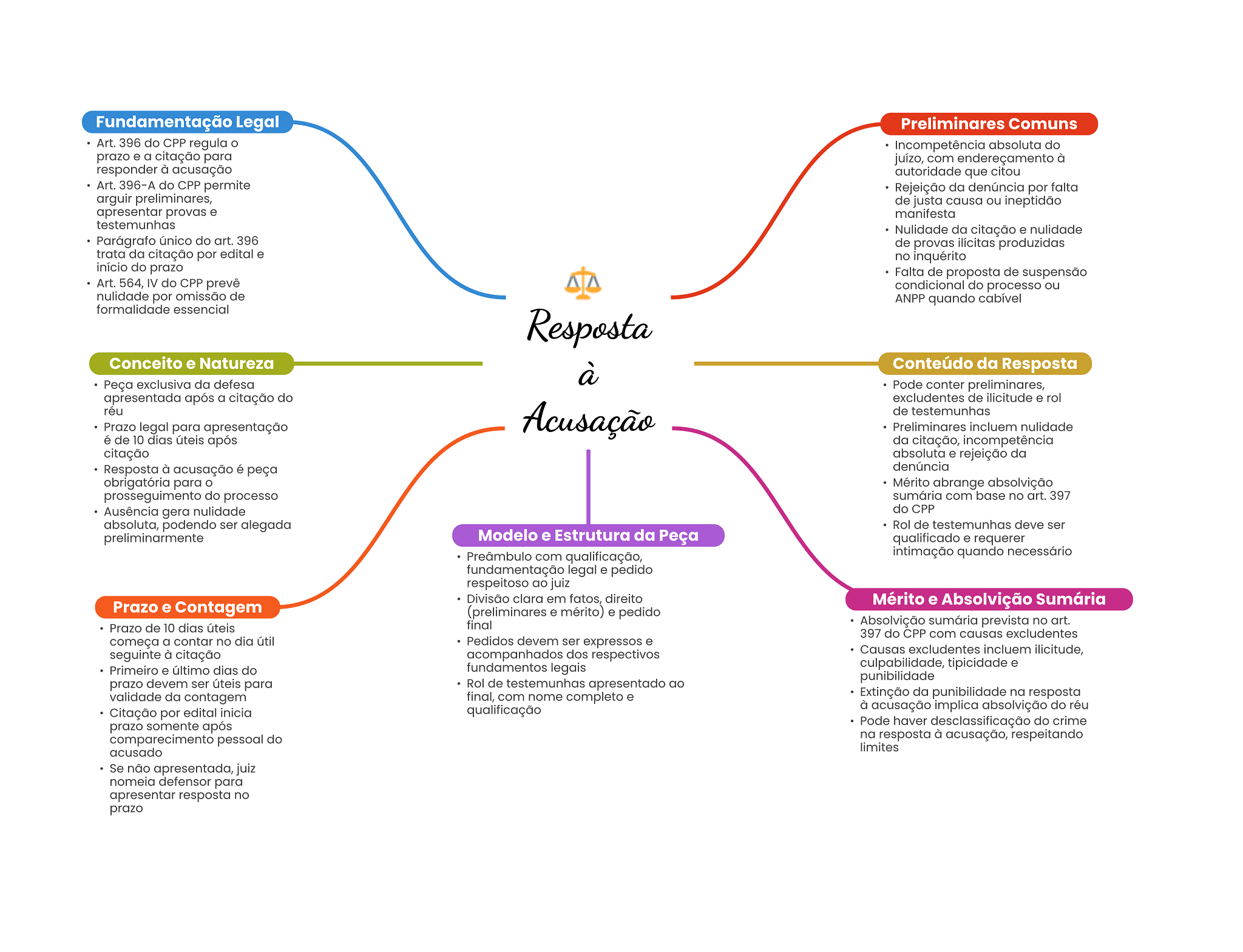 Fundamentação Legal Preliminares Comuns Art. 396 do CPP regula Incompetência absoluta do prazo e a citação para juízo, com endereçamento à responder à acusação autoridade que citou Art. 396-A do CPP permite Rejeição da denúncia por falta arguir preliminares, de justa causa ou ineptidão apresentar provas e manifesta testemunhas Nulidade da citação e nulidade Parágrafo único do art. 396 de provas ilícitas produzidas trata da citação por edital e no inquérito início do prazo Falta de proposta de suspensão Art. 564, IV do CPP prevê condicional do processo ou nulidade por omissão de ANPP quando cabível formalidade essencial Resposta Conceito e Natureza à Conteúdo da Resposta Peça exclusiva da defesa Pode conter preliminares, apresentada após a citação do excludentes de ilicitude e rol réu Acusação de testemunhas Prazo legal para apresentação Preliminares incluem nulidade é de 10 dias úteis após da citação, incompetência citação absoluta e rejeição da Resposta à acusação é peça denúncia obrigatória para Mérito abrange absolvição prosseguimento do processo sumária com base no art. 397 Ausência gera nulidade do CPP absoluta, podendo ser alegada Rol de testemunhas deve ser preliminarmente Modelo e Estrutura da Peça qualificado e requerer Preâmbulo com qualificação, intimação quando necessário fundamentação legal e pedido respeitoso ao juiz Divisão clara em fatos, direito Prazo e Contagem Mérito e Absolvição Sumária (preliminares e mérito) e pedido Prazo de 10 dias úteis final Absolvição sumária prevista no art. 397 do CPP com causas excludentes começa a contar no dia útil Pedidos devem ser expressos e seguinte à citação acompanhados dos respectivos Causas excludentes incluem ilicitude, fundamentos legais culpabilidade, tipicidade e Primeiro e último dias do punibilidade prazo devem ser úteis para Rol de testemunhas apresentado ao validade da contagem final, com nome completo e Extinção da punibilidade na resposta Citação por edital inicia qualificação à acusação implica absolvição do réu prazo somente após Pode haver desclassificação do crime comparecimento pessoal do na resposta à acusação, respeitando acusado limites Se não apresentada, juiz nomeia defensor para apresentar resposta no prazo