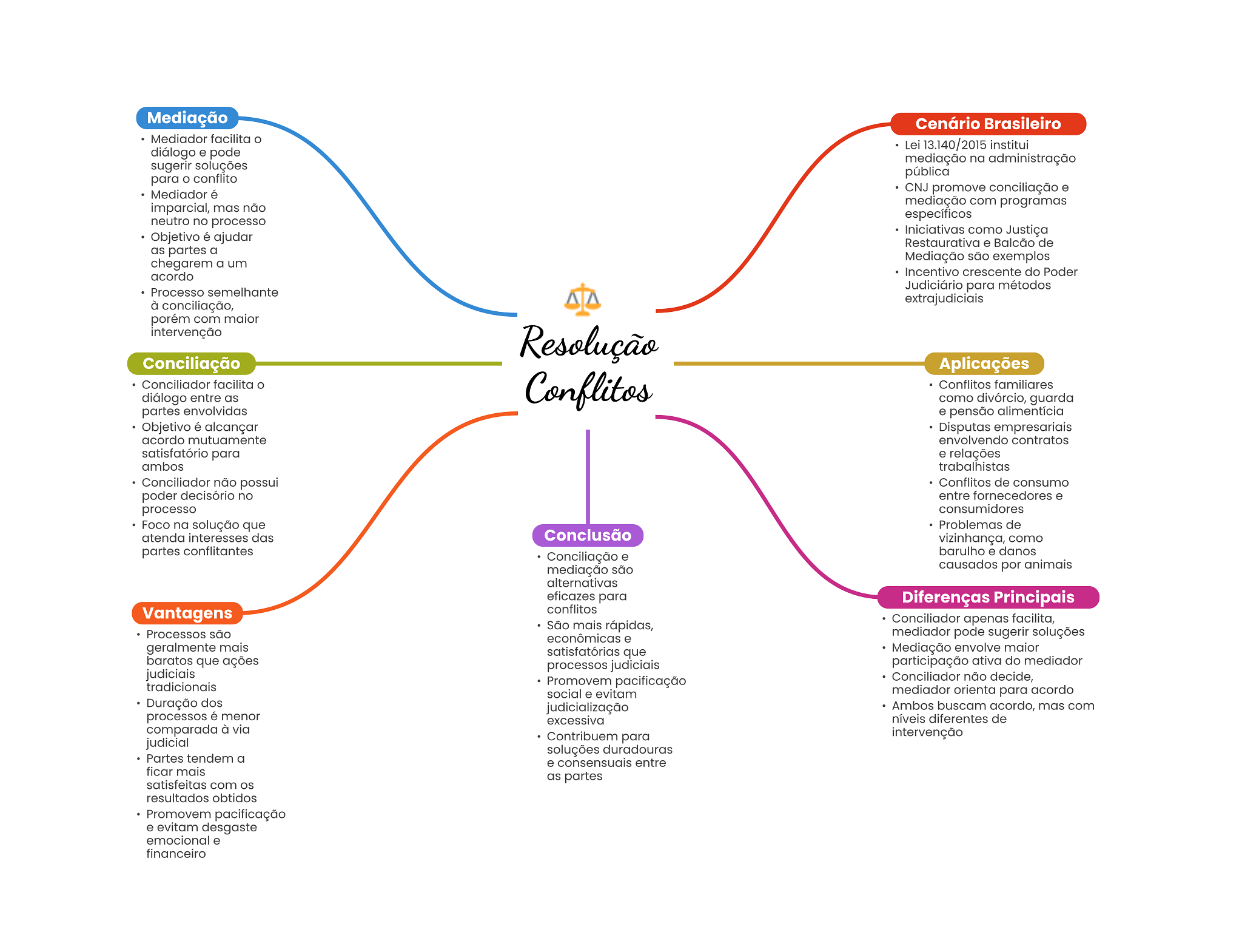 Mediação Cenário Brasileiro Mediador facilita O Lei 13.140/2015 institui diálogo e pode sugerir soluções mediação na administração para conflito pública Mediador é CNJ promove conciliação e imparcial, mas não mediação com programas específicos neutro no processo Objetivo é ajudar Iniciativas como Justiça Restaurativa e Balcão de as partes a Mediação são exemplos chegarem a um acordo Incentivo crescente do Poder Processo semelhante Judiciário para métodos à conciliação, extrajudiciais porém com maior intervenção Resolução Conciliação Aplicações Conciliador facilita diálogo entre as Conflitos Conflitos familiares como divórcio, guarda partes envolvidas e pensão alimentícia Objetivo é alcançar Disputas empresariais acordo mutuamente envolvendo contratos satisfatório para e relações ambos trabalhistas Conciliador não possui Conflitos de consumo poder decisório no entre fornecedores e processo consumidores Foco na solução que Problemas de atenda interesses das Conclusão vizinhança, como partes conflitantes Conciliação e barulho e danos mediação são causados por animais alternativas eficazes para Diferenças Principais Vantagens conflitos São mais rápidas, Conciliador apenas facilita, Processos são econômicas e mediador pode sugerir soluções geralmente mais satisfatórias que Mediação envolve maior baratos que ações processos judiciais participação ativa do mediador judiciais Promovem pacificação Conciliador não decide, tradicionais social e evitam mediador orienta para acordo Duração dos judicialização Ambos buscam acordo, mas com processos é menor excessiva níveis diferentes de comparada à via judicial Contribuem para intervenção soluções duradouras Partes tendem a e consensuais entre ficar mais as partes satisfeitas com resultados obtidos Promovem pacificação e evitam desgaste emocional e financeiro