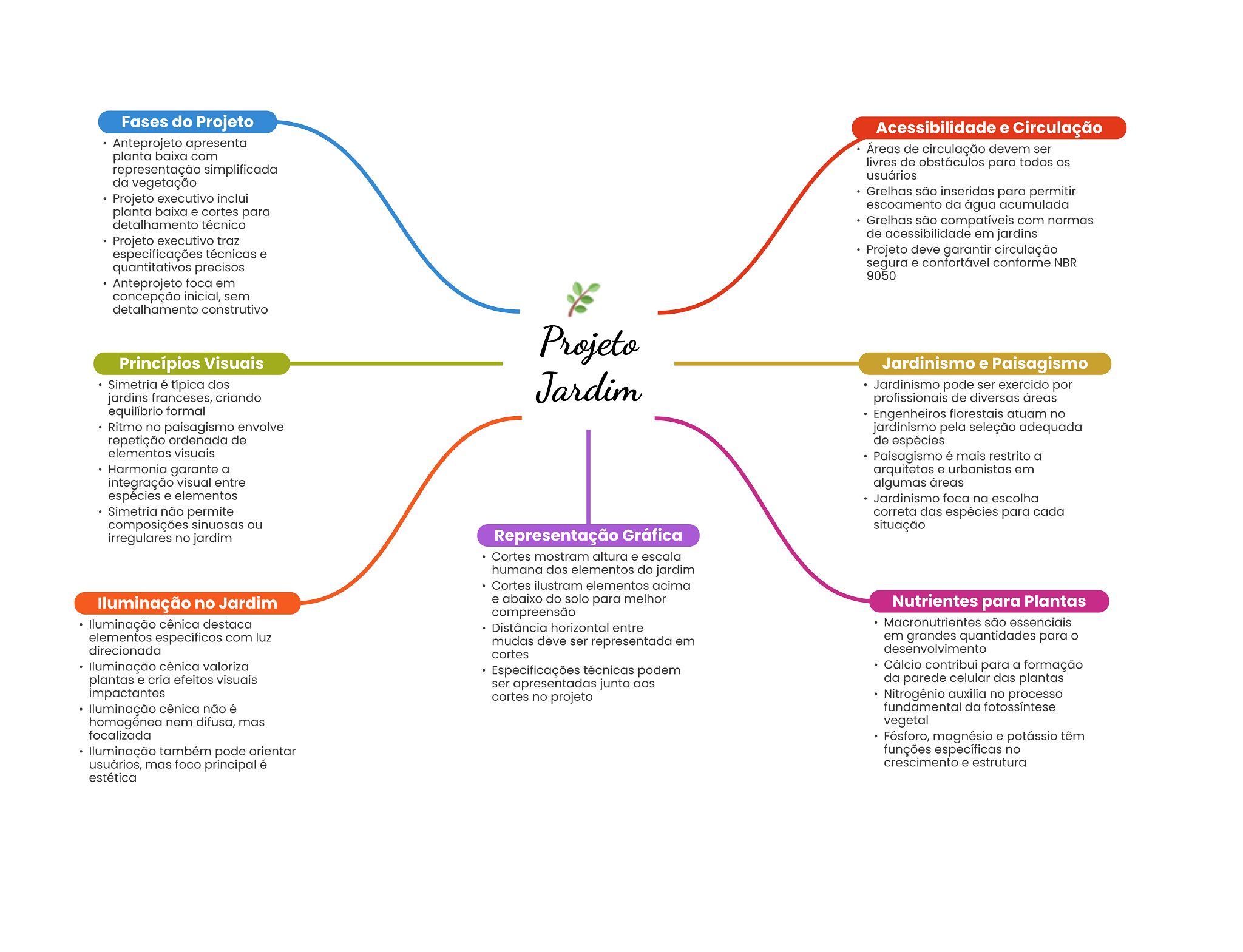 Fases do Projeto Acessibilidade e Circulação Anteprojeto apresenta Áreas de circulação devem ser planta baixa com livres de obstáculos para todos representação simplificada usuários da vegetação Grelhas são inseridas para permitir Projeto executivo inclui escoamento da água acumulada planta baixa e cortes para detalhamento técnico Grelhas são compatíveis com normas Projeto executivo traz de acessibilidade em jardins especificações técnicas e Projeto deve garantir circulação quantitativos precisos segura e confortável conforme NBR 9050 Anteprojeto foca em concepção inicial, sem detalhamento construtivo Projeto Princípios Visuais Jardinismo e Paisagismo Simetria é típica dos Jardim Jardinismo pode ser exercido por jardins franceses, criando profissionais de diversas áreas equilíbrio formal Engenheiros florestais atuam no Ritmo no paisagismo envolve jardinismo pela seleção adequada repetição ordenada de de espécies elementos visuais Paisagismo é mais restrito a Harmonia garante a arquitetos e urbanistas em integração visual entre algumas áreas espécies e elementos Jardinismo foca na escolha Simetria não permite correta das espécies para cada composições sinuosas ou situação irregulares no jardim Representação Gráfica Cortes mostram altura e escala humana dos elementos do jardim Cortes ilustram elementos acima Iluminação no Jardim e abaixo do solo para melhor Nutrientes para Plantas compreensão cênica destaca Distância horizontal entre Macronutrientes são essenciais elementos específicos com luz mudas deve ser representada em em grandes quantidades para O direcionada desenvolvimento cortes Iluminação cênica valoriza Especificações técnicas podem Cálcio contribui para a formação plantas e cria efeitos visuais ser apresentadas junto aos da parede celular das plantas impactantes cortes no projeto Nitrogênio auxilia no processo Iluminação cênica não é fundamental da fotossíntese homogênea nem difusa, mas vegetal focalizada Fósforo, magnésio e potássio têm também pode orientar funções específicas no usuários, mas foco principal é crescimento e estrutura estética