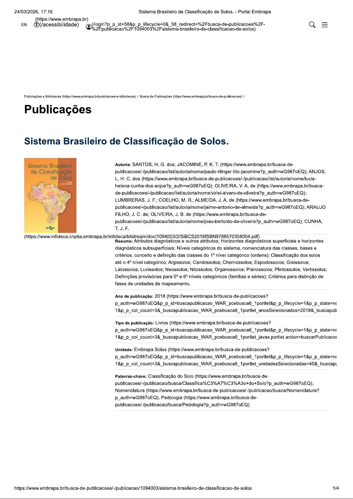 24/03/2026, 17:16 Sistema Brasileiro de Classificação de Solos. Portal Embrapa EN (/login?p Publicações e Bibliotecas (https://www.embrapa.br/publicacoes-e-bibliotecas) / Busca de Publicações (https://www.embrapa.br/busca-de-publicacoes) / Publicações Sistema Brasileiro de Classificação de Solos. Sistema Brasileiro Autoria: SANTOS, H. G. dos; JACOMINE, P. K. T. (https://www.embrapa.br/busca-de- de Classificação ANJOS, de Solos L.H.C. dos OLIVEIRA, V.A. de LUMBRERAS, J. F.; COELHO, M. R.; ALMEIDA, J.A. de FILHO, J.C. de; OLIVEIRA, J.B. de (https://www.embrapa.br/busca-de- CUNHA, T.J.F. Resumo: Atributos diagnósticos e outros atributos; Horizontes diagnósticos superficiais e horizontes diagnósticos subsuperficiais; Níveis categóricos do sistema, nomenclatura das classes, bases e critérios, conceito e definição das classes do 1° nível categórico (ordens); Classificação dos solos até o 4° nível categórico; Argissolos; Cambissolos; Chernossolos; Espodossolos; Gleissolos; Latossolos; Luvissolos; Neossolos; Nitossolos; Organossolos; Planossolos; Plintossolos; Vertissolos; Definições provisórias para 5° e 6° níveis categóricos (famílias e séries); Critérios para distinção de fases de unidades de mapeamento. Ano de publicação: 2018 (https://www.embrapa.br/busca-de-publicacoes? Tipo de publicação: Livros Unidade: Embrapa Solos Palavras-chave: Classificação do Solo (https://www.embrapa.br/busca-de- Nomenclatura p_auth=wG987oEQ), Pedologia (https://www.embrapa.br/busca-de- publicacoes/-/publicacao/busca/Pedologia?p_auth=wG987oEQ) 1/424/03/2026, 17:16 Sistema Brasileiro de Classificação de Solos. Portal Embrapa Mais Informações Baixar publicação (PDF) Baixar publicação (ePub) CONTEÚDO RELACIONADO Notícias Ver mais (/busca- geral/-/busca/relacionados/publicacao/1094003/noticia) Livro "Sistema Brasileiro de Classificação de Solos" ganha nova tiragem (/busca-de-noticias/-/noticia/90112383/livro- tiragem) Pré-inscrições abertas para a XV Reunião Brasileira de Classificação e Correlação de Solos (/busca-de- noticias/-/noticia/85674119/pre-inscricoes-abertas-para-a- xv-reuniao-brasileira-de-classificacao-e-correlacao-de- solos) Embrapa Solos ajudou a desvendar o território brasileiro (/busca-de-noticias/-/noticia/80943508/embrapa-solos- Observações 1 Por padrão são exibidas publicações dos últimos 20 anos. Para encontrar publicações mais antigas, configure o filtro ano de publicação, colocando o ano a partir do qual você deseja encontrar publicações. filtro está na coluna da esquerda na busca acima. 2 Para ler algumas publicações da Embrapa (apenas as que estão em formato ePub), é necessário ter, no celular ou computador, um desses softwares gratuitos. Sistemas Android: Google Play Livros IOS: iBooks (https://itunes.apple.com/br/app/ibooks/id364709193?mt=8); Windows e Linux: software Calibre (https://calibre-ebook.com/). Acesse outras publicações Acesse a Base de Dados da Pesquisa Agropecuária (BDPA) (/bdpa) para consultar o acervo completo das bibliotecas da Embrapa. Siga a Embrapa nas redes sociais 2/424/03/2026, 17:16 Sistema Brasileiro de Classificação de Solos. Portal Embrapa Empresa Brasileira de Pesquisa Agropecuária X f in Parque Estação Biológica PqEB, Brasília, DF (/youtube) (/facebook- (/flickr) (/instagram) (https://br.linkedin.com/company/embrapa) CEP 70770-901 / Telefone: (61) 3448-4433 embrapa) E-mail: sac@embrapa.br Para empresas e startups Como fazer parceria com a Embrapa Ativos disponíveis para parcerias (/ativos-para-parcerias) Licenciamento de tecnologias Embrapa (/licenciamento) Financiamento, desafios e programas (/financiamentos-desafios-e-programas-de-inovacao) Para produtores e técnicos Conteúdos técnicos (/conteudos-tecnicos) Catálogo de tecnologias Como comprar ou ter acesso a tecnologias Cultivos e criações Sistemas de produção Ageitec Para pesquisadores e estudantes Publicações científicas (/publicacoes-cientificas) Portfólios de projetos (/pesquisa-e-desenvolvimento/portfolios) Dados de pesquisa (/dados-de-pesquisa) Serviços laboratoriais e de acesso a materiais (/acessoainformacao/carta-de-servicos-ao-cidadao/servicos) Serviços de bibliotecas (/seb/servicos) Institucional Sobre a Embrapa (/sobre-a-embrapa) Dirigentes (/dirigentes) Embrapa no Brasil (/embrapa-no-brasil) Atuação internacional (/atuacao-internacional) Relações institucionais (/relacoes-institucionais) Organograma (/organograma) Estágios e concursos (/estagios-e-concursos) Atendimento Fale conosco (/fale-conosco) Serviço de Atendimento ao Cidadão (SAC) (/fale-conosco/sac/) Serviço de Informação ao Cidadão (SIC) (/acessoainformacao/servico-de-informacao-ao-cidadao-sic) Ouvidoria (/ouvidoria) Carta de Serviços ao Cidadão Sala de imprensa (/sala-de-imprensa) Transparência e serviços Mapa do site (/mapa-do-site) Transparência e prestação de contas (/acessoainformacao/transparencia-e-prestacao-de-contas) Documentos institucionais e atos oficiais (/documentos-institucionais-e-atos-oficiais) Corregedoria (/corregedoria-da-embrapa) Comissão de Ética (/comissao-de-etica) Acesso externo SEI (/sei-sistema-eletronico-de-informacoes) Licitações e contratos (/acessoainformacao/licitacoes-e-contratos) 3/424/03/2026, 17:16 Sistema Brasileiro de Classificação de Solos. - Portal Embrapa Todos os direitos reservados, conforme Lei n° 9.610 Acesso restrito(/acesso-restrito) Portal Embrapa (Versão 3.163.0) p01 4/4