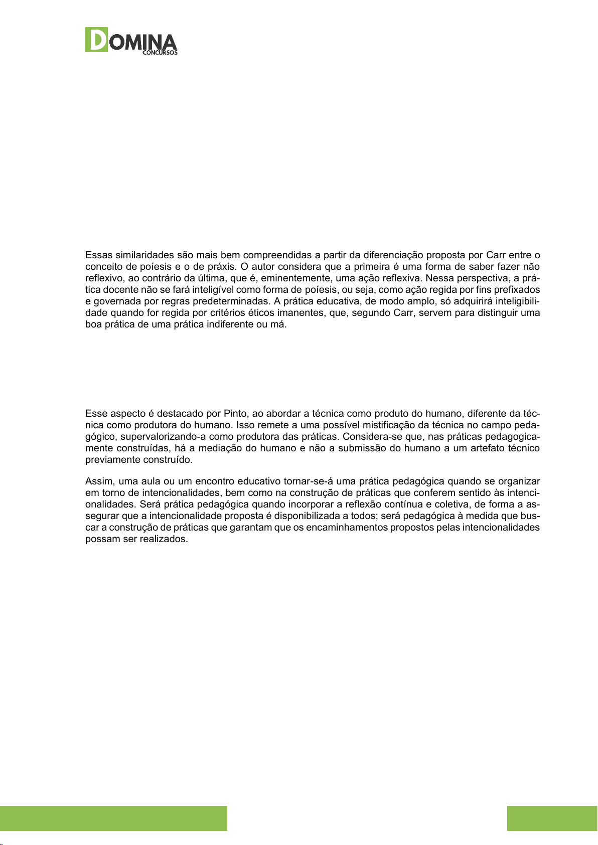 PRÁTICA PEDAGÓGICA 1 WWW.DOMINACONCURSOS.COM.BR Prática Pedagógica Afinal de contas, o que é uma prática pedagógica? Talvez essa pergunta seja muito frequente entre alunos e professores. Percebe-se, em suas falas, certa tendência em considerar como pedagógico apenas o roteiro didático de apresentação de aula, ou seja, apenas o visível dos comportamentos utili- zados pelo professor durante uma aula. Dessa situação, decorrem alguns questionamentos: 1) Prática docente é sempre uma prática pedagógica? 2) Existe prática pedagógica fora das escolas, além das salas de aula? 3) O que é, afinal de contas, o pedagógico? 4) O que caracteriza uma prática pedagógica? Essas similaridades são mais bem compreendidas a partir da diferenciação proposta por Carr entre o conceito de poíesis e o de práxis. O autor considera que a primeira é uma forma de saber fazer não reflexivo, ao contrário da última, que é, eminentemente, uma ação reflexiva. Nessa perspectiva, a prá- tica docente não se fará inteligível como forma de poíesis, ou seja, como ação regida por fins prefixados e governada por regras predeterminadas. A prática educativa, de modo amplo, só adquirirá inteligibili- dade quando for regida por critérios éticos imanentes, que, segundo Carr, servem para distinguir uma boa prática de uma prática indiferente ou má. É preferível considerar esses critérios éticos, a fim de distinguir uma prática tecida pedagogicamente - vista como práxis - de outra apenas tecnologicamente tecida - identificada como poiesis. Assim, realça- se o pressuposto que será o fio condutor do texto: há práticas docentes construídas pedagogicamente e há práticas docentes construídas sem a perspectiva pedagógica, num agir mecânico que desconsi- dera a construção do humano. Esse aspecto é destacado por Pinto, ao abordar a técnica como produto do humano, diferente da téc- nica como produtora do humano. Isso remete a uma possível mistificação da técnica no campo peda- gógico, supervalorizando-a como produtora das práticas. Considera-se que, nas práticas pedagogica- mente construídas, há a mediação do humano e não a submissão do humano a um artefato técnico previamente construído. Assim, uma aula ou um encontro educativo tornar-se-á uma prática pedagógica quando se organizar em torno de intencionalidades, bem como na construção de práticas que conferem sentido às intenci- onalidades. Será prática pedagógica quando incorporar a reflexão contínua e coletiva, de forma a as- segurar que a intencionalidade proposta é disponibilizada a todos; será pedagógica à medida que bus- car a construção de práticas que garantam que os encaminhamentos propostos pelas intencionalidades possam ser realizados. Nesse aspecto, uma prática pedagógica, em seu sentido de práxis, configura-se sempre como uma ação consciente e participativa, que emerge da multidimensionalidade que cerca o ato educativo. Como conceito, entende-se que ela se aproxima da afirmação de Gimeno Sacristán de que a prática educa- tiva é algo mais do que expressão do ofício dos professores; é algo que não pertence por inteiro aos professores, uma vez que há traços culturais compartilhados que formam o que pode ser designado por subjetividades pedagógicas. No entanto, destaca-se que o conceito de prática pedagógica poderá variar dependendo da compreensão de pedagogia e até mesmo do sentido que se atribui a prática. Serão analisadas algumas ambiguidades que parecem ter produzido equívocos no discurso pedagó- gico, acarretando entendimentos dúbios acerca do sentido de práticas pedagógicas. Práticas Educativas e Práticas Pedagógicas É comum considerar que práticas pedagógicas e práticas educativas sejam termos sinônimos e, por- tanto, unívocos. No entanto, quando se fala de práticas educativas, faz-se referência a práticas que ocorrem para a concretização de processos educacionais, ao passo que as práticas pedagógicas se referem a práticas sociais que são exercidas com a finalidade de concretizar processos pedagógicos. Fala-se, então, de práticas da Educação e práticas da Pedagogia. Contudo, Pedagogia e Educação são conceitos e práticas distintas? Uelbert Souza Uelbert Souza Uelbert Souza PRÁTICA PEDAGÓGICA 2 WWW.DOMINACONCURSOS.COM.BR Segundo o ponto de vista adotado neste artigo, trata-se de conceitos mutuamente articulados, porém, com especificidades diferentes. Pode-se afirmar que a educação, numa perspectiva epistemológica, é o objeto de estudo da Pedagogia, enquanto, numa perspectiva ontológica, é um conjunto de práticas sociais que atuam e influenciam a vida dos sujeitos, de modo amplo, difuso e imprevisível. Por sua vez, a Pedagogia pode ser considerada uma prática social que procura organizar/compreen- der/transformar as práticas sociais educativas que dão sentido e direção às práticas educacionais. Pode-se dizer que a Pedagogia impõe um filtro de significado à multiplicidade de práticas que ocorrem na vida das pessoas. A diferença é de foco, abrangência e significado, ou seja, a Pedagogia realiza um filtro nas influências sociais que, em totalidade, atuam sobre uma geração. Essa filtragem, que é o mecanismo utilizado pela ação pedagógica, é, na realidade, um processo de regulação e, como tal, um processo educativo. Reitera-se, assim, Pedagogia como prática social, que oferece/impõe/propõe/indica uma direção de sentido às práticas que ocorrem na sociedade, realçando seu caráter eminentemente político. No en- tanto, essa direção de sentido está cada vez mais complexa e difusa na sociedade atual. Processos vinculados a mídias como TV, internet e redes sociais on-line passam a ter, no século atual, grande influência educacional sobre as novas gerações, competindo com as escolas, que ficam em desigual- dade de condições. A escola e suas práticas pedagógicas têm tido dificuld