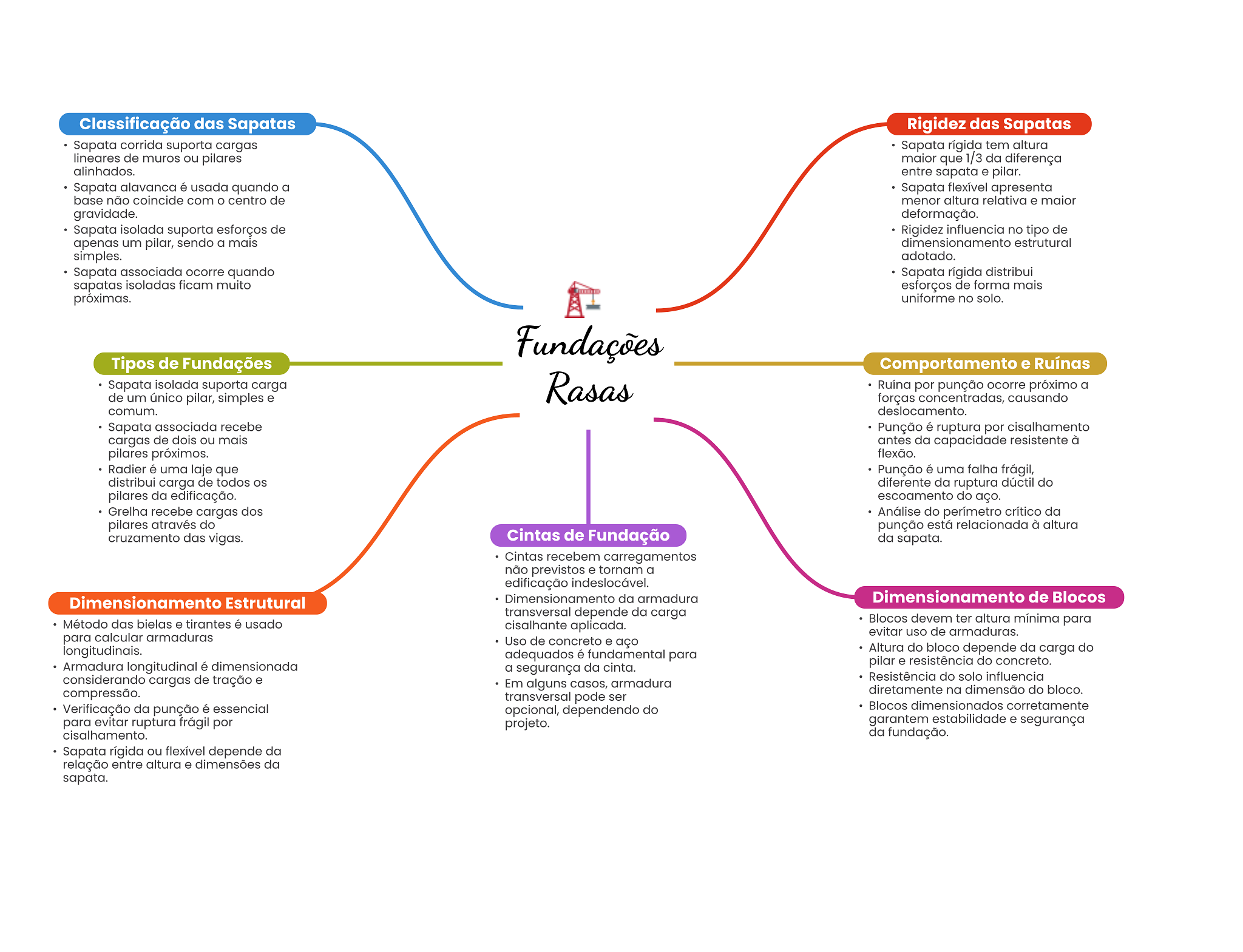 Classificação das Sapatas Rigidez das Sapatas Sapata corrida suporta cargas Sapata rígida tem altura lineares de muros ou pilares maior que 1/3 da diferença alinhados. entre sapata e pilar. Sapata alavanca é usada quando a Sapata flexível apresenta base não coincide com centro de menor altura relativa e maior gravidade. deformação. Sapata isolada suporta esforços de Rigidez influencia no tipo de apenas um pilar, sendo a mais dimensionamento estrutural simples. adotado. Sapata associada ocorre quando Sapata rígida distribui sapatas isoladas ficam muito esforços de forma mais próximas. uniforme no solo. Fundações Tipos de Fundações Comportamento e Ruínas Sapata isolada suporta carga Rasas Ruína por punção ocorre próximo a de um único pilar, simples e forças concentradas, causando comum. deslocamento. Sapata associada recebe Punção é ruptura por cisalhamento cargas de dois ou mais antes da capacidade resistente à pilares próximos. flexão. Radier é uma laje que Punção é uma falha frágil, distribui carga de todos OS diferente da ruptura dúctil do pilares da edificação. escoamento do aço. Grelha recebe cargas dos Análise do perímetro crítico da pilares através do punção está relacionada à altura cruzamento das vigas. Cintas de Fundação da sapata. Cintas recebem carregamentos não previstos e tornam a edificação indeslocável. Dimensionamento Estrutural Dimensionamento da armadura Dimensionamento de Blocos transversal depende da carga Método das bielas e tirantes é usado cisalhante aplicada. Blocos devem ter altura mínima para evitar uso de armaduras. para calcular armaduras Uso de concreto e aço longitudinais. adequados é fundamental para Altura do bloco depende da carga do Armadura longitudinal é dimensionada a segurança da cinta. pilar e resistência do concreto. considerando cargas de tração e Resistência do solo influencia Em alguns casos, armadura compressão. diretamente na dimensão do bloco. transversal pode ser Verificação da punção é essencial opcional, dependendo do Blocos dimensionados corretamente para evitar ruptura frágil por projeto. garantem estabilidade e segurança cisalhamento. da fundação. Sapata rígida ou flexível depende da relação entre altura e dimensões da sapata.