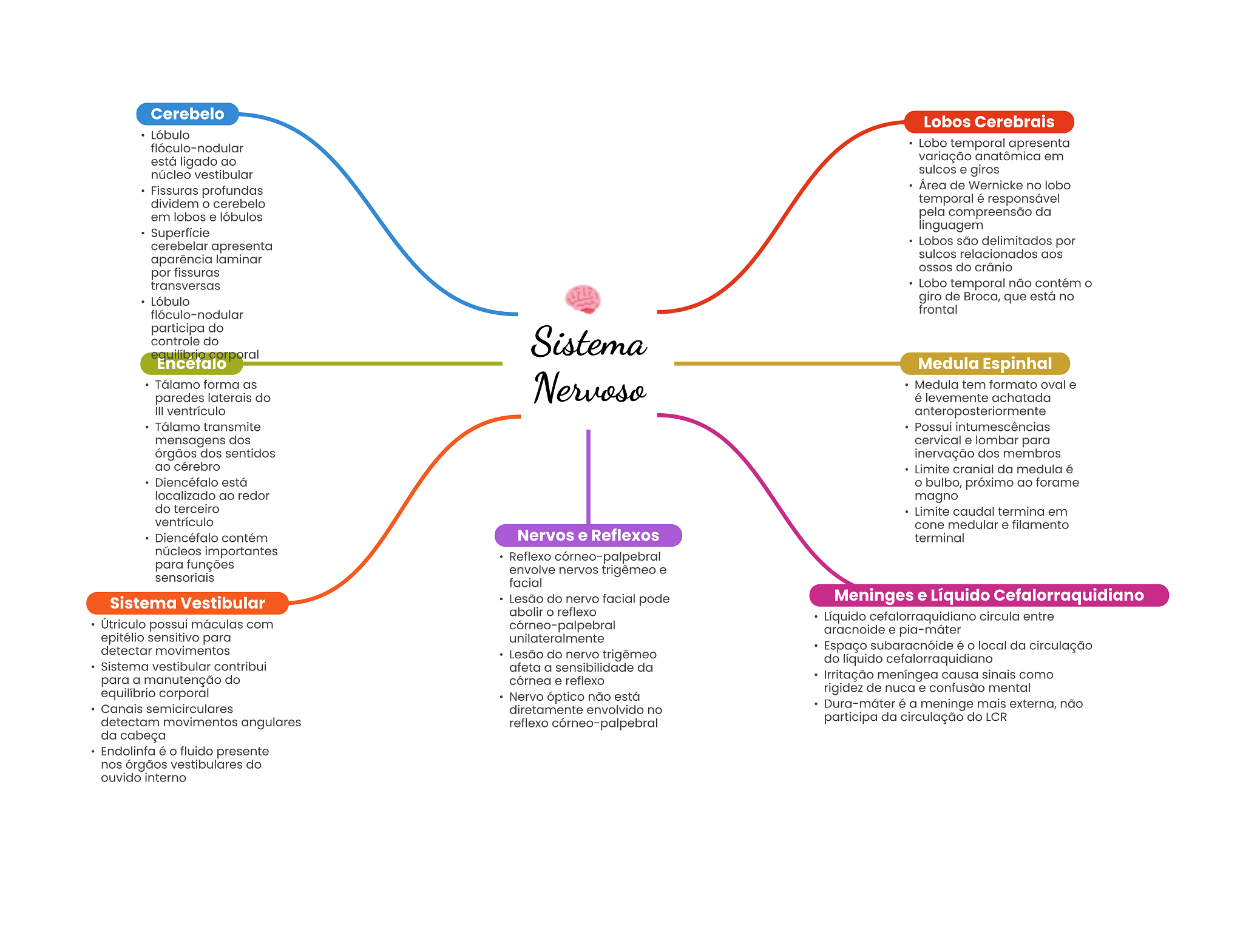 Cerebelo Lobos Cerebrais Lóbulo flóculo-nodular Lobo temporal apresenta está ligado ao variação anatômica em núcleo vestibular sulcos e giros Área de Wernicke no lobo Fissuras profundas dividem cerebelo temporal é responsável em lobos e lóbulos pela compreensão da linguagem Superfície cerebelar apresenta Lobos são delimitados por aparência laminar sulcos relacionados aos do crânio por fissuras transversas Lobo temporal não contém Lóbulo giro de Broca, que está no flóculo-nodular frontal participa do controle do Sistema equilíbrio Encéfalo corporal Medula Espinhal Tálamo forma as paredes laterais do Nervoso Medula tem formato oval e é levemente achatada III ventrículo anteroposteriormente Tálamo transmite Possui intumescências mensagens dos cervical e lombar para órgãos dos sentidos inervação dos membros ao cérebro Limite cranial da medula é Diencéfalo está bulbo, próximo ao forame localizado ao redor magno do terceiro Limite caudal termina em ventrículo cone medular e filamento Diencéfalo contém Nervos e Reflexos terminal núcleos importantes Reflexo córneo-palpebral para funções envolve nervos trigêmeo e sensoriais facial Sistema Vestibular Lesão do nervo facial pode Meninges e Líquido Cefalorraquidiano abolir reflexo Útriculo possui máculas com Líquido cefalorraquidiano circula entre córneo-palpebral aracnoide e pia-máter epitélio sensitivo para unilateralmente detectar movimentos Espaço subaracnóide é local da circulação Lesão do nervo trigêmeo do líquido cefalorraquidiano Sistema vestibular contribui afeta a sensibilidade da para a manutenção do córnea e reflexo Irritação meníngea causa sinais como equilíbrio corporal rigidez de nuca e confusão mental Nervo óptico não está Canais semicirculares diretamente envolvido no Dura-máter é a meninge mais externa, não detectam movimentos angulares reflexo córneo-palpebral participa da circulação do LCR da cabeça Endolinfa é fluido presente nos órgãos vestibulares do ouvido interno